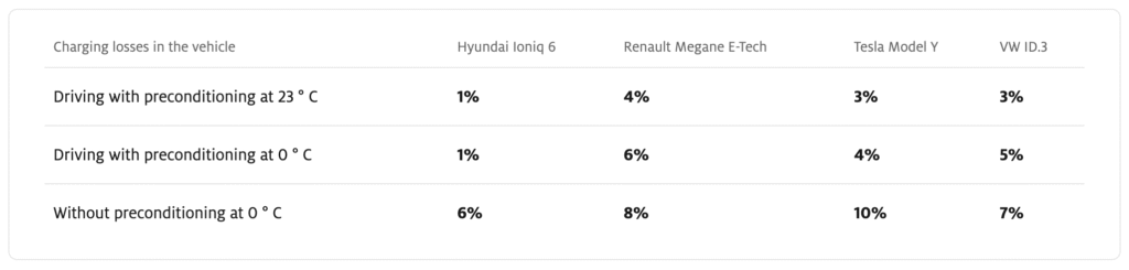 Pierderile cauzate de transformarea AC-DC au fost, în medie, de 3%, iar încălzirea bateriei la stația de încărcare a adăugat pierderi de la 2 la 8% (în funcție de model). Un aspect de luat în calcul este acela că cu cât încarci mai multă energie, cu atât mai puțin contează procentul pierderilor pentru încălzirea inițială a bateriei. Practic, dacă mergi la un DC pentru a adăuga 20% în baterie, ponderea pierderilor cauzate de managementul termic este mai mare decât în cazul în care mergi și încarci, de exemplu, 60, 70, 80%.