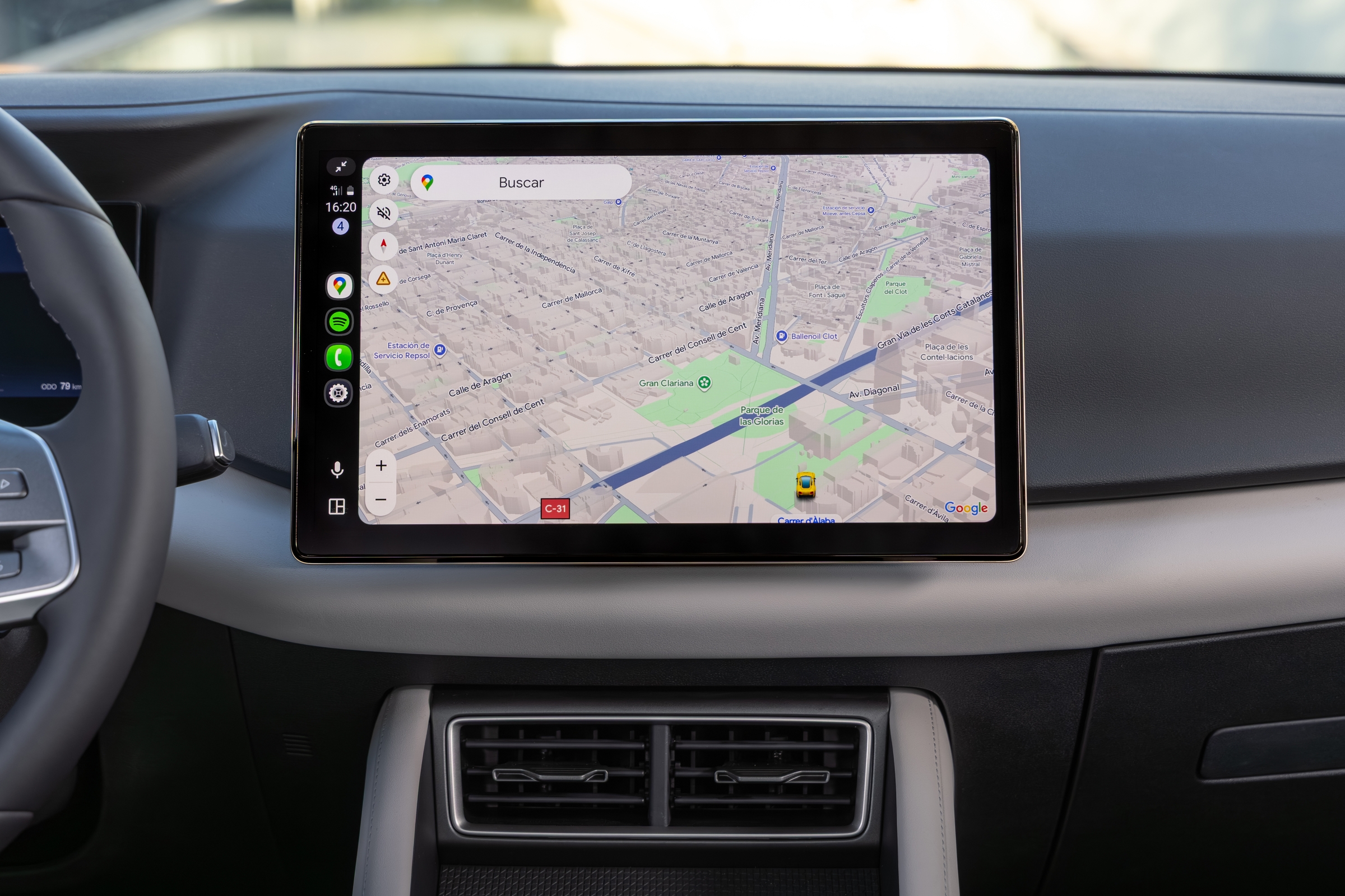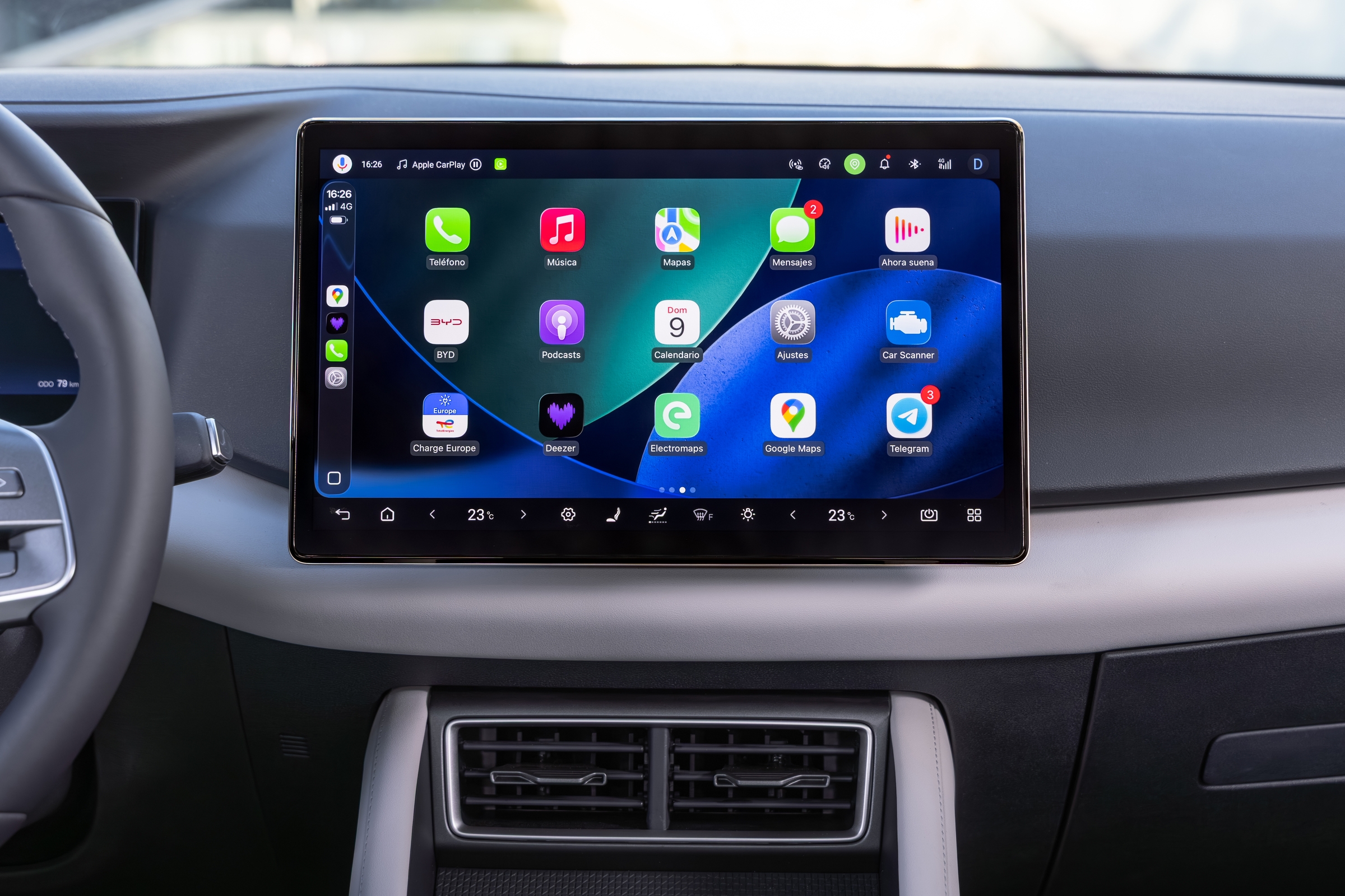 La interior, desenul planșei de bord este în linie cu restul modelelor din gamă. În spatele volanului avem un display cu diagonala de 8.8 inch, dar care acum este integrat elegant în planșa de bord. Central, avem un display care deservește sistemul de infotainment cu o diagonală de 12.3 inch. Comparativ cu versiunile electrice ale lui Atto 2, în cazul versiunii PHEV acest ecran este fix și poziționat lanscape (nu mai poate fi rotit în poziția portret).