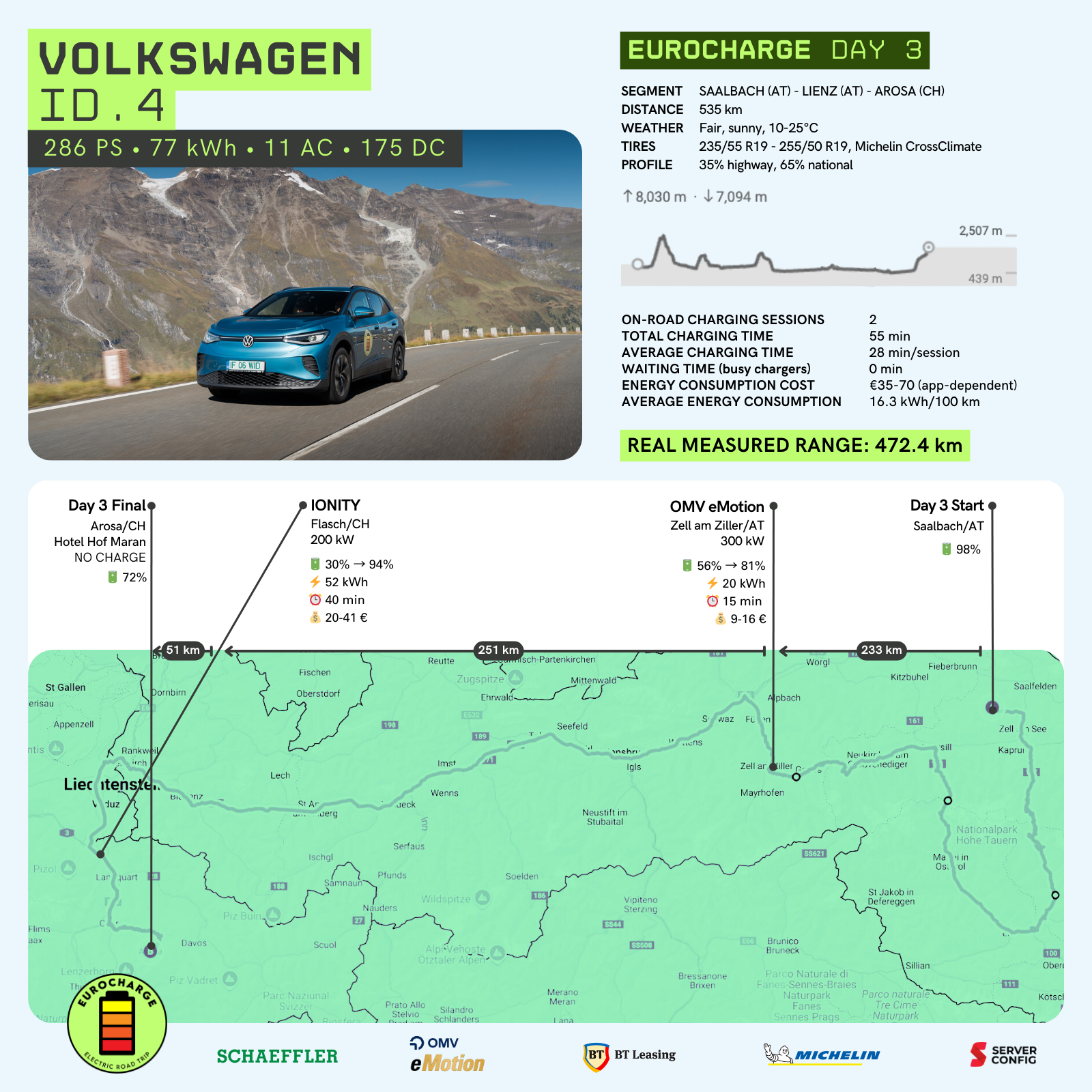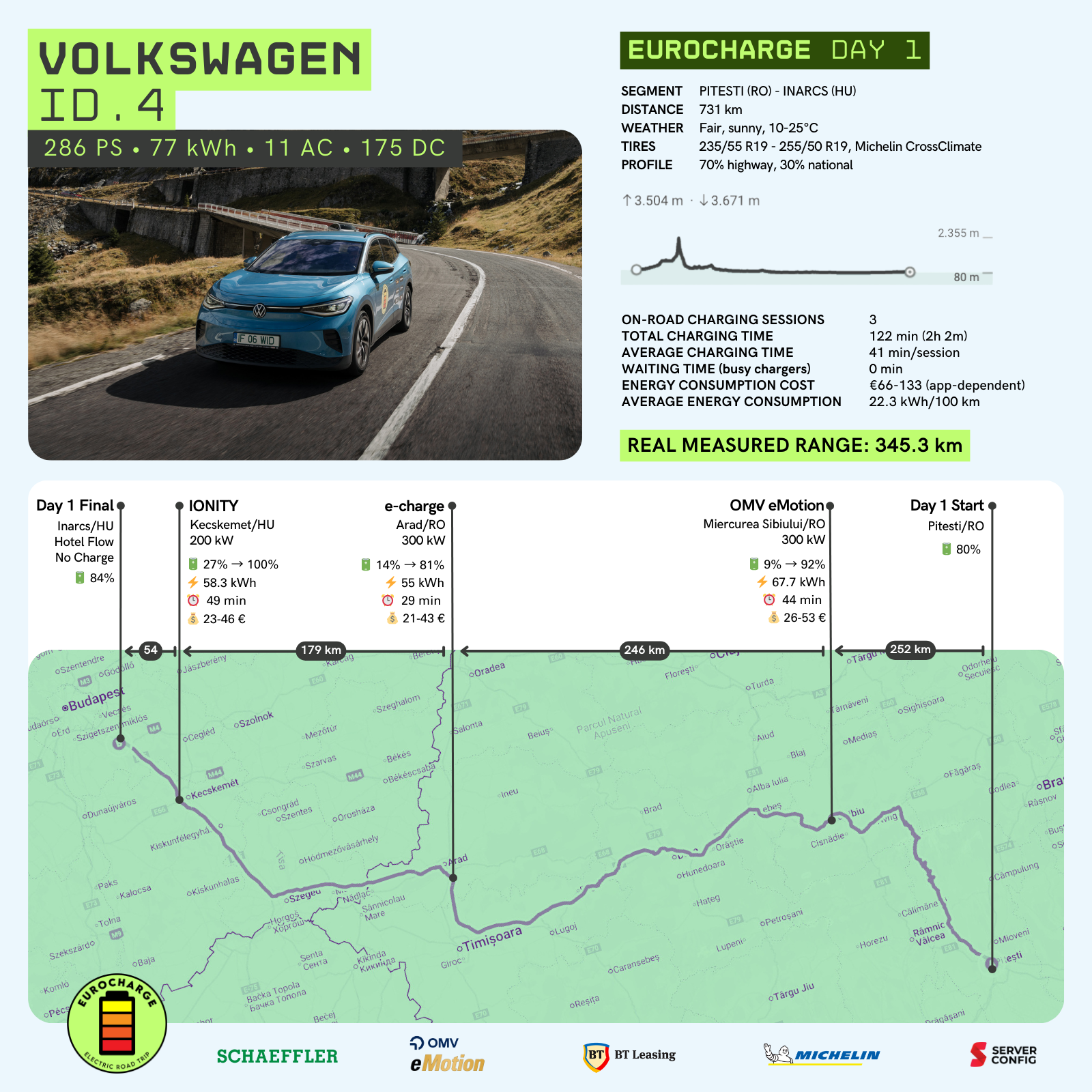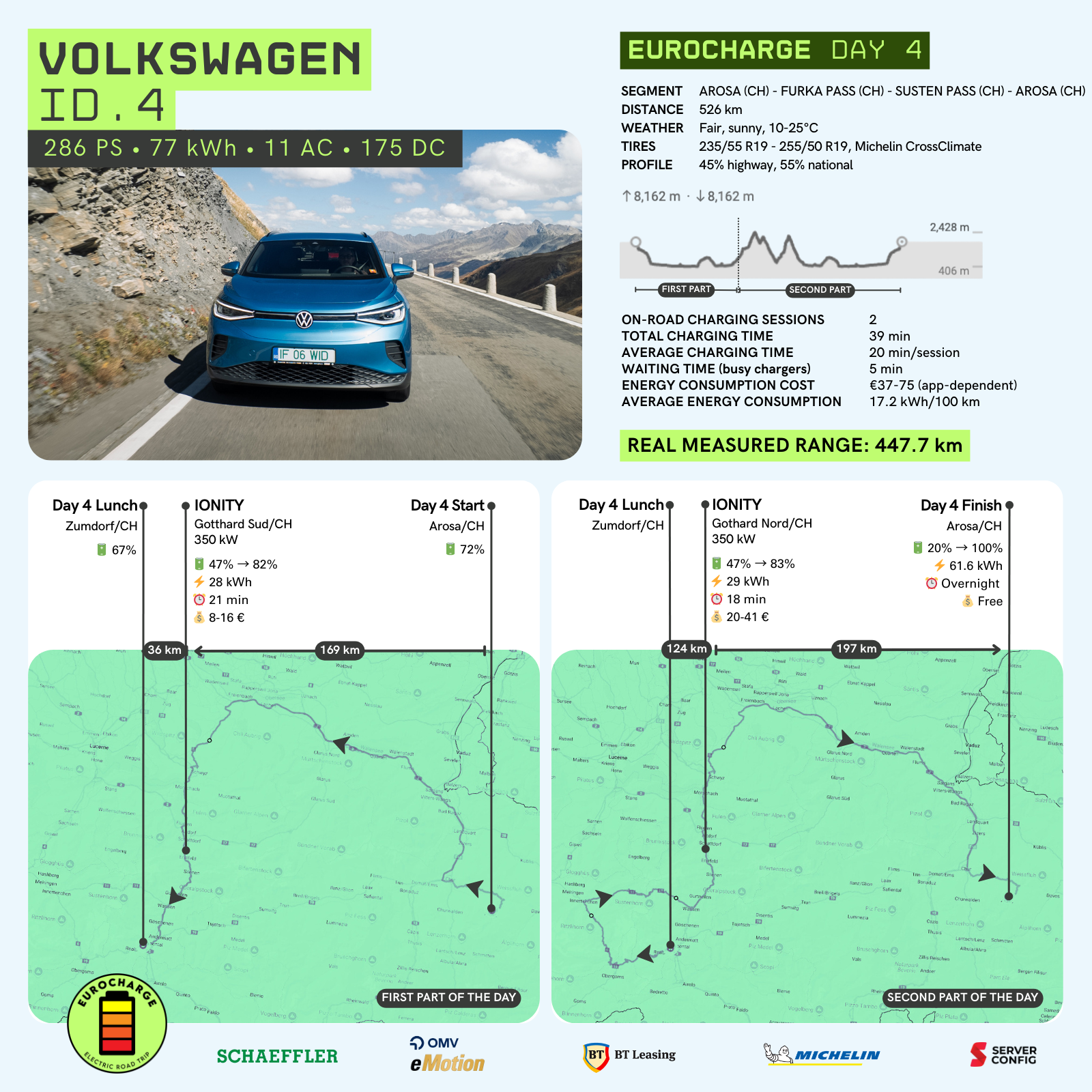 With such values, the Volkswagen ID.4 covered effortlessly the almost 5,000 kilometers of the road trip through the Alps. It has also achieved real range values close to the official figure while energy consumption was decent for its the market segment. We’ve compiled a set of infographics and hard data on range and consumption below.