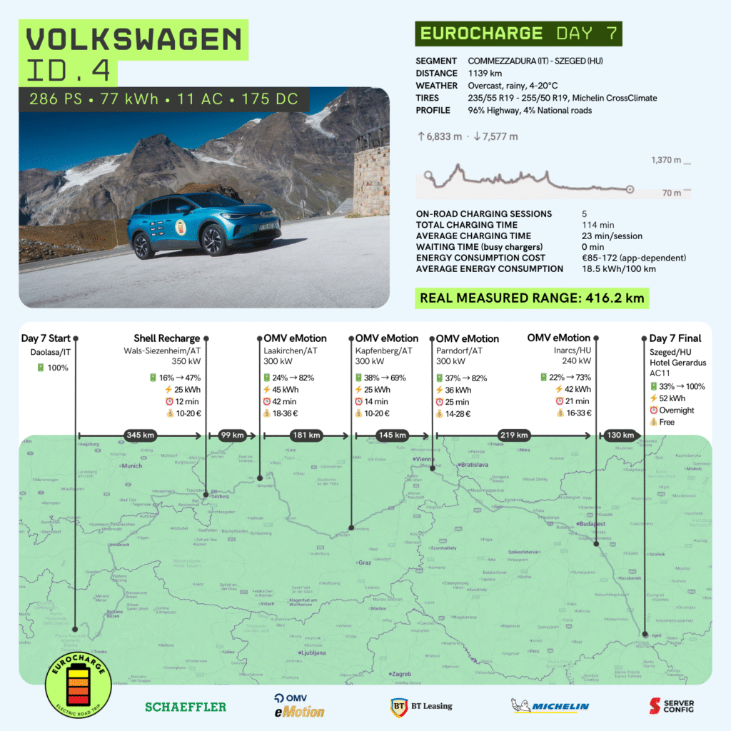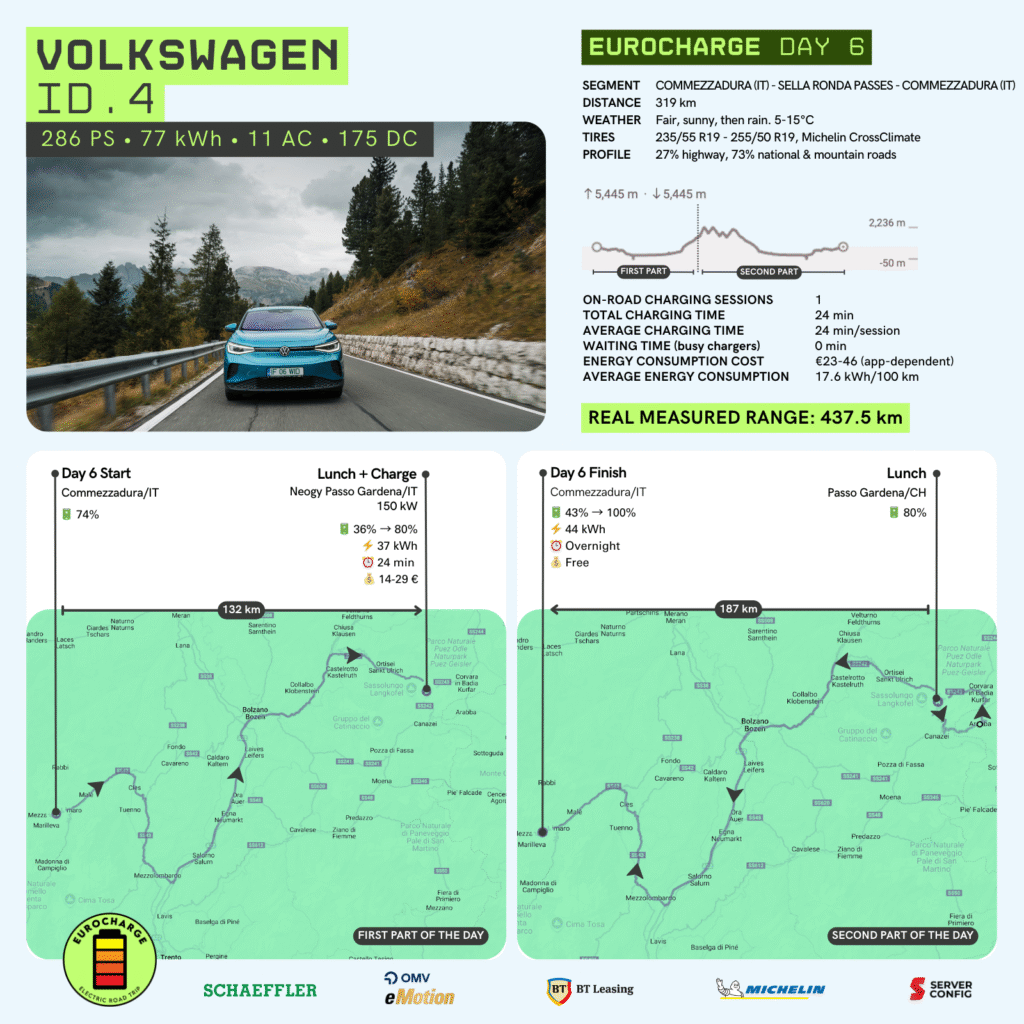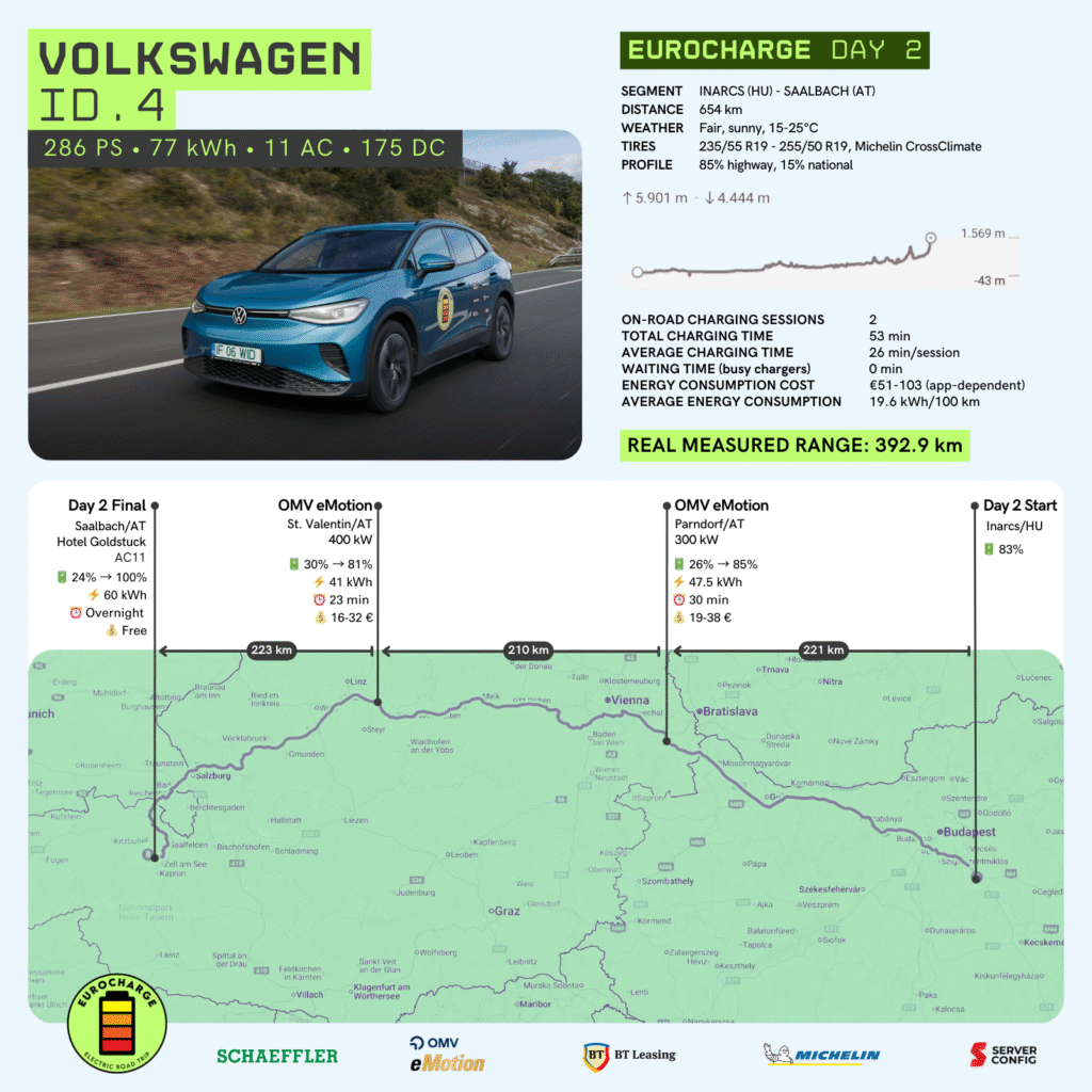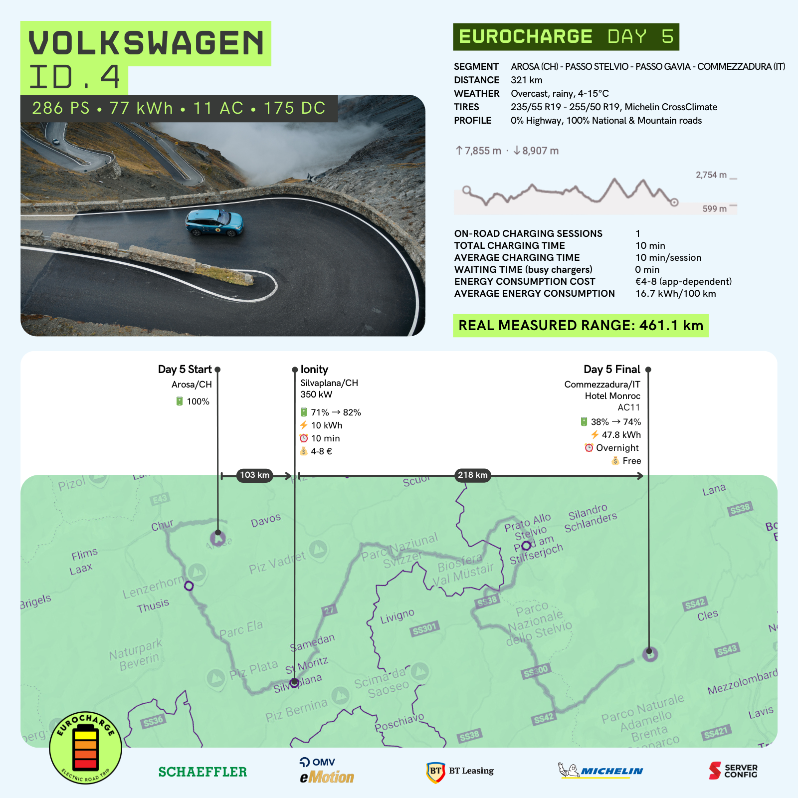 With such values, the Volkswagen ID.4 covered effortlessly the almost 5,000 kilometers of the road trip through the Alps. It has also achieved real range values close to the official figure while energy consumption was decent for its the market segment. We’ve compiled a set of infographics and hard data on range and consumption below.