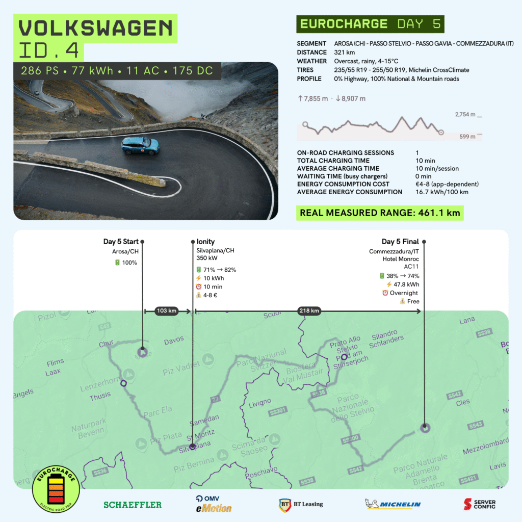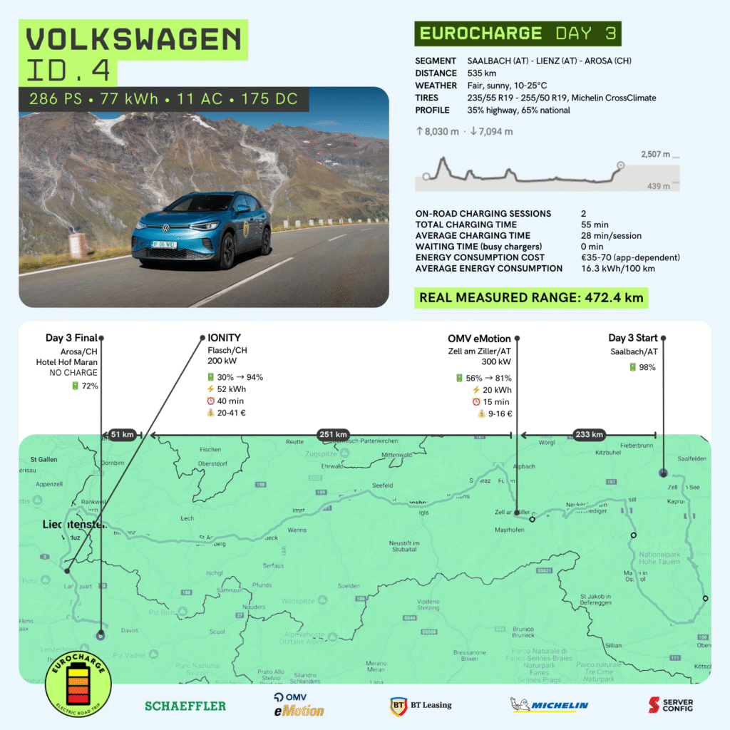 The version we tested intensively through the Alps in EUROCHARGE by Schaeffler, the ID.4 was equipped with a 286-hp electric motor. The official WLTP range is 550 kilometers, achieved via a Li-Ion battery with a net capacity of 77 kWh that charges at up to 175 kW.