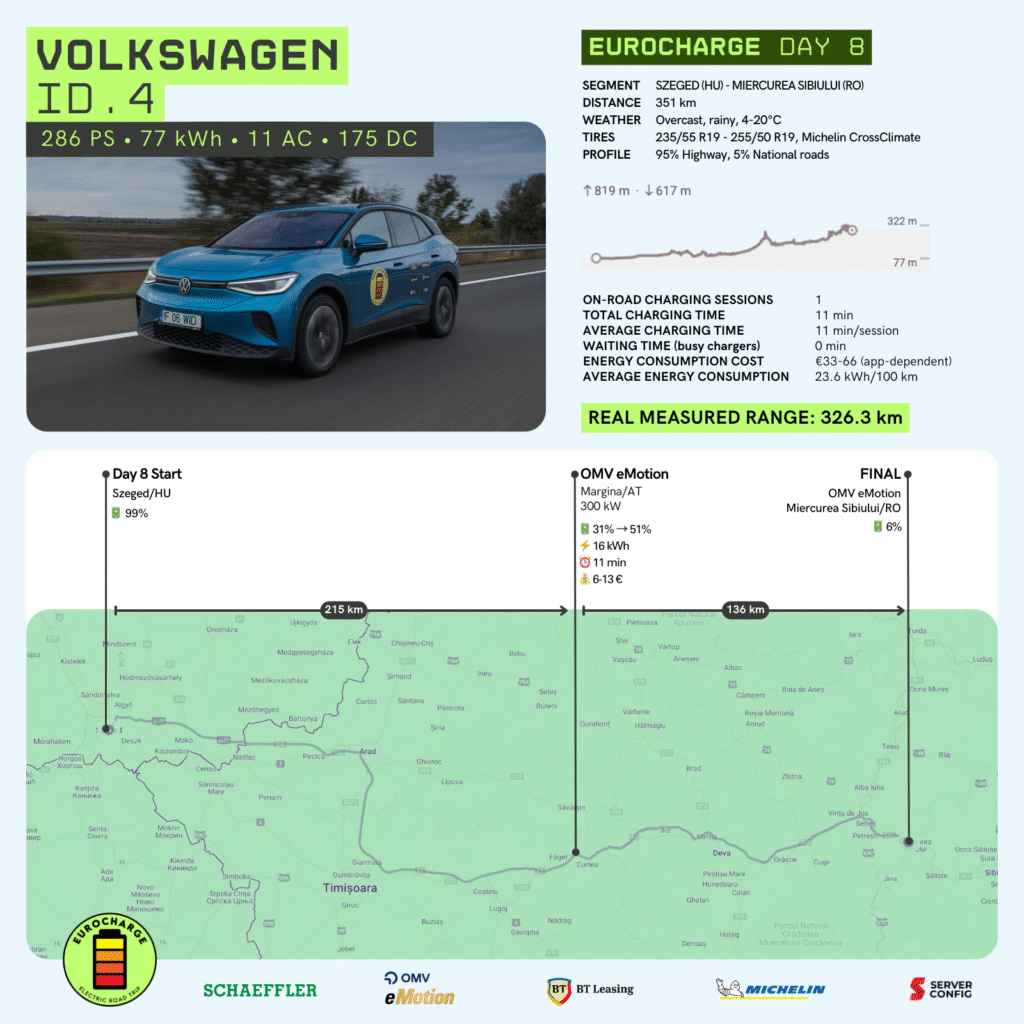 Not even the clear-sky color of the ID.4 could erase the sad feeling of the end of the EUROCHARGE 2025 adventure. I drove the ID.4 on the longest segment of the tour, Commezzadura – Szeget, so my impressions are more about the behavior on the highway (with a lot of stretches under construction), where I felt the support, through the assistance systems and the dynamics of the car.