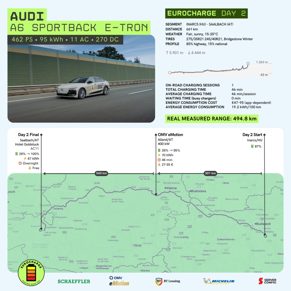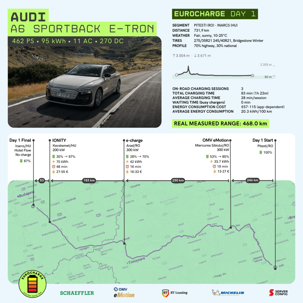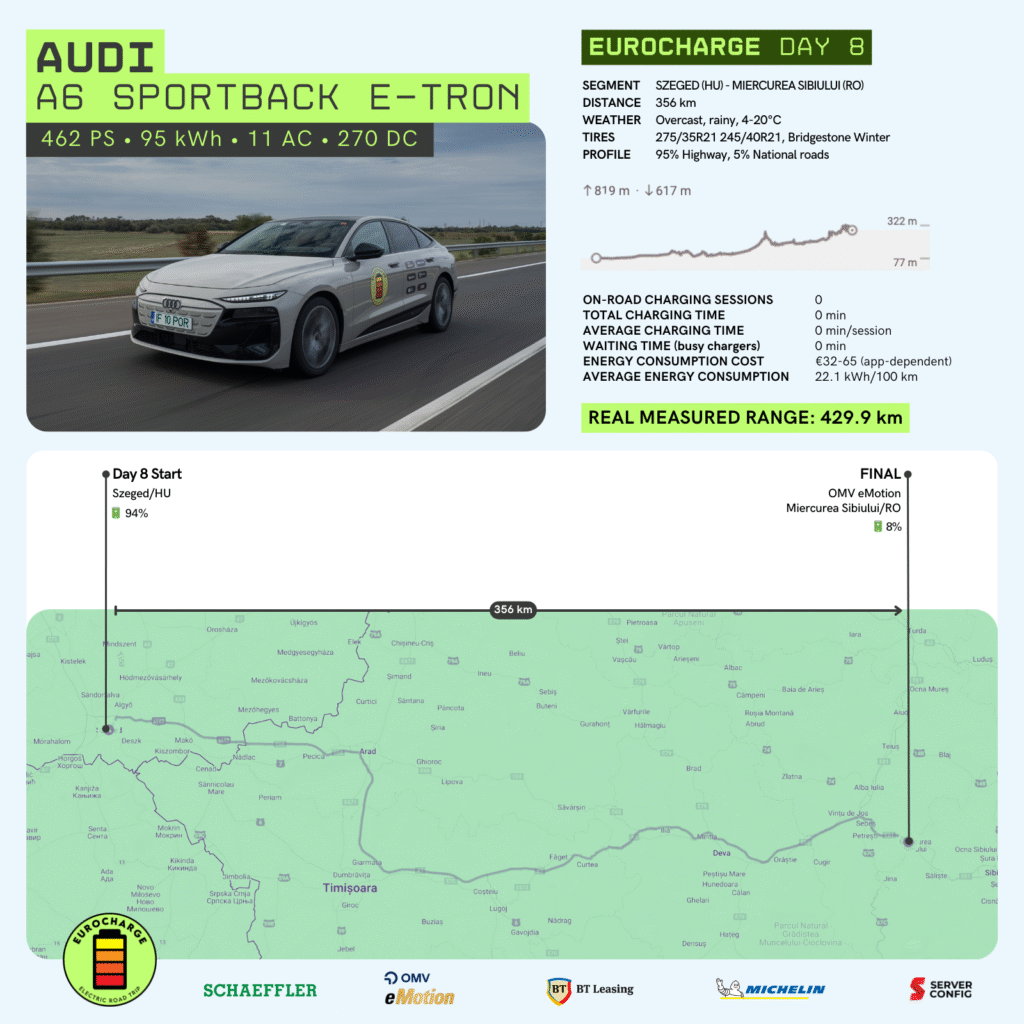 Nici că se putea mai bine pentru echipajul nostru altfel decât să încheiem EUROCHARGE la volanul lui Audi A6 e-tron. Mai corect, ultima zi până la revenirea în țară, însă cea mai lungă și mai solicitantă atât pentru mașină cât și pentru noi. De asta m-am bucurat, pentru că am călătorit în ritm de GT. De fapt, performanțe dinamice de Gran Turismo, ținută de drum de automobil executive, interesantă combinație.