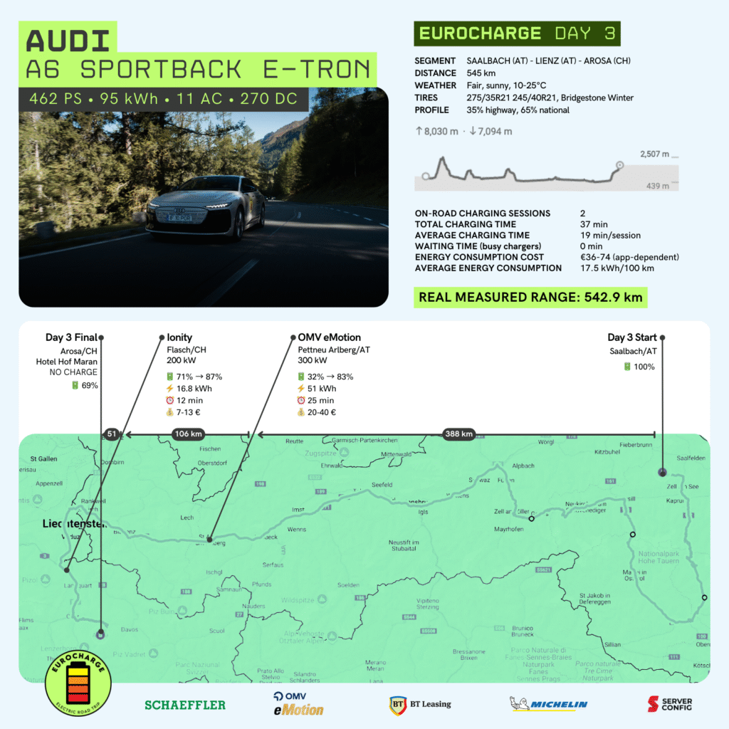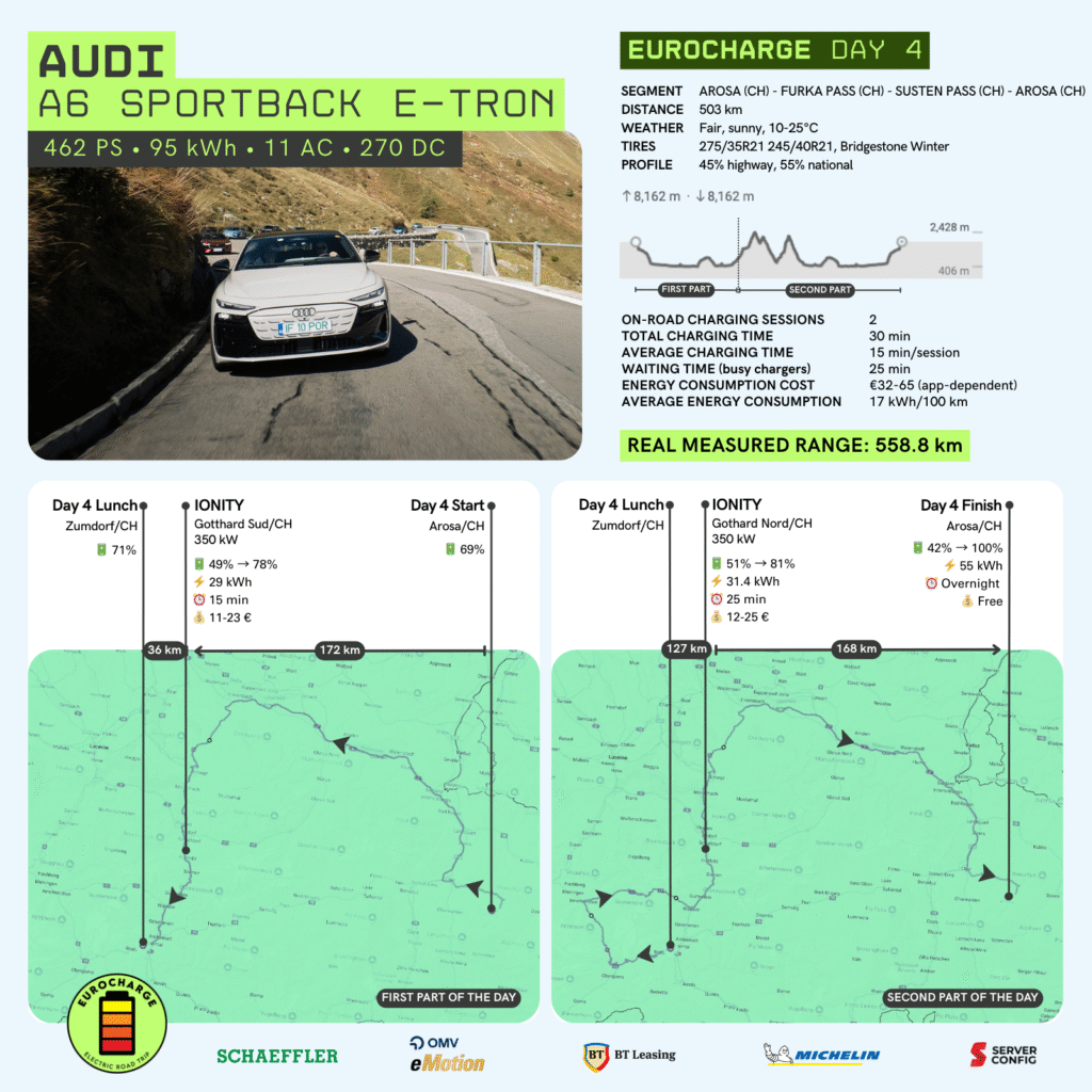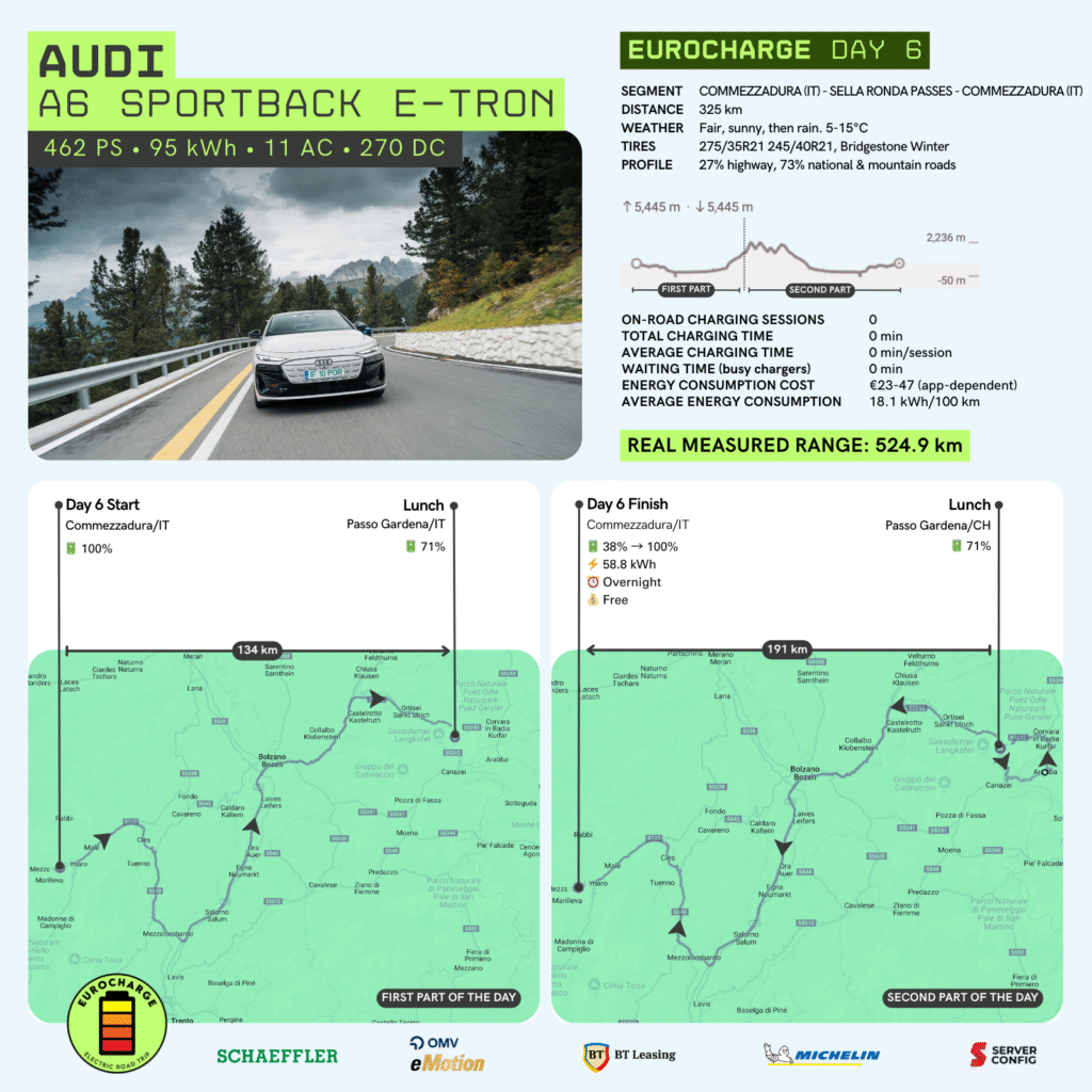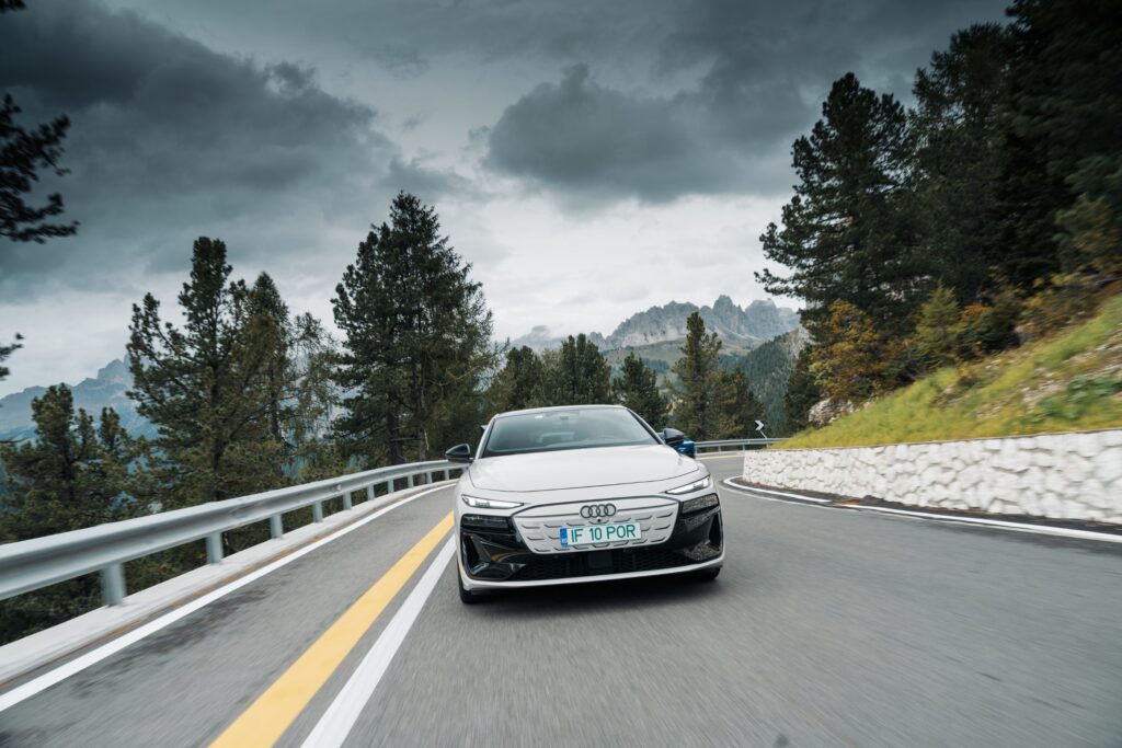 Modelul german a fost parte din caravana EUROCHARGE by Schaeffler, turul în care am traversat cele mai interesante trecători montane din Alpi. S-au adunat peste 4.500 de kilometri în care am testat cum se descurcă A6 Sportback e-tron atât pe autostrăzi (fie ele și doldora de lucrări; Salut, Ungaria! Salut, Austria!), dar, cum spuneam și un rând mai sus, și pe pasurile care au afișat cu lejeritate valori de înălțime de peste 2.000 de metri.