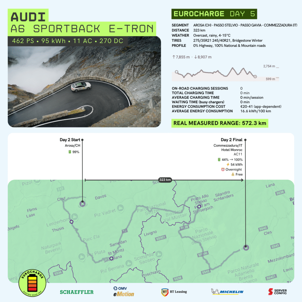 Azi, în prima zi ploioasă a Turului nostru cu electrice prin Alpi, am vrut să vedem dacă Audi A6 Sportback e-tron e doar un costum scump sau dacă are și mușchi pe sub el. L-am scos la o plimbare de 323 de kilometri fezandându-l pe un meniu cu cinci feluri de pasuri alpine din Elveția și Italia: Julier, Ofenpass, Tonale, Gavia și, piesa de rezistență, the Mighty Stelvio.