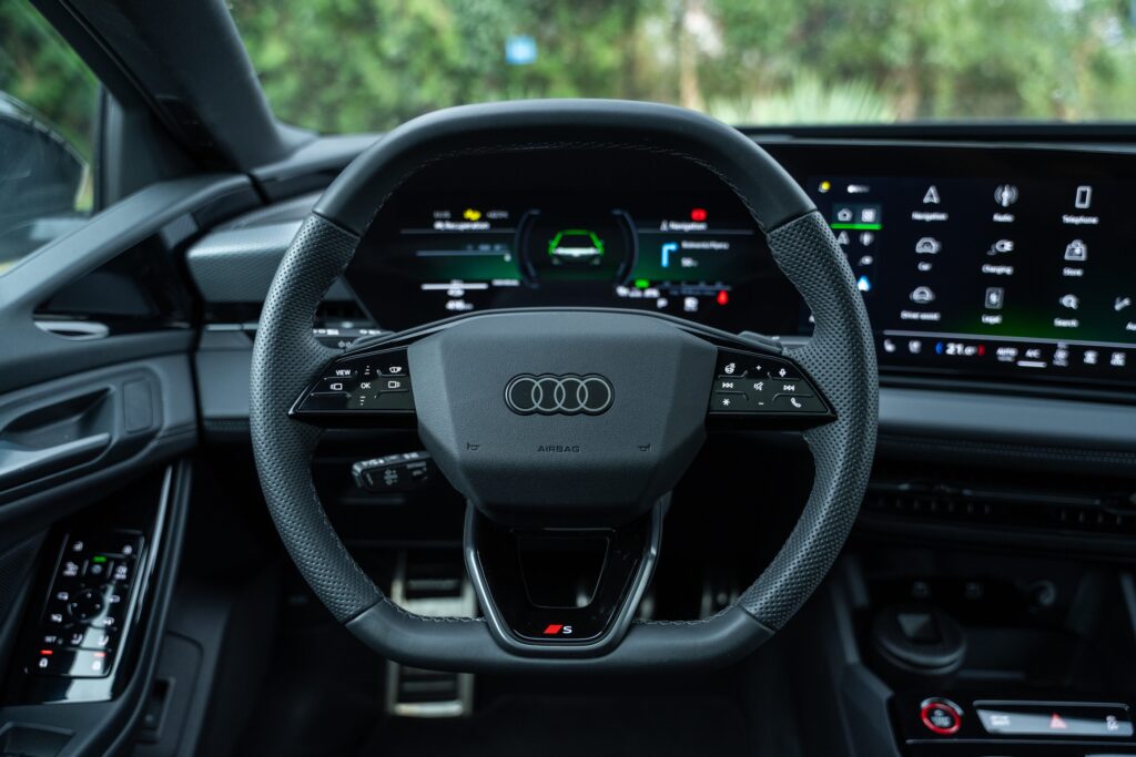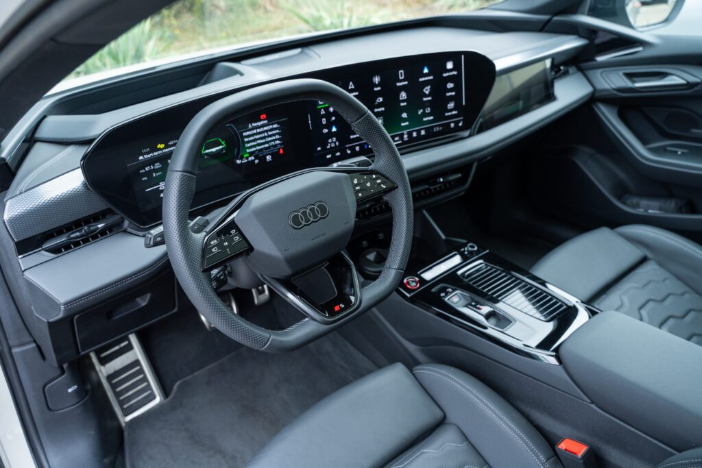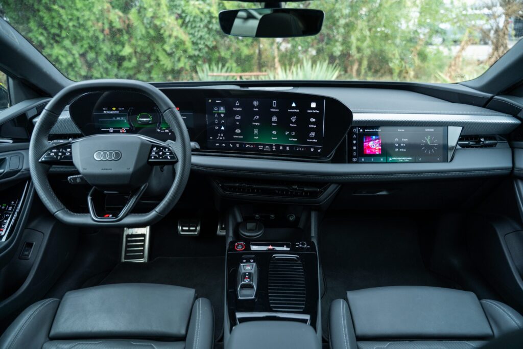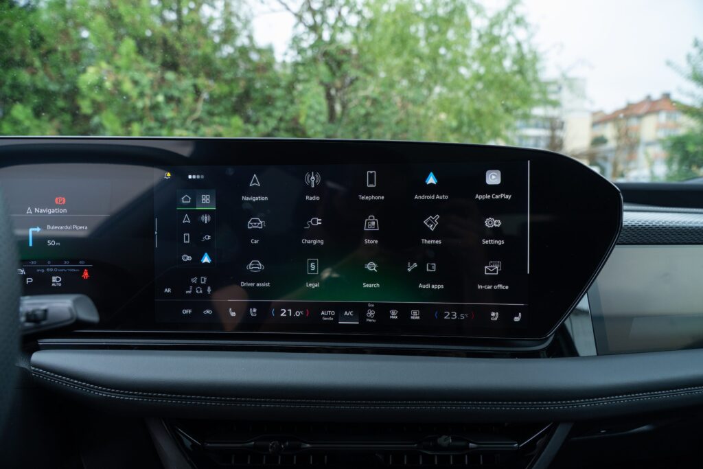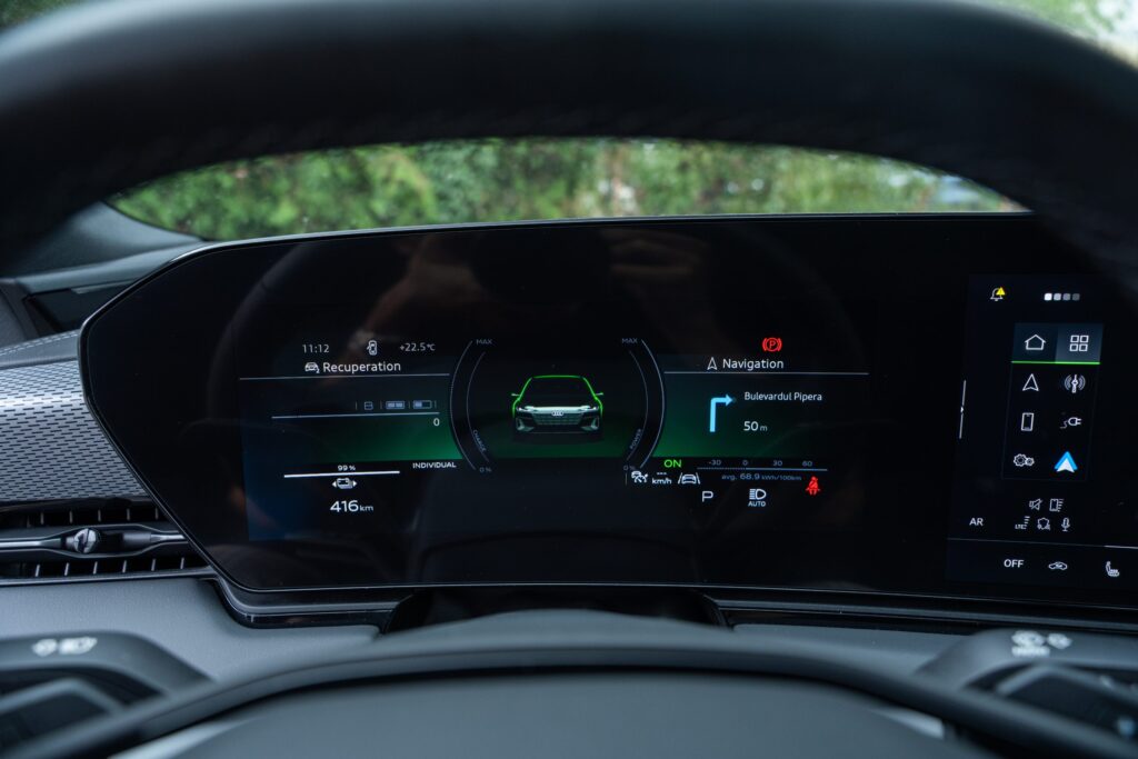 În plus, fiind o limuzină (fie ea și cu hayon) de la Audi, sistemele de asistență sunt foarte evoluate și impecabile în funcționalitate. Pe autostrada (și nu numai), A6 e-tron se conduce semiautonom și oferă numeroase informații prin head up display-ul cu realitate augmentată. Confortul la rulare este, de asemenea, impresionant, modelul testat fiind echipat cu suspensie pneumatică, iar buna antifonare și aerodinamica excepțională fac zgomotul de rulare extrem de redus. Și-ar mai fi de amintit și cei 462 CP ai acestei versiuni quattro, care la o apăsare mai amplă a pedalei de accelerație, fac această barjă de 2,3 tone să accelereze exploziv. Dar orice electrică, chiar și cele mai accesibile se simt rapide. Însă altele sunt detaliile care fac diferența la acest sedan german premium.