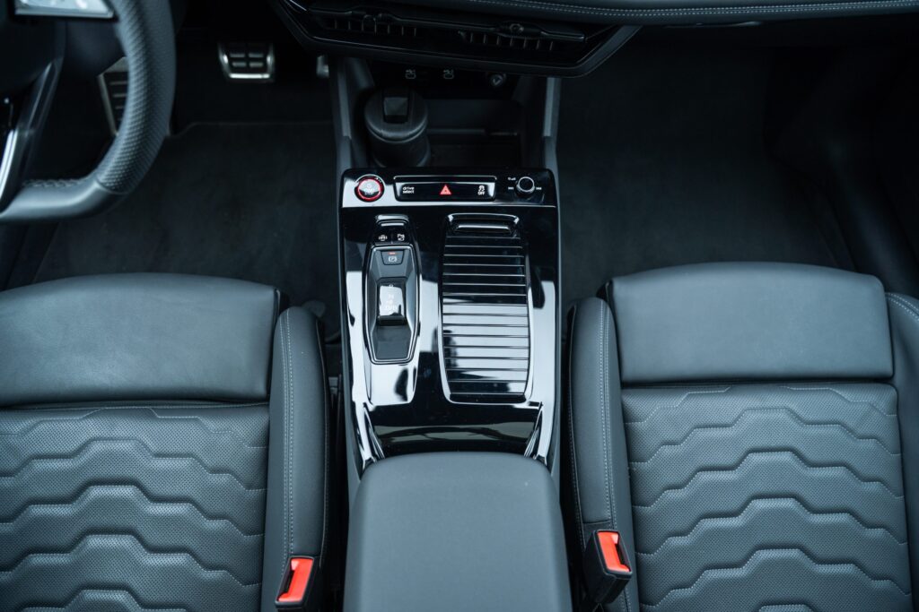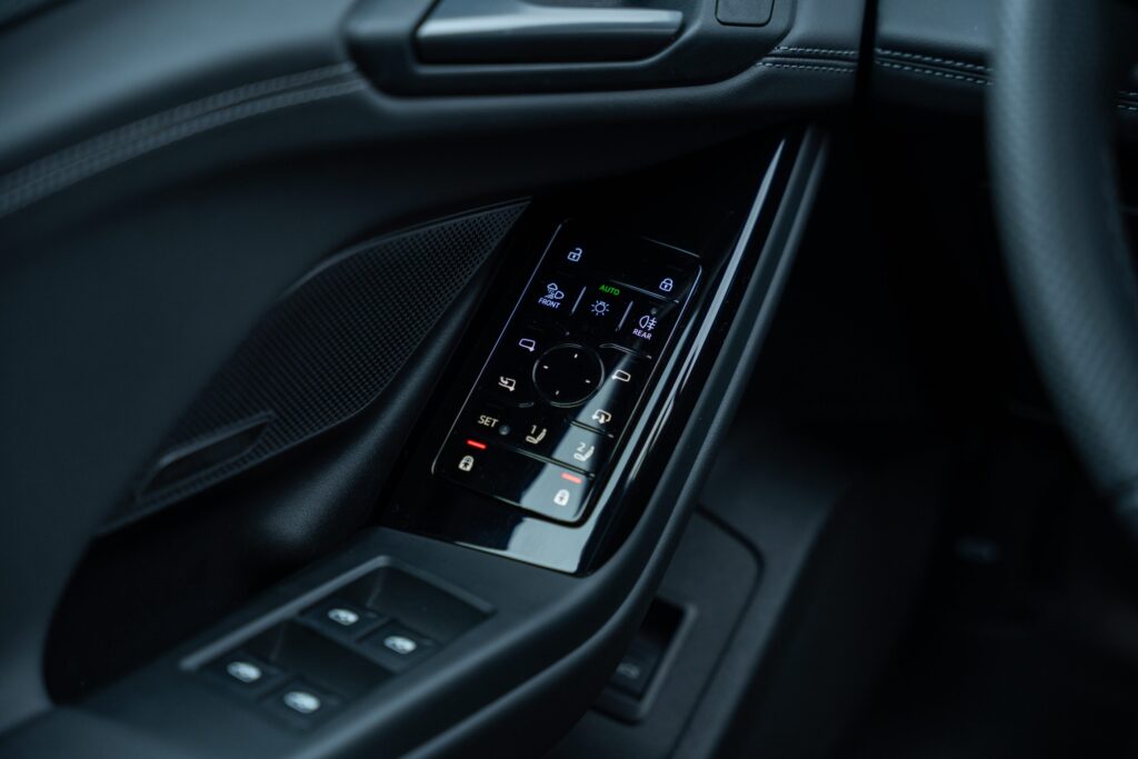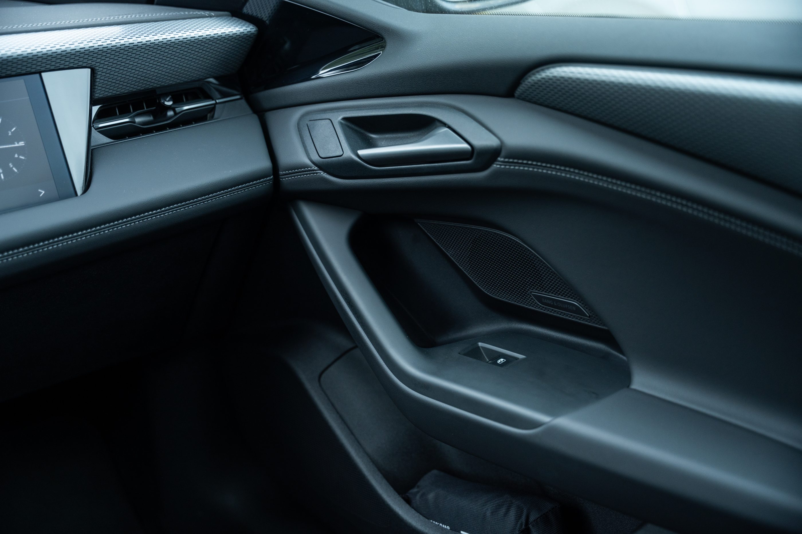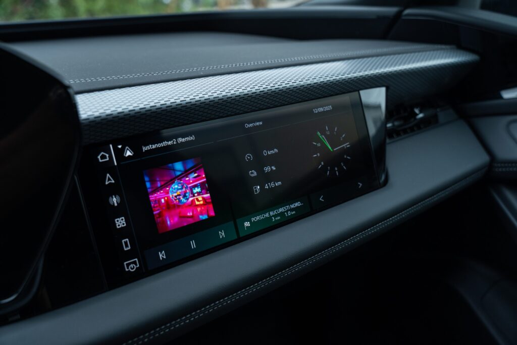 La interior, îți oferă probabil cel mai premium sentiment din tot turul nostru cu electricele prin Alpi. Materiale, asamblare, atenție la detalii – totul e la superlativ. Scaunele sunt fabulos de confortabile, iar sistemul multimedia, deși pare stufos la început, e de fapt ridicol de intuitiv. Singura enigmă rămâne utilitatea ecranului din fața pasagerului. Vasilescu, copilotul de serviciu, l-a pornit, mi-a schimbat o melodie, s-a hăhăit satisfăcut de ispravă și apoi l-a închis. Util cât o umbrelă într-un submarin.