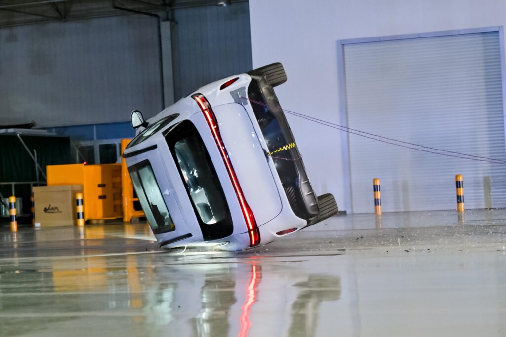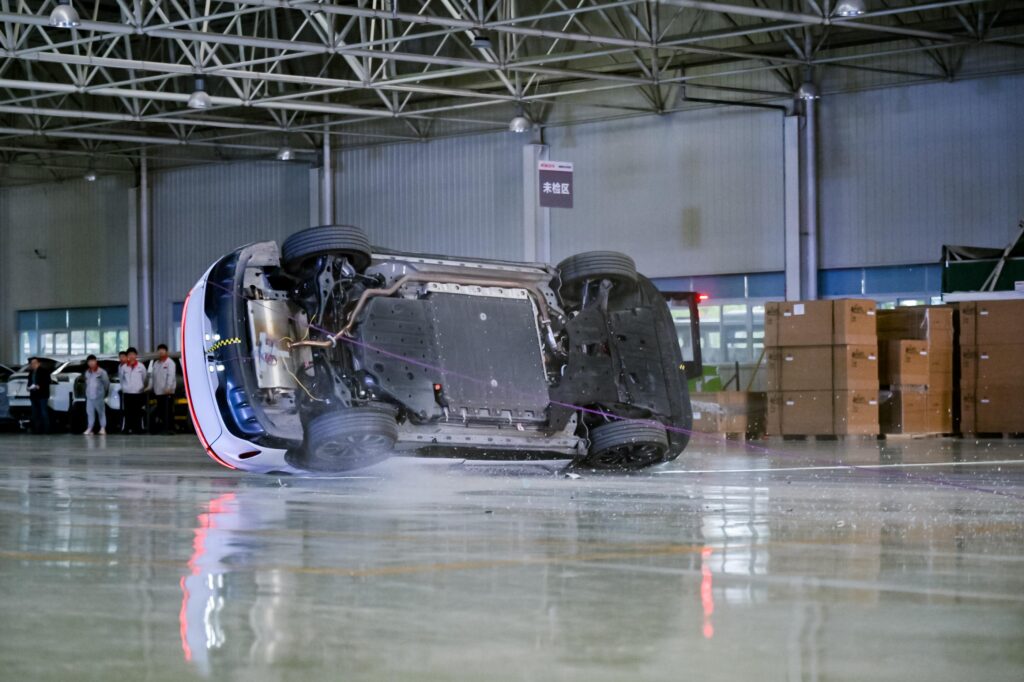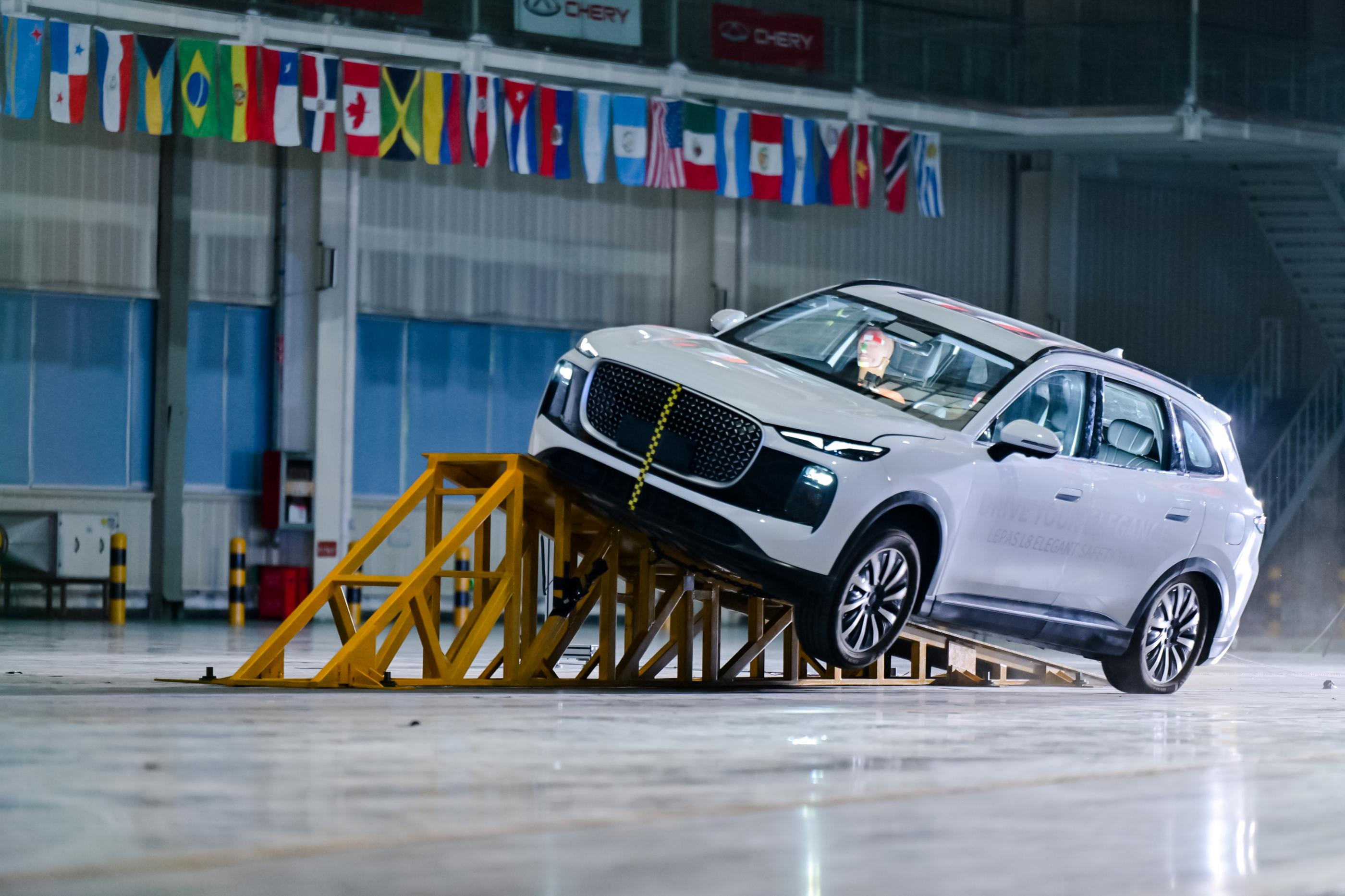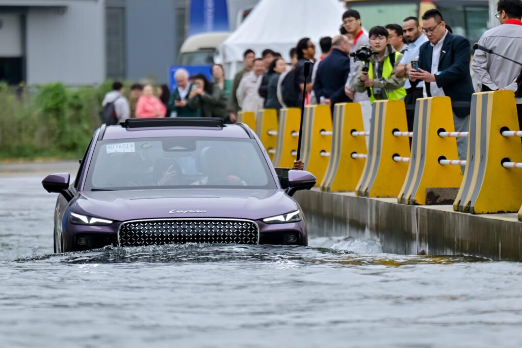 A doua sesiune de teste a fost dedicată modelului Lepas L8, vărul mai cizelat (dacă vrei să-l vezi așa) al lui Tiggo 8. De data asta n-a mai fost o ciocnire, ci alte trei teste: verificarea siguranței în cazul unei răsturnări (la 60 km/h), trecerea peste un obiect dur (la 30 km/h) și trecerea printr-un vad (600 mm). La fel ca prima dată, totul a fost o demonstrație, iar asta înseamnă că dincolo de ceva vizual ce aș fi putut observa (n-a fost cazul) n-aș avea ce să menționez.