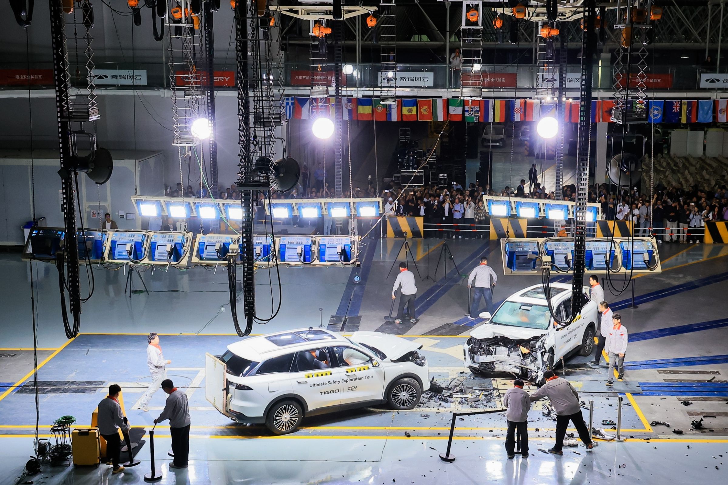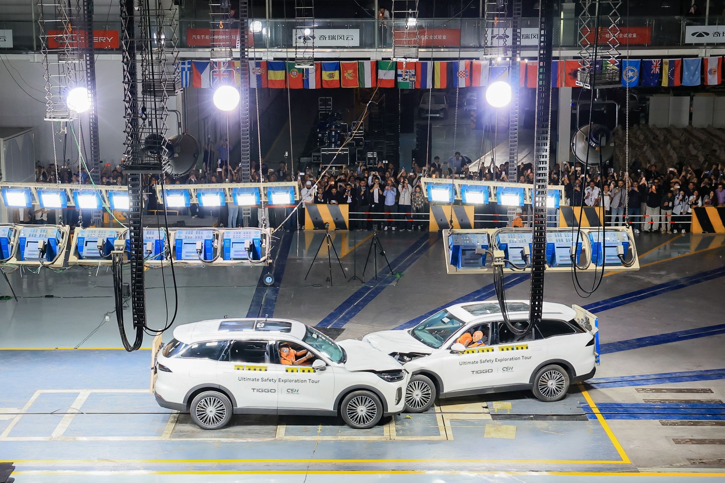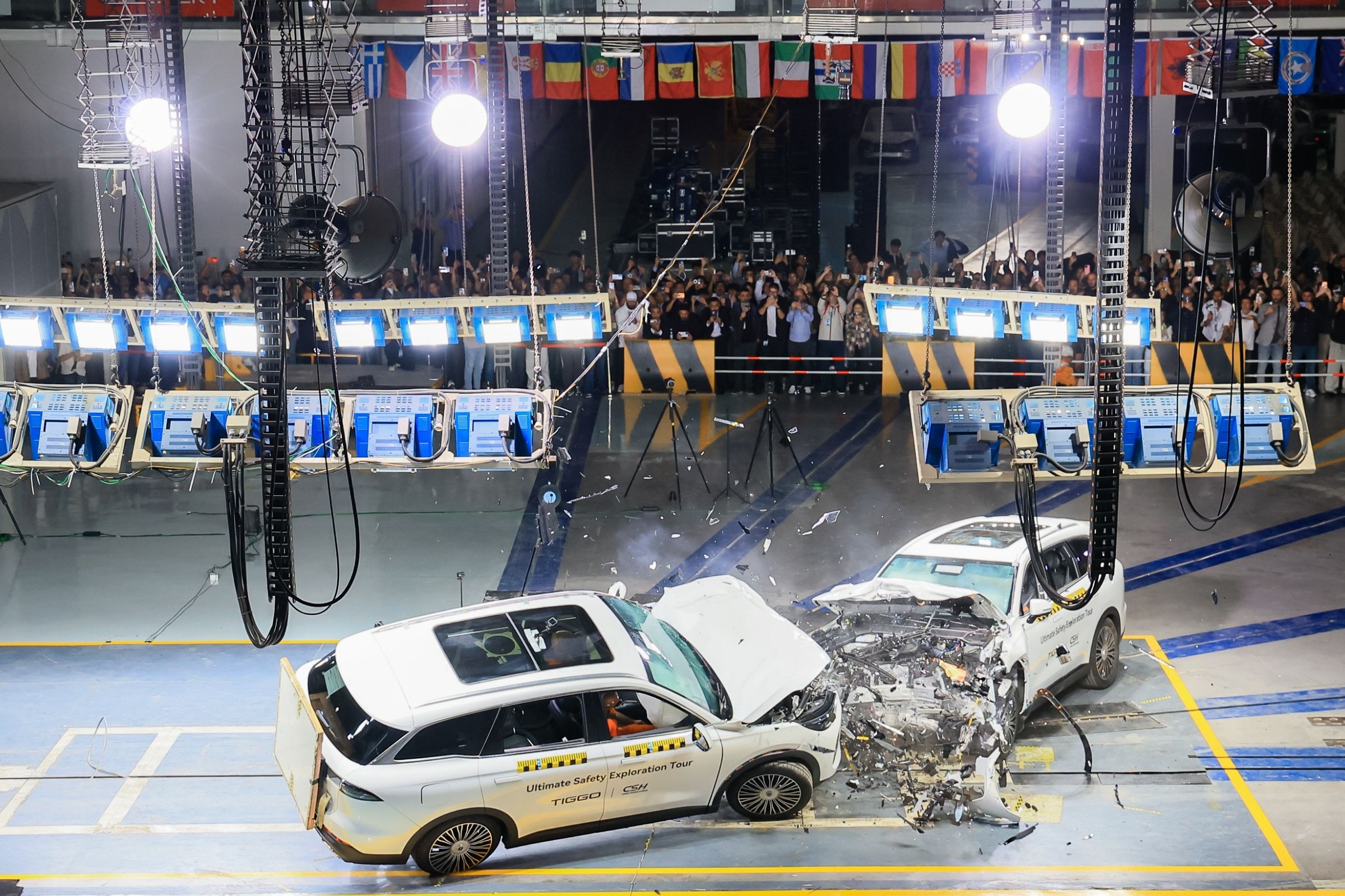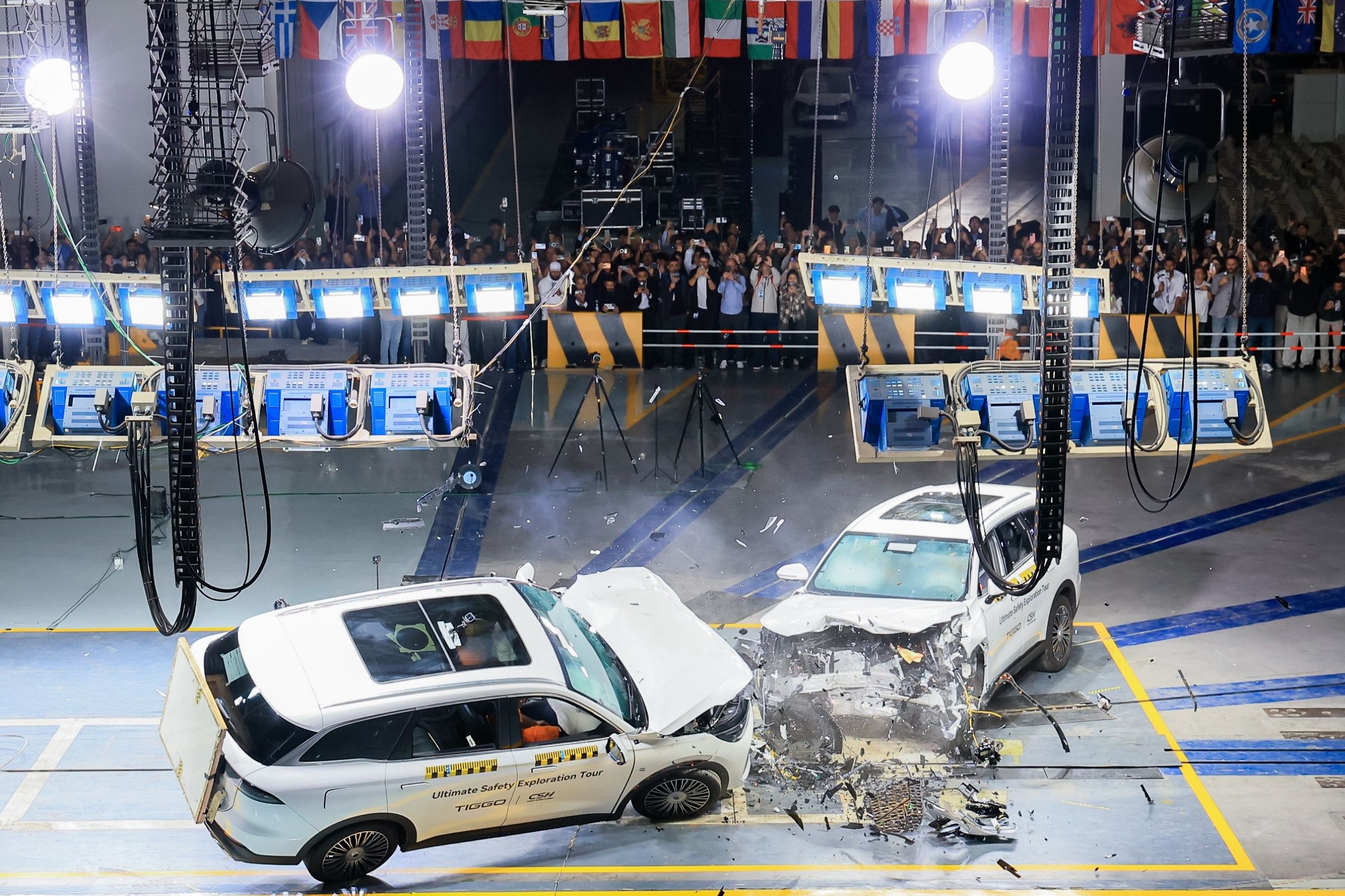 Intrăm în sală și de undeva din depărtare se aude o numărătoare inversă. Până să mă lămuresc cu privire la ce se întâmplă, mașinile deja au pornit una către cealaltă. Două exemplare Tiggo 9 (model pe care o să-l vezi curând – n-aș putea să pun mâna pe o dată din calendar și vă indic – și în showroom-urile Chery din România) sunt pe cale să dea nas în nas, la un unghi de 15 grade, cu o viteză, fiecare, de 50 km/h. E o demonstrație – și poți s-o privești fix așa până vin și rezultatele Euro NCAP – pe care chinezii o fac ca să arate că înainte să meargă la ușile organizațiilor care pun siguranța sub certificare proprie, mașinile lor sunt verificate și intern. Am mai spus-o de câteva ori că testele acestea sunt examene cu subiectele deja publicate. Constructorii au acces la tipurile de încercări la care vor fi supuse mașinile, prin urmare pot să vină cu fițuicile gata scrise.