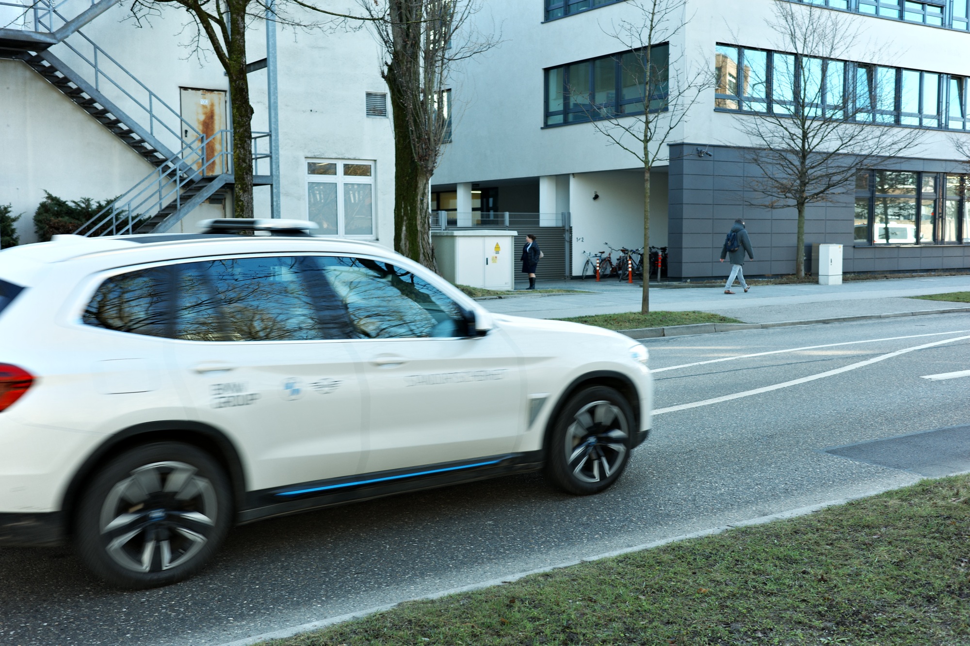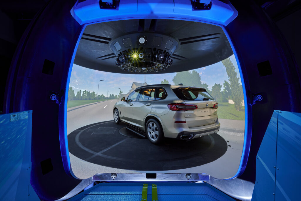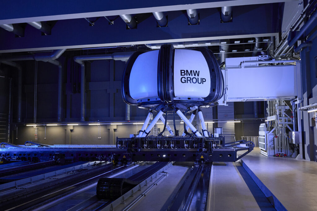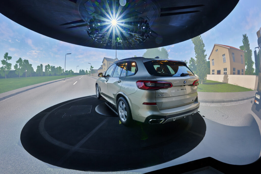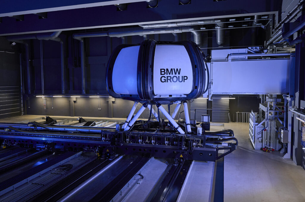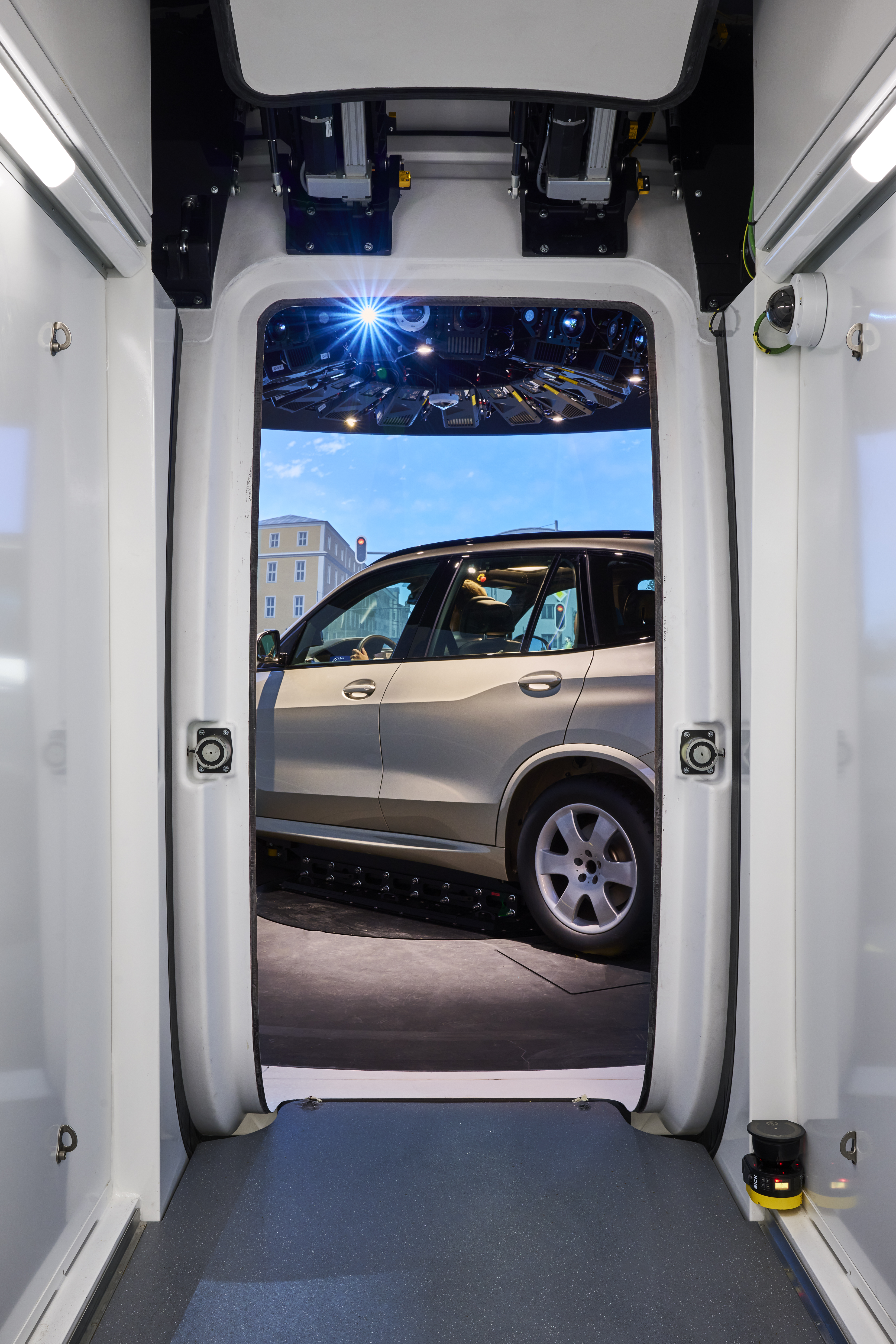 De pe hol fac dreapta pe un culoar îngust, care mă duce într-o cameră ovală. Sunt în interiorul hexapodului. În centru, o mașină. Cu roți, caroserie, interior și toate cele. Nu e nimic simplificat sau mimat din acest punct de vedere. La instrucțiunile tehnicienilor care se ocupă de simulator, mă așez în dreapta. Mi se spune să îmi pun centura, să închid portiera și să stau normal, ca și cum aș fi pasager într-o mașină adevărată, pe o autostradă adevărată. Mi se spune că programul va simula caracteristica dinamică a unui iX3. Apoi aud un „we are starting now!“ din exterior.