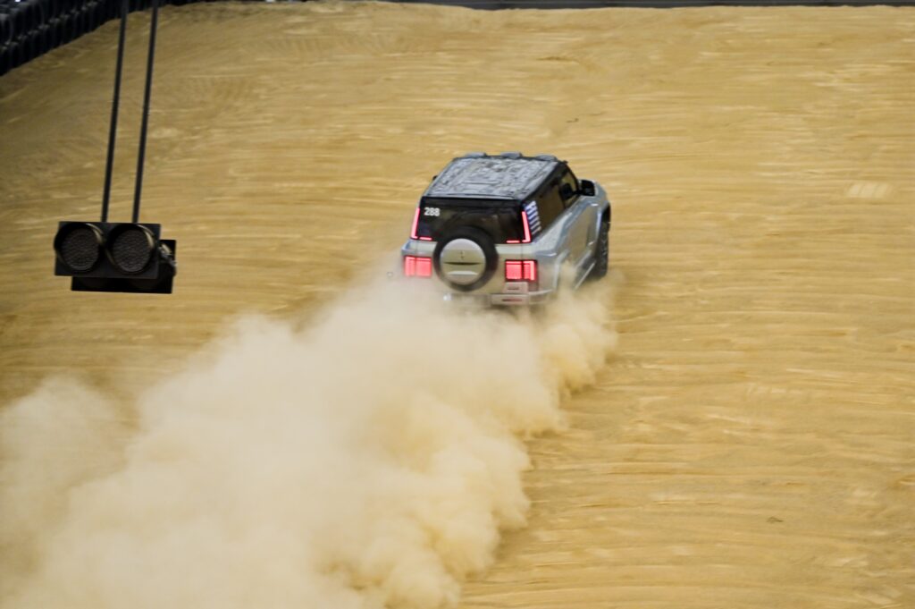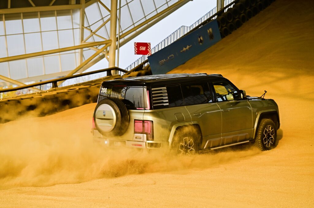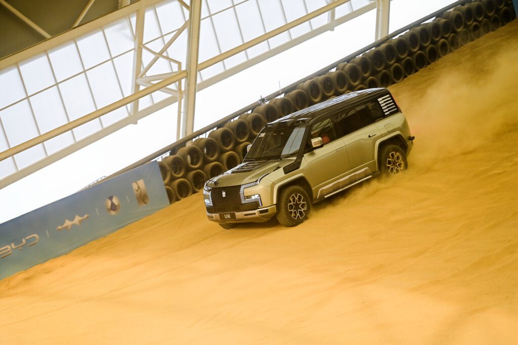 Una dintre cele mai interesante vizite pe care am bifat-o la centrul de testare BYD a fost la „pârtia” Sky Sand Slope, care simulează o dună de nisip cu o înclinație de 28 de grade și o înălțime de 40 de metri. Structura conține peste 6.000 de tone de nisip, stabilizat prin inovații brevetate – stabilizarea nisipului a necesitat 68 de runde de teste pentru găsirea mixului ideal. Yangwang U8 a demonstrat aici gestiunea tracțiunii pe nisip afânat, urcând rampa fără pierderea specifică de aderență a sistemelor off-road clasice.