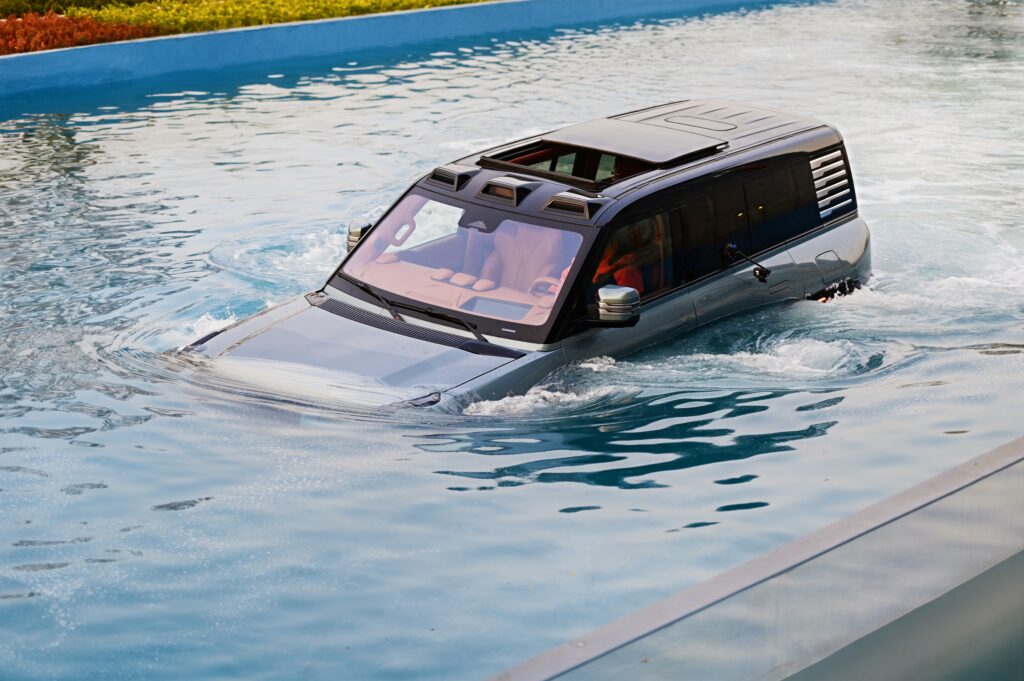Într-o piscină de 1,8 metri adâncime, SUV-ul a intrat în apă până când roțile au pierdut contactul cu solul. Senzorii au activat modul de navigare acvatică: suspensia s-a ridicat la maximum, prizele de aer s-au sigilat, geamurile laterale s-au închis automat, trapa s-a deschis automat (pentru a facilita ieșirea pasagerilor în siguranță), iar cele patru motoare au asigurat propulsia la suprafață cu o viteză de aproximativ 3 km/h.