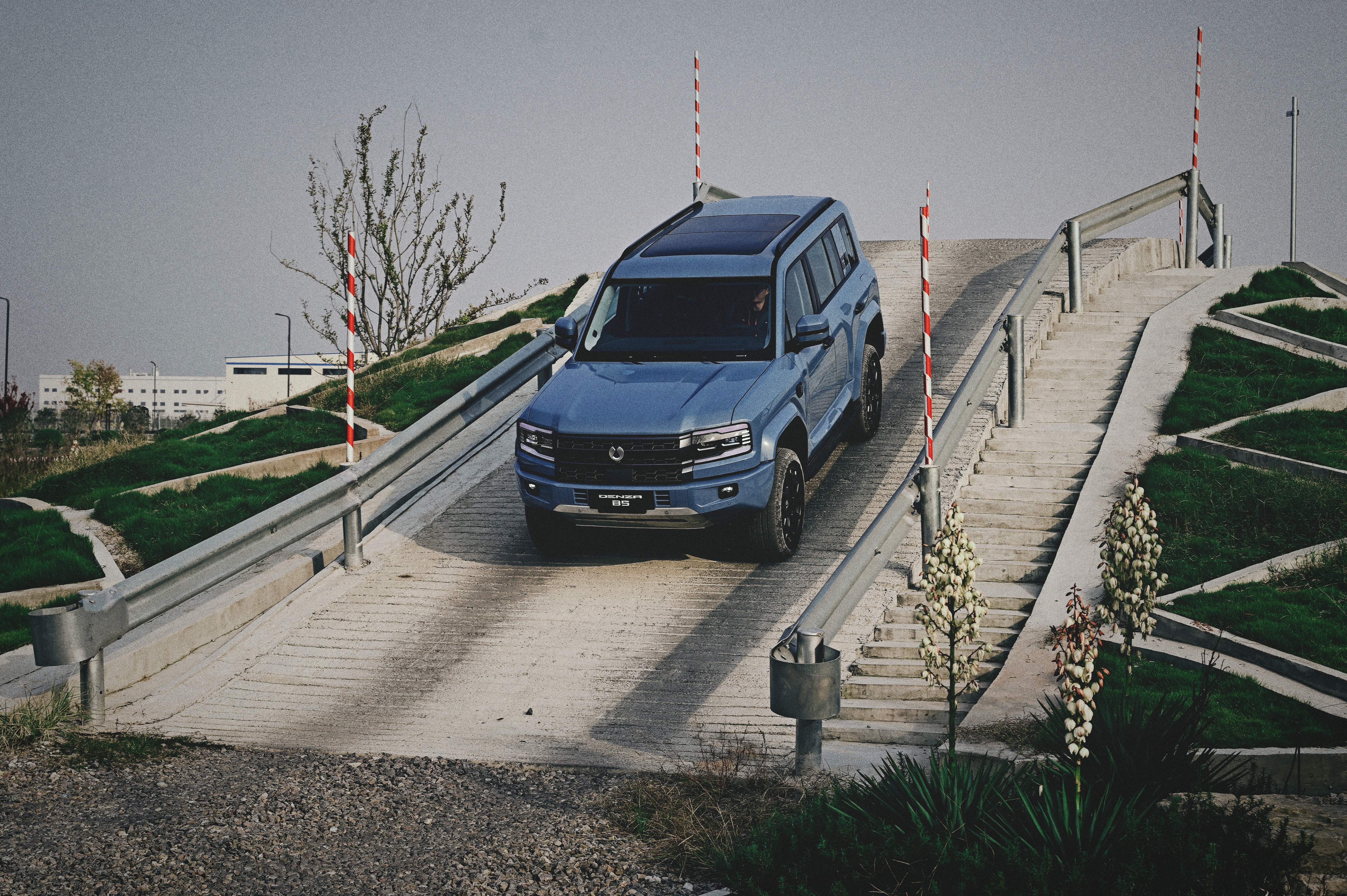 Una dintre cele mai interesante vizite pe care am bifat-o la centrul de testare BYD a fost la „pârtia” Sky Sand Slope, care simulează o dună de nisip cu o înclinație de 28 de grade și o înălțime de 40 de metri. Structura conține peste 6.000 de tone de nisip, stabilizat prin inovații brevetate – stabilizarea nisipului a necesitat 68 de runde de teste pentru găsirea mixului ideal. Yangwang U8 a demonstrat aici gestiunea tracțiunii pe nisip afânat, urcând rampa fără pierderea specifică de aderență a sistemelor off-road clasice.