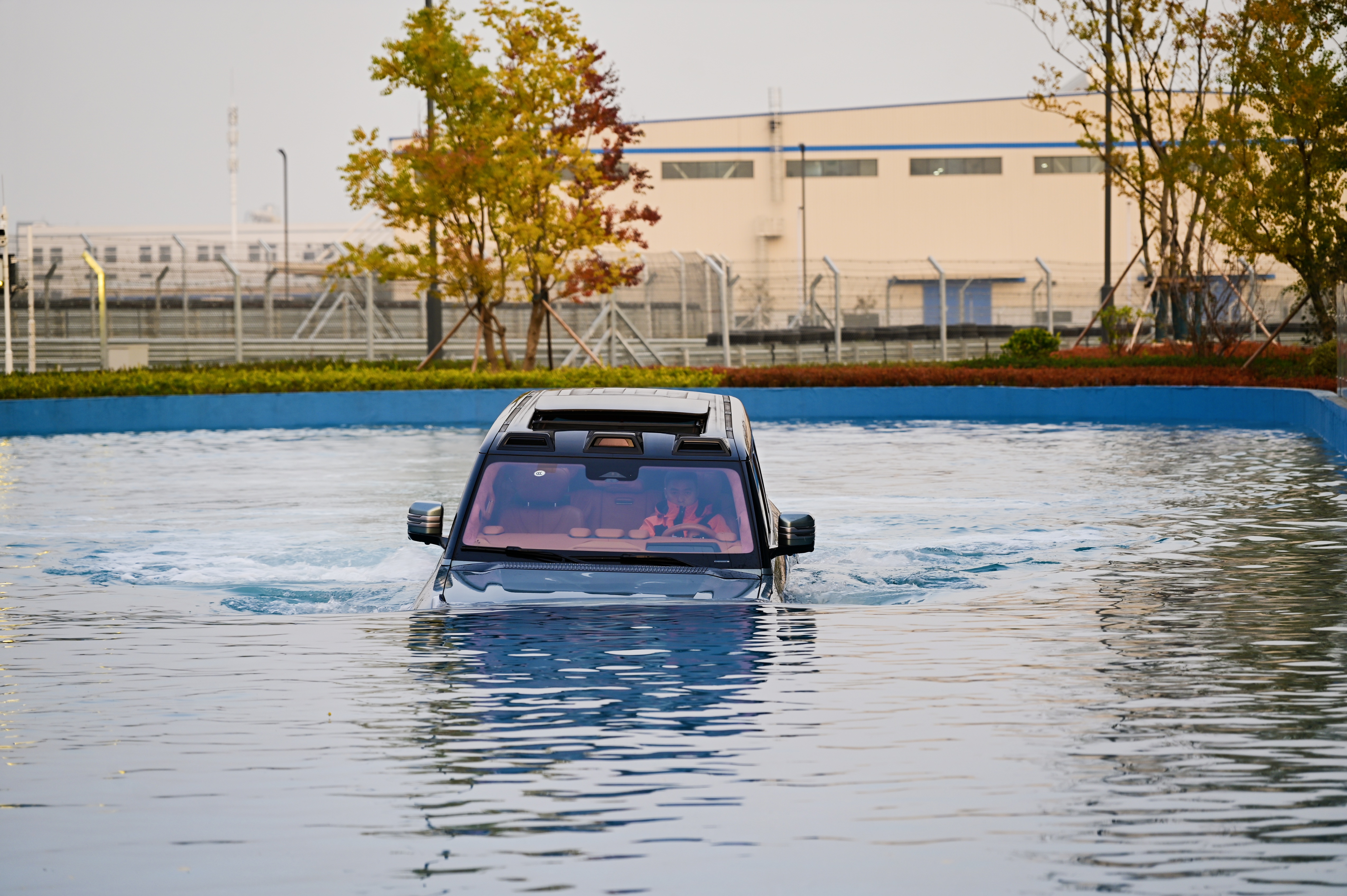 Într-o piscină de 1,8 metri adâncime, SUV-ul a intrat în apă până când roțile au pierdut contactul cu solul. Senzorii au activat modul de navigare acvatică: suspensia s-a ridicat la maximum, prizele de aer s-au sigilat, geamurile laterale s-au închis automat, trapa s-a deschis automat (pentru a facilita ieșirea pasagerilor în siguranță), iar cele patru motoare au asigurat propulsia la suprafață cu o viteză de aproximativ 3 km/h.