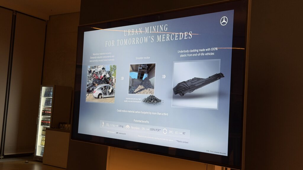 „Urban Mining” e un termen care sună a căutători de comori prin resturi de deșeuri – și cam asta fac și inginerii germani, doar că uneltele lor sunt halatele albe și computerele. Mercedes nu mai vrea să sape după bauxită (materialul din care e produs aluminiul) la Slatina, ci în propriile mașini vechi. De exemplu, am văzut un panou de ușă făcut integral din PET-uri reciclate, cu o structură sandwich care îl face mai ușor cu 40%. Panoul ăsta e un campion al eficienței, primind deja premii internaționale pentru reducerea dioxidului de carbon.