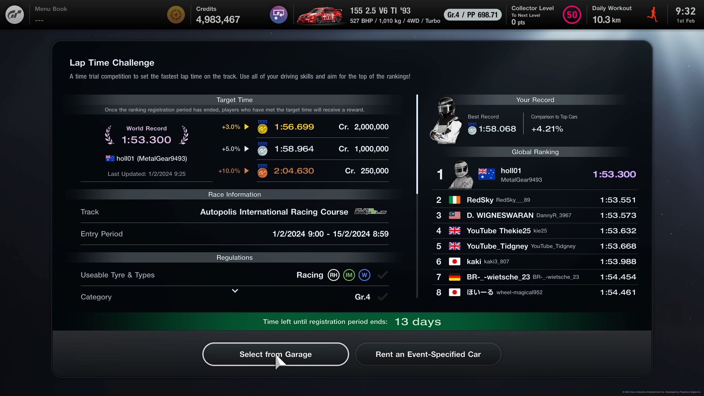 Ai două secțiuni aici. Una în care îți măsori talentul de la distanță cu tot poporul GT7. Ai un circuit, o mașină anume sau o grupă din care poți să-ți alegi un model. Setările mașinii sunt aceleași pentru toți. Aici este locul unde realizezi că nu ai destui psihologi și canapelele aferente în cartier. Am bifat rareori niște timpi de aur, adică să fiu în top 3% mondial. De regulă mă zbat în cele 7 procente care merg până la 10%. Să obții un timp de a fi în top 10% nu este greu, puțină implicare dacă vrei argint, iar pentru aur trebuie să știi ce faci.