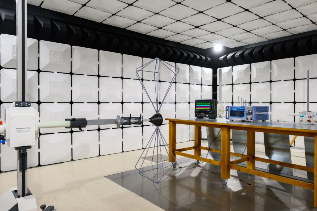 Testele au loc într-o cameră specială de testare în care nu există interferențe electromagnetice, iar inginerii generează un câmp electromagnetic cu ajutorul unei antene pentru a măsura emisiile efective ale componentei. Din interiorul acestei camere, comunicațiile cu mediul exterior se realizează doar prin fibră optică.