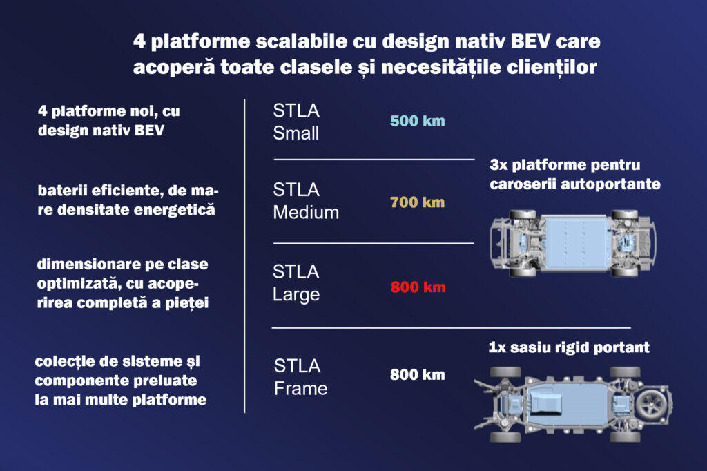 Patru platforme pentru paisprezece mărci, aceasta este ideea principală a strategiei tehnice STLA. Toate cele patru platforme sunt scalabile și compatibile cu sisteme de propulsie multi-energy. Platformele Small, Medium și Large au fost proiectate pentru integrarea în structuri de caroserie autoportante, în timp ce STLA Frame este, de fapt, un șasiu rigid clasic, însă dedicat erei electrificării.