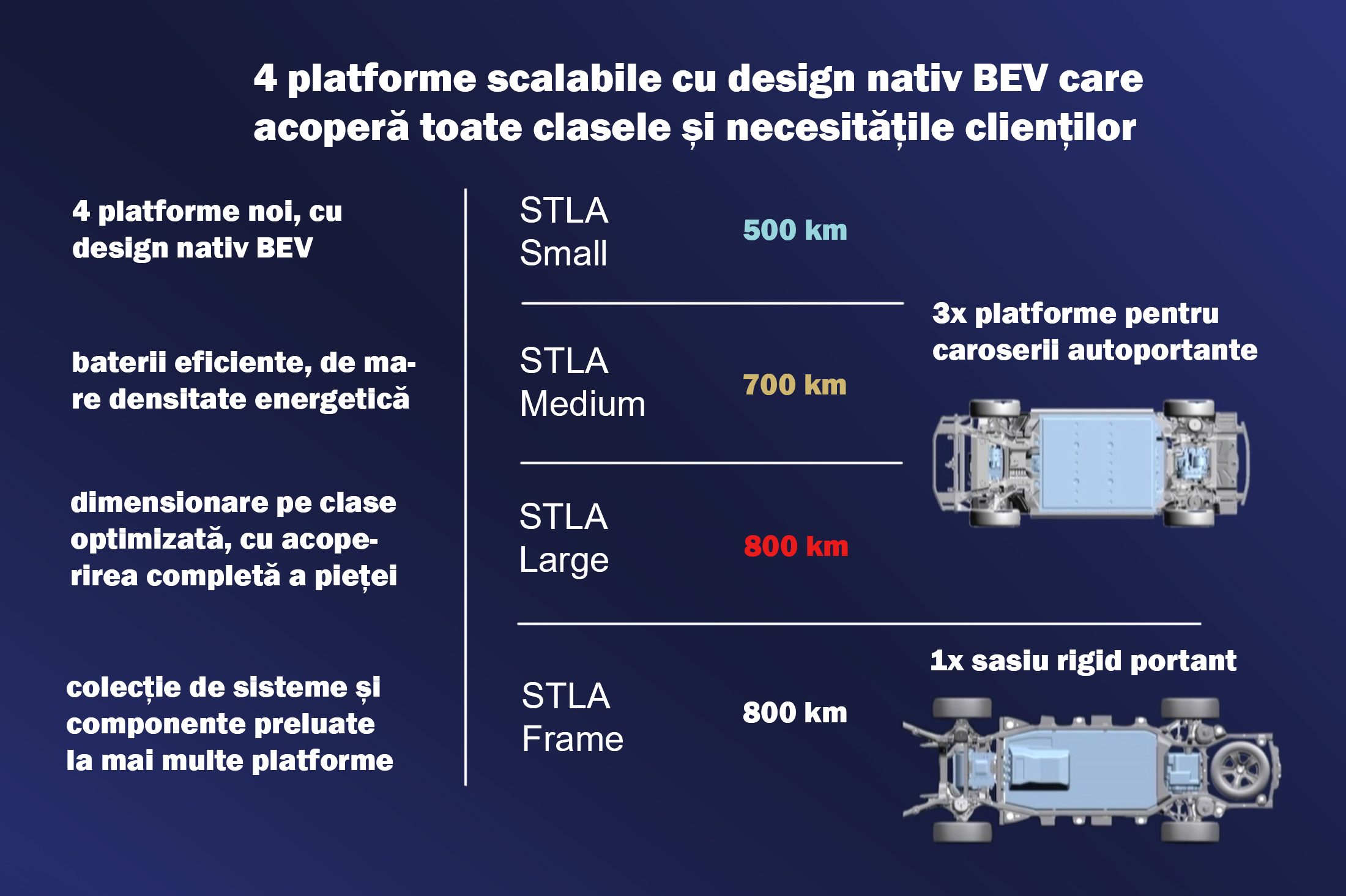 Patru platforme pentru paisprezece mărci, aceasta este ideea principală a strategiei tehnice STLA. Toate cele patru platforme sunt scalabile și compatibile cu sisteme de propulsie multi-energy. Platformele Small, Medium și Large au fost proiectate pentru integrarea în structuri de caroserie autoportante, în timp ce STLA Frame este, de fapt, un șasiu rigid clasic, însă dedicat erei electrificării.