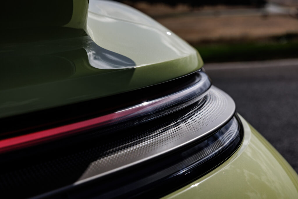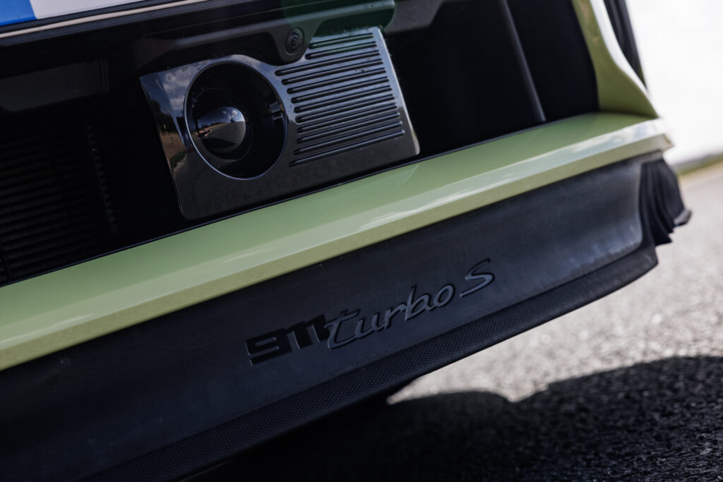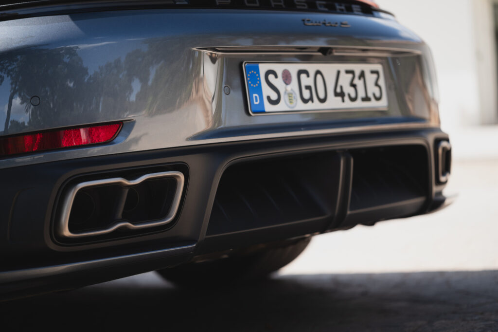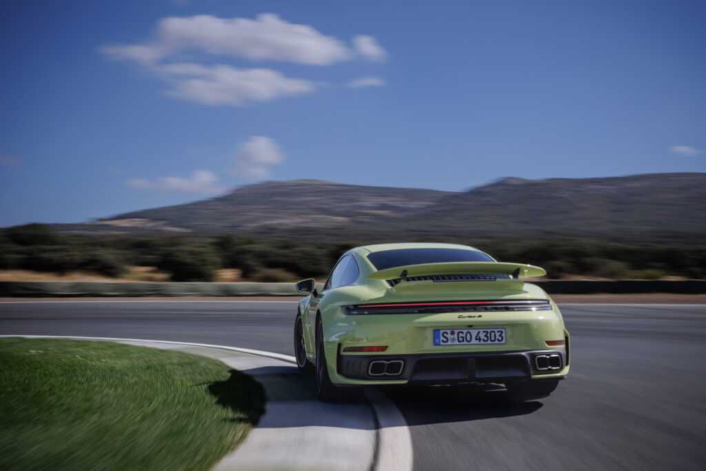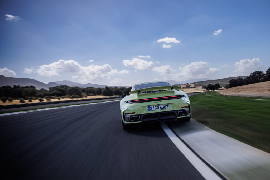 În spate, spoilerul redesenat și repoziționarea elementelor finale ale evacuării induc efectul de lățime mărită, deși diferența față de predecesor este insesizabilă în realitate. Mai mult, apropo de sistemul de evacuare, opțional se pot alege ornamente finale ovale, din titan, cu aer istoric (vezi 993) și clar mai sexi decât cele standard paralelipipedice. De asemenea, atât baza spoilerului posterior cât și lateralele celui față pot fi comandate din fibră de carbon. Greu de păzit, însă de mare efect la capitolul vizual. Și apropo de acest material, Turbo S 992.2 poate avea plafon din fibră, dar și jante speciale, aerodinamice, cu dimensiuni de 20, respectiv 21 inch (spate; unde, apropos, anvelopele sunt acum cu 10 mm mai late).