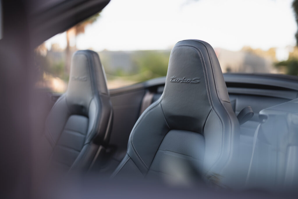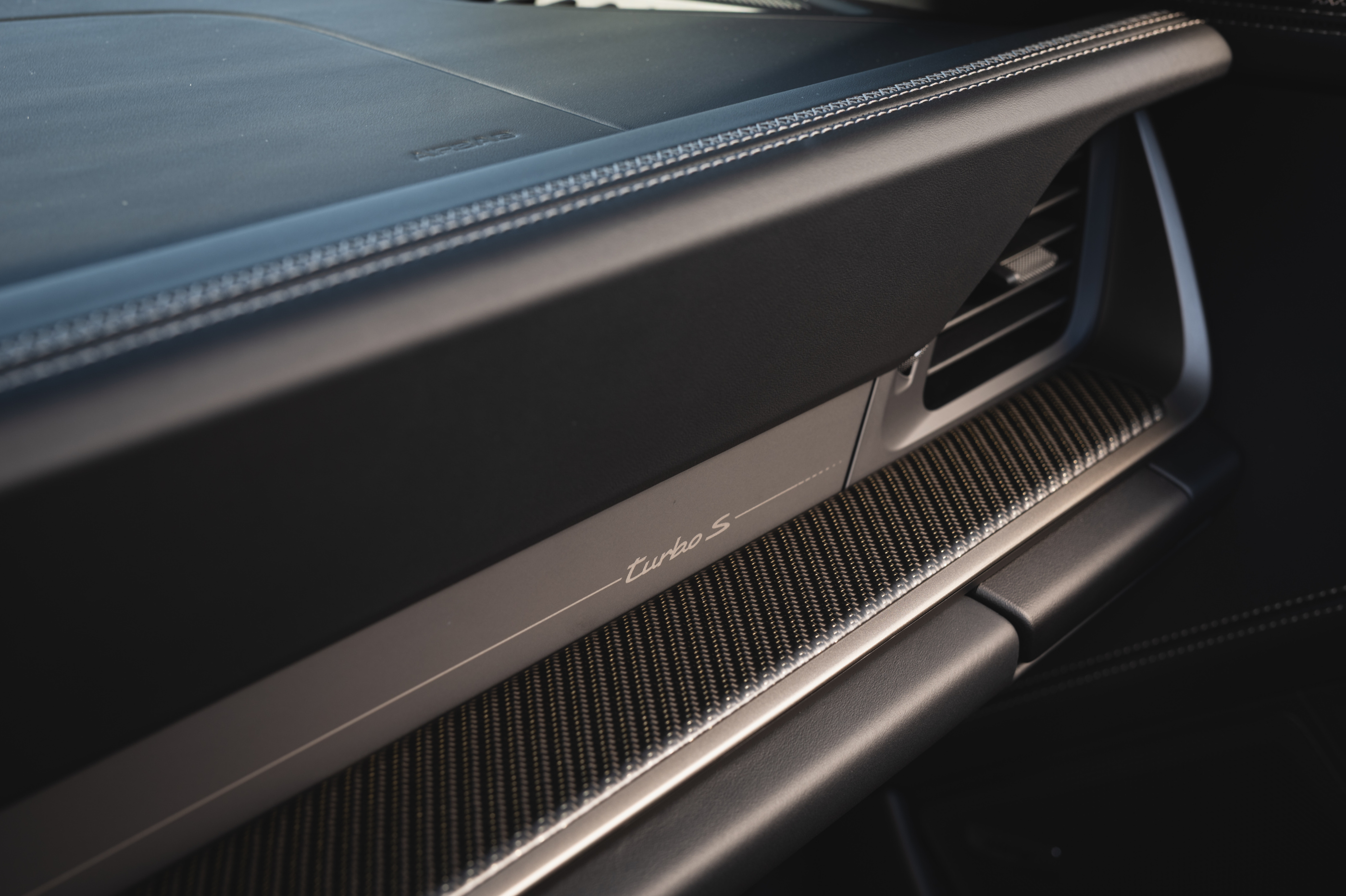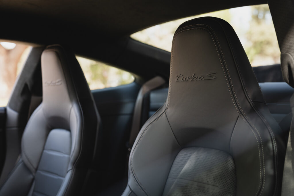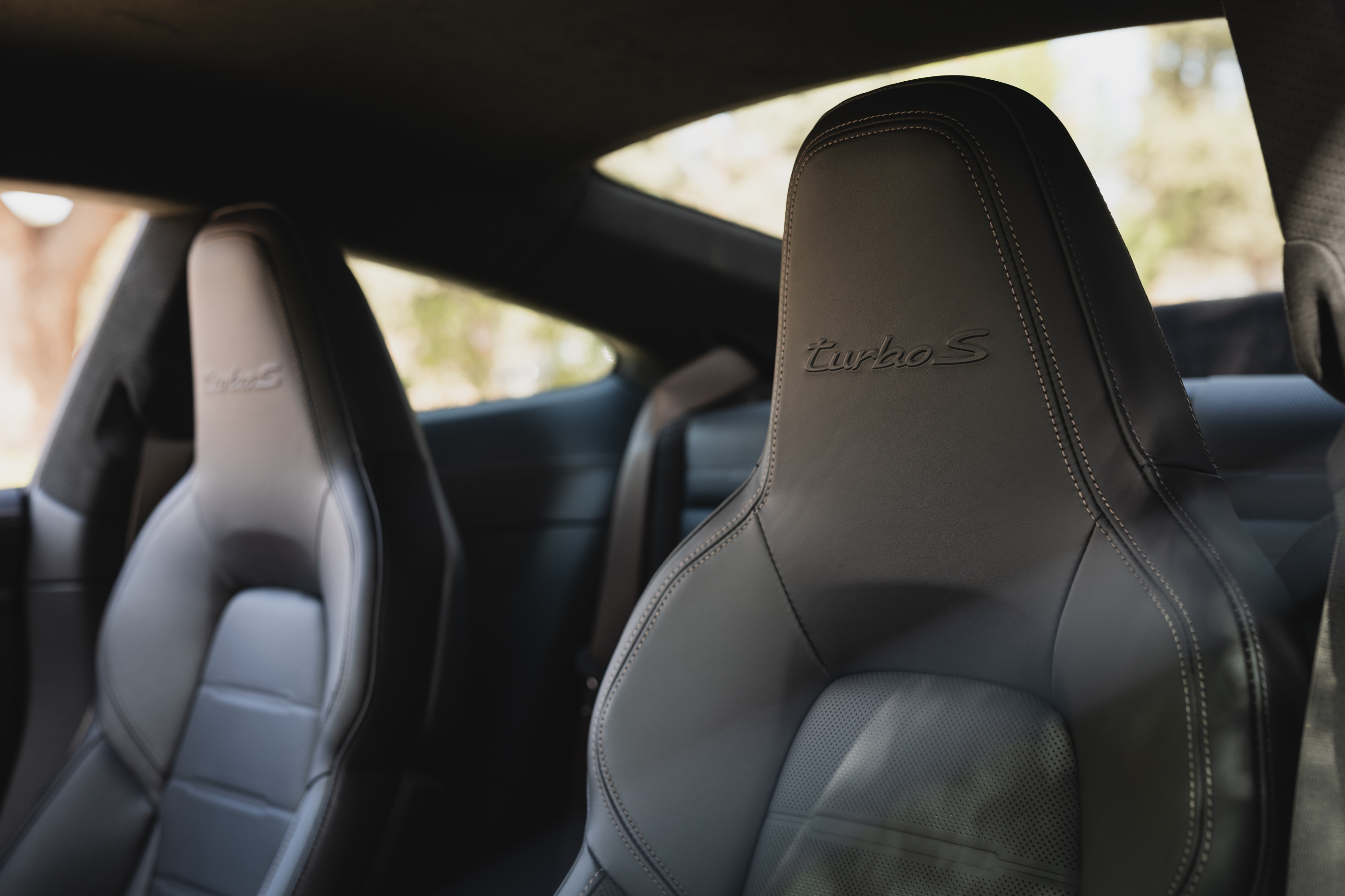 Tetiera integrată în scaunele sport absolut perfecte, care oferă și 18 reglaje pentru a te face să te simți una cu mașina, este marcată de logo-ul Turbo S restilizat, iar configurarea de test era cu fibră de carbon pe bord, ceea ce vă foarte recomand, pentru că așa-i șade bine unui Turbo. N-am de adus niciun fel de reproș, iar pe asta o spun din postura omului care mereu găsește câte ceva de comentat; asta spune multe.