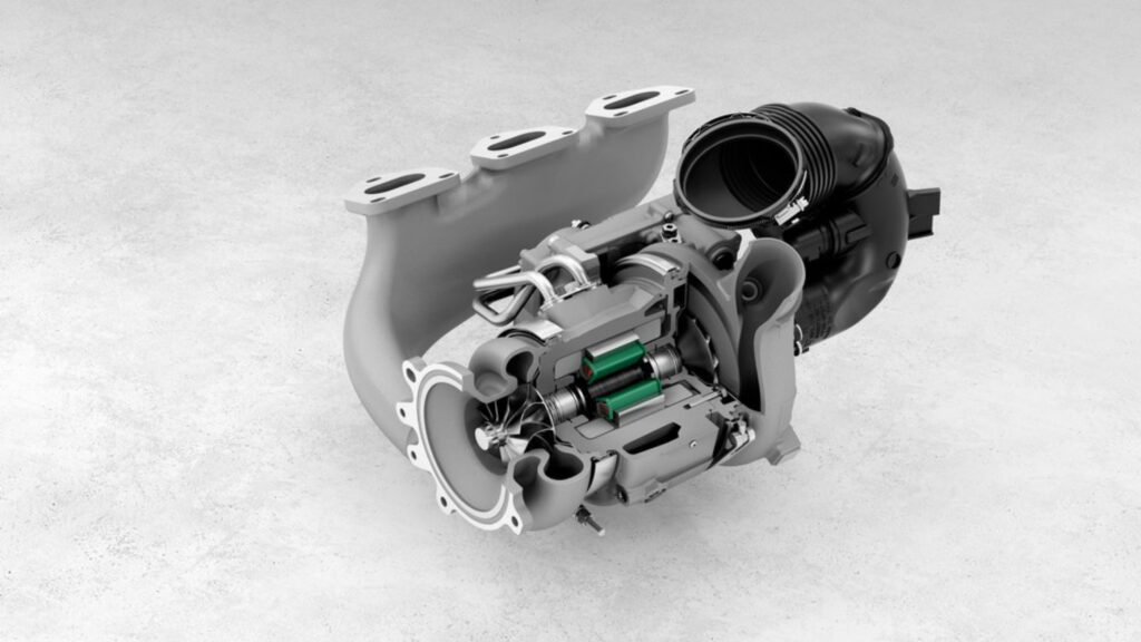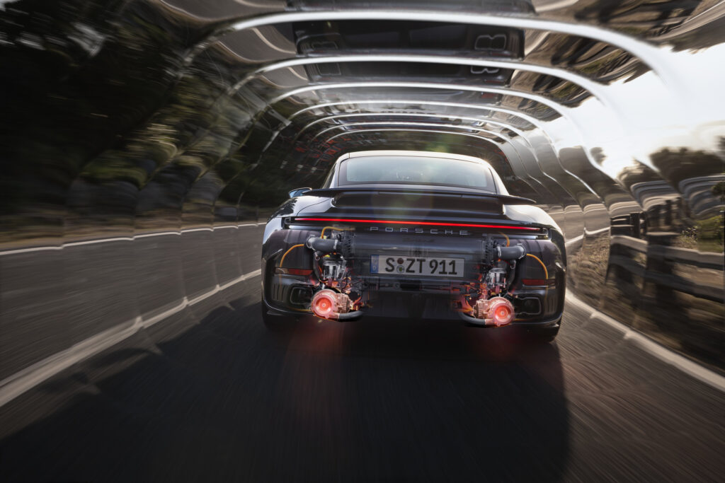 Nu în ultimul rând, ba chiar în capul listei dacă ne gândim la titulatura modelului, ar sta adoptarea unor turbosuflante cu adevărat revoluționare. Două, așa cum ne-a obișnuit Turbo, nu în premieră ca tehnologie (căci acolo startul s-a dat odată cu actuala generație GTS, care beneficiază, însă, de una singură în sistem), aceste componente vin cu marea noutate că datorită unui motoraș electric integrat și montat între cele două rotoare, funcționarea turbosuflantei în sine nu mai este dependentă de gazele de evacuare ci de comanda primită de axul comun chiar de la motorașul electric; concis, intervenția turbinei poate fi comandată electronic, nemaifiind nevoie să se aștepte atingerea unui prag de turație a motorului.