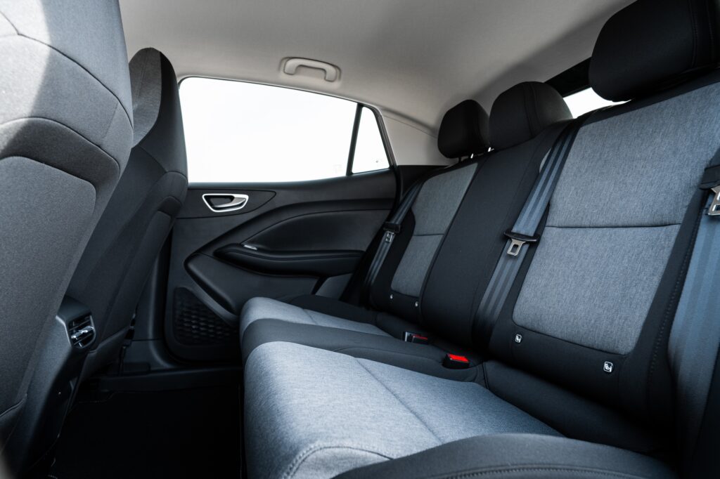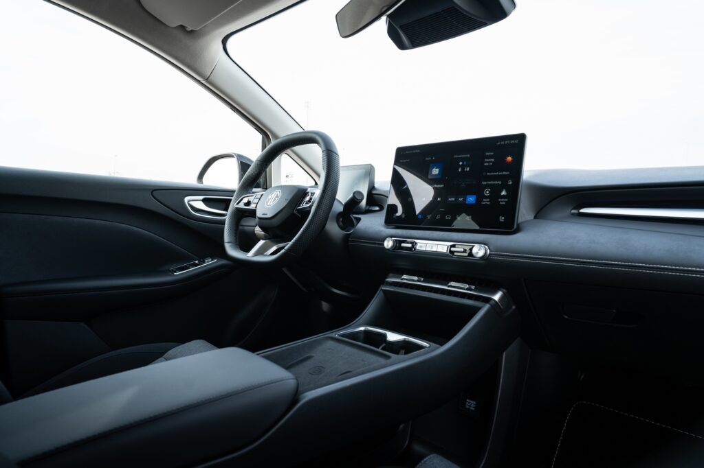 Partea cu „de buget“ se vede imediat cum urci la volan. Este mult plastic la interior, unele zone sună a gol, iar faptul că motorul electric învârte roțile față scade sesizabil din caracterul sportiv și vioi pe care-l etalează MG4.