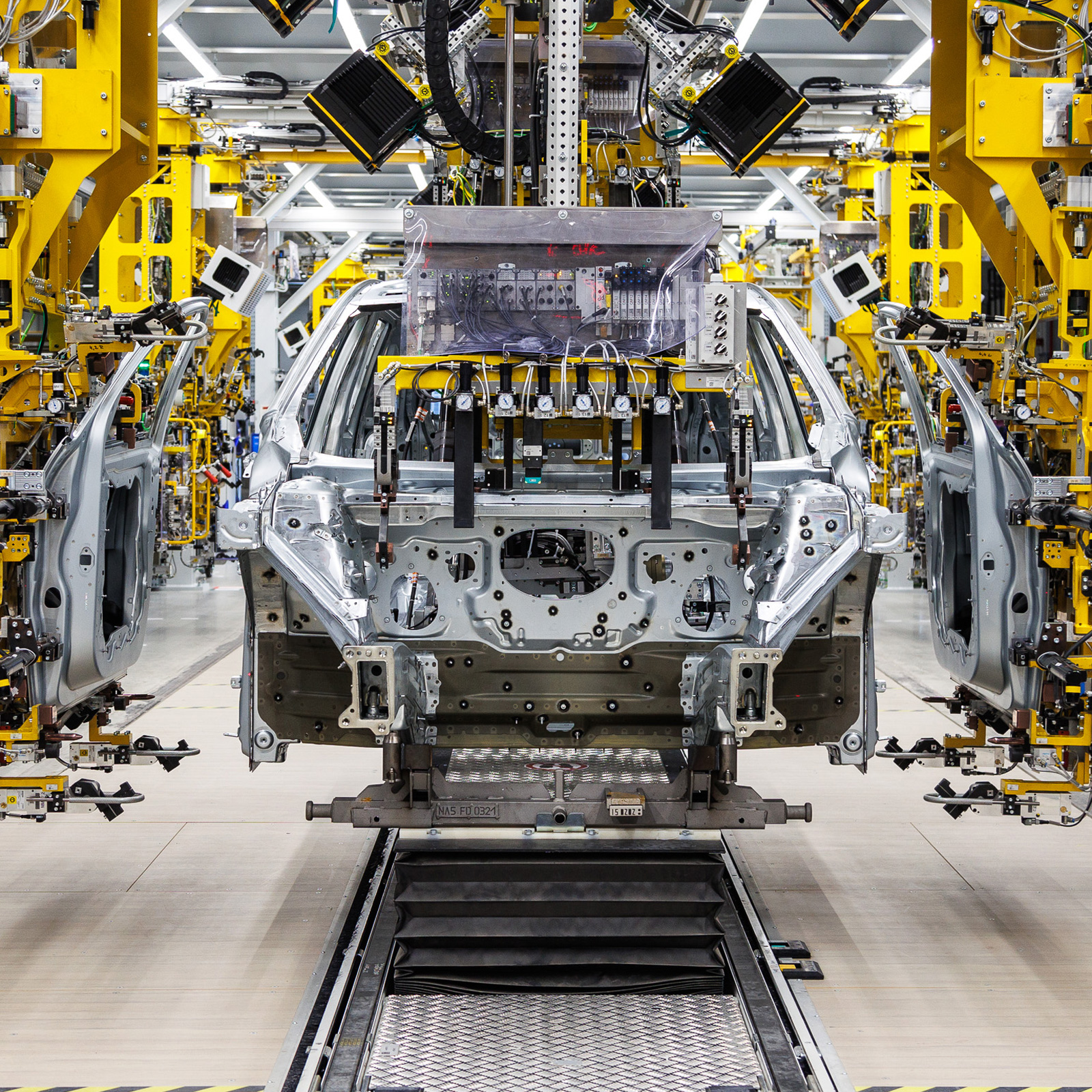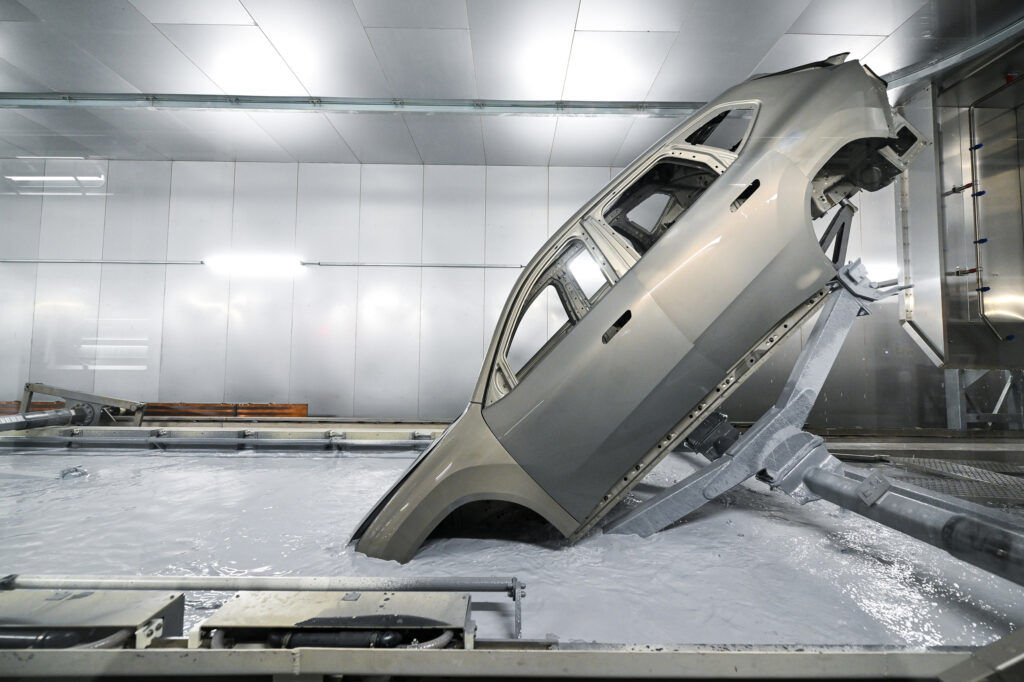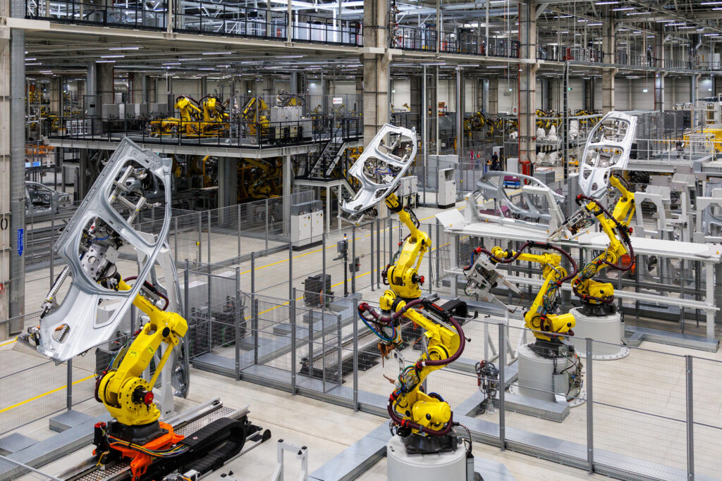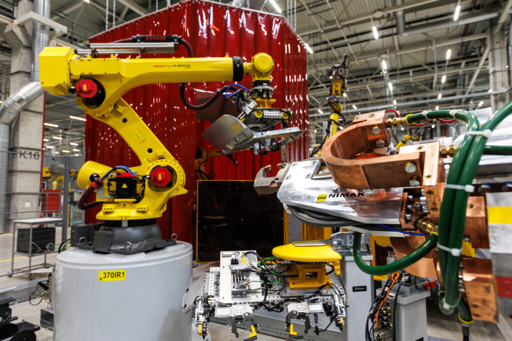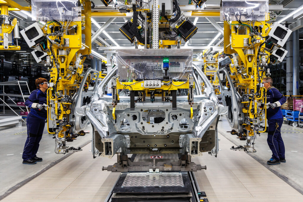 Componentele realizate în secția de presaj ajung ulterior în atelierul de caroserie, acolo unde sunt îmbinate pentru a lua forma finală a mașinii. În timpul vizitei noastre la uzină activitatea este mai degrabă una de test, în care se fac ultimele reglaje pentru startul producției de serie.