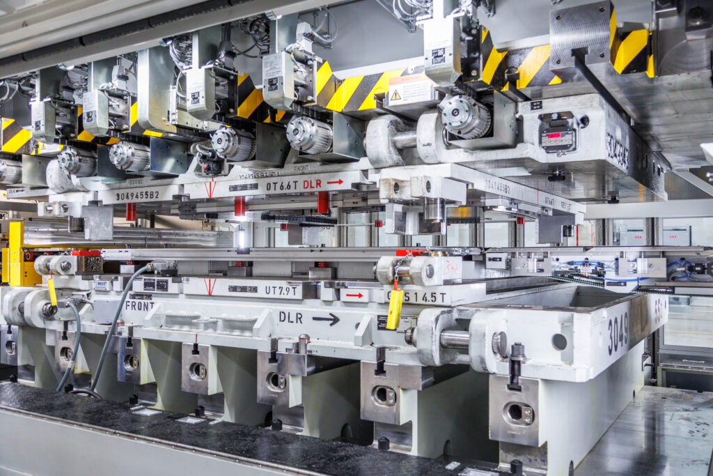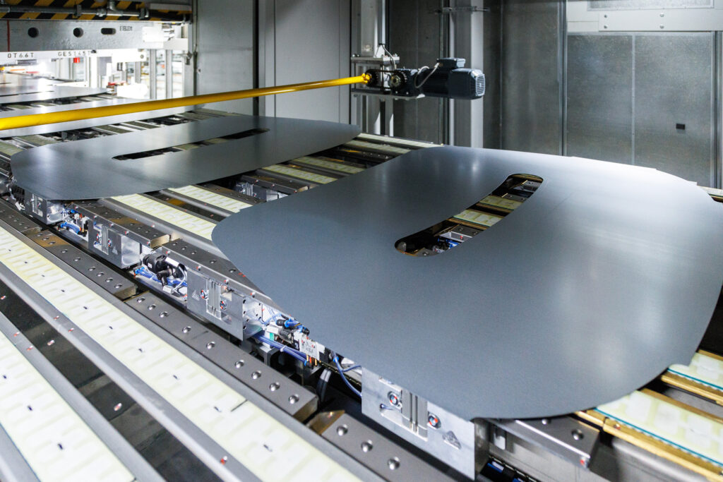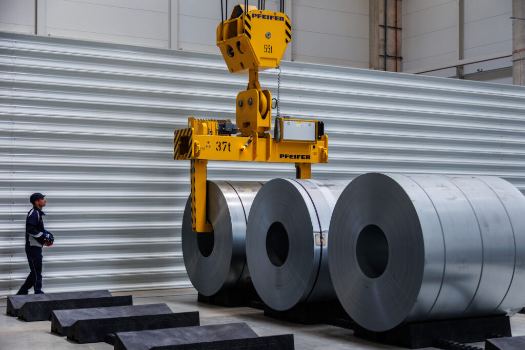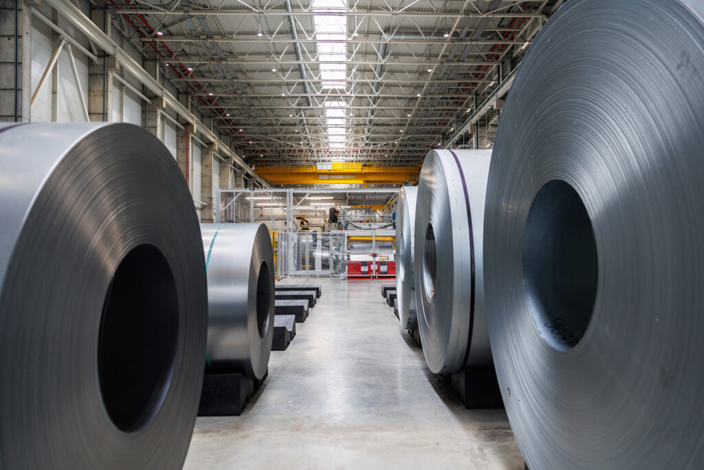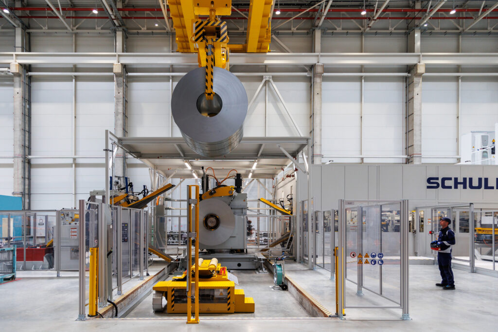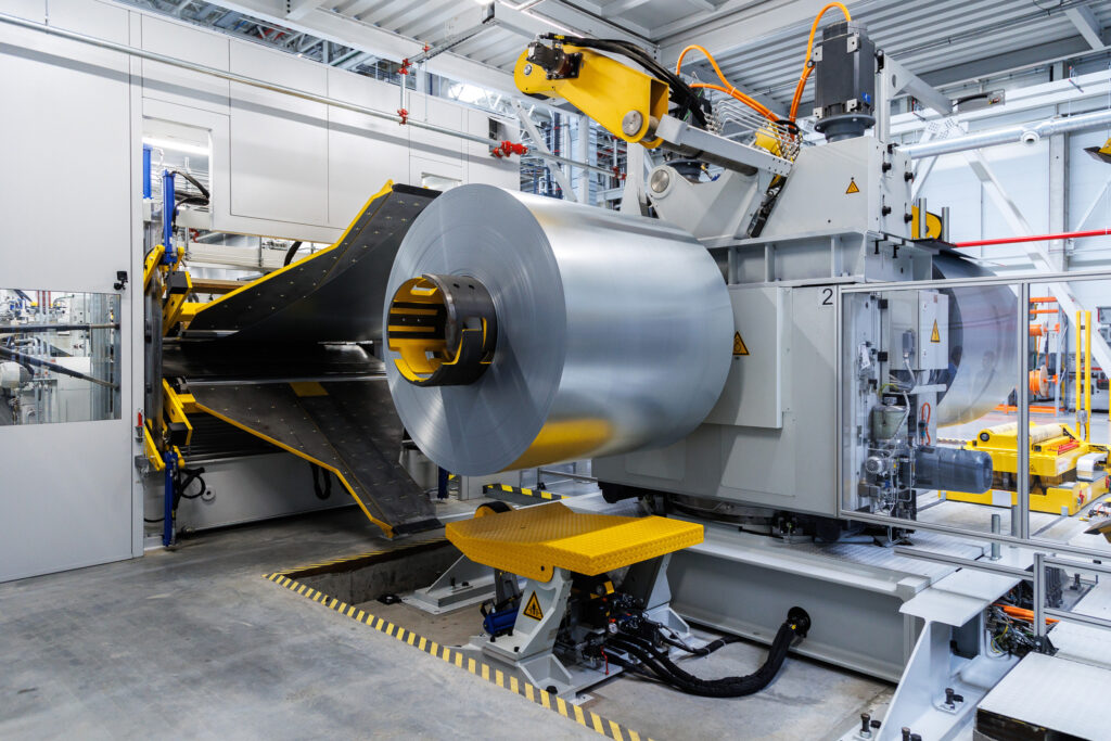 O macara cu o masă de 55 de tone alimentează linia de producție cu role de oțel și aluminiu care sunt tăiate în diverse forme geometrice pentru viitoarele elemente de caroserie. Tehnologia utilizată aici nu este una nouă, specifică fabricii din Debrecen, ci împrumutată de la uzinele BMW din Spartanburg (Statele Unite) și Swindon (Marea Britanie).