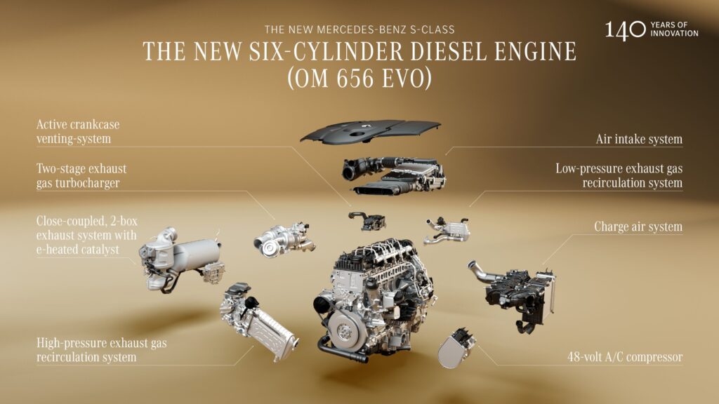 • S 350 d 4MATIC / S 450 d 4MATIC: 313/367 CP, echipate cu motorul OM 656 Evo și, pentru prima dată, cu un catalizator încălzit electric pentru reducerea rapidă a emisiilor.