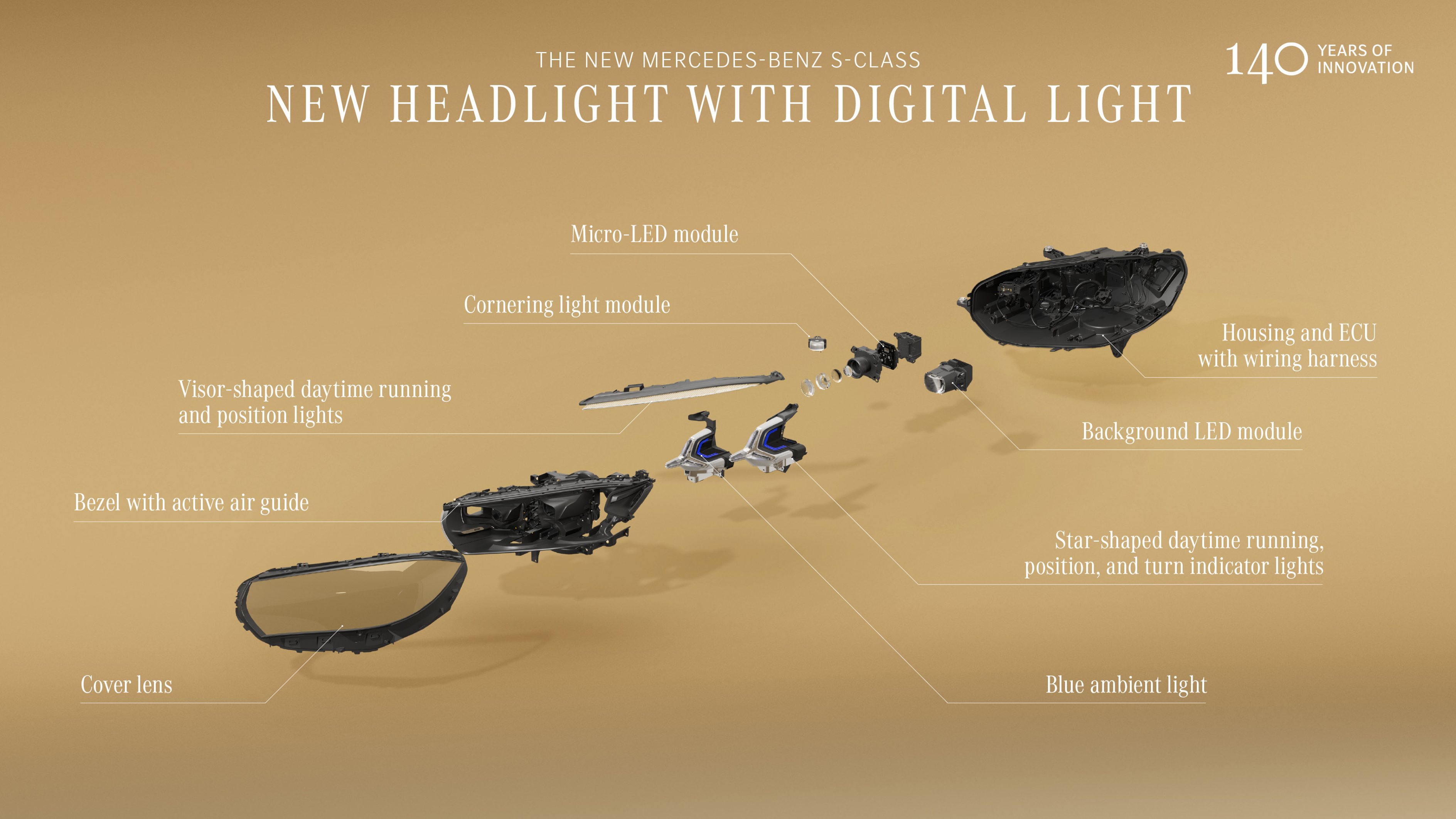• Sistemul de faruri Digital Light de generație următoare folosește tehnologie micro-LED, oferind un câmp de iluminare de înaltă rezoluție cu 40% mai mare și funcții de proiecție pe carosabil, precum avertizările pentru condiții de îngheț.