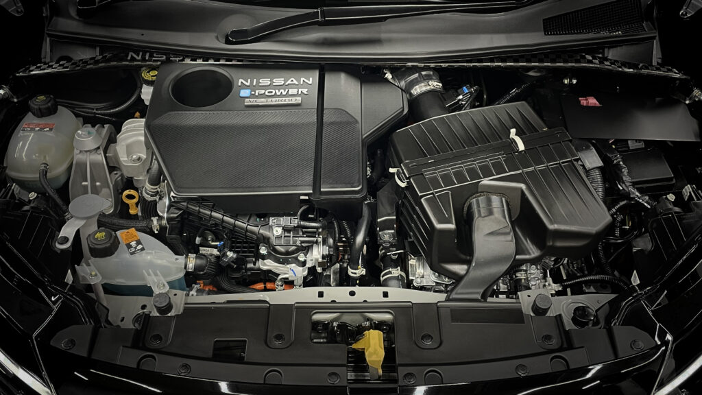 • Același sistem de propulsie de pe X-Trail Nismo: motor pe benzină de 1,5 litri (144 CP) + 2 motoare electrice (203 CP pe puntea față și 135 CP pe puntea spate) + baterie. Motorul termic încarcă bateria, iar motoarele electrice sunt cele care învârt roțile.
