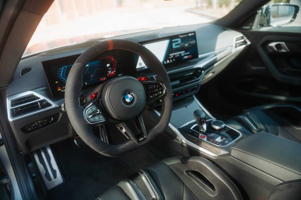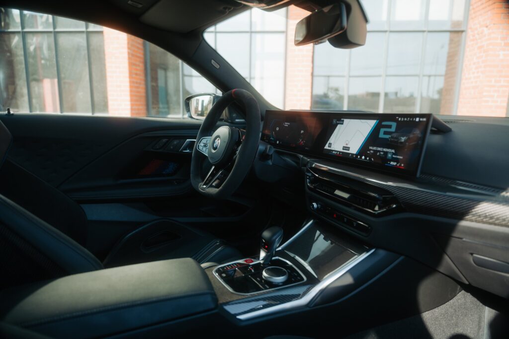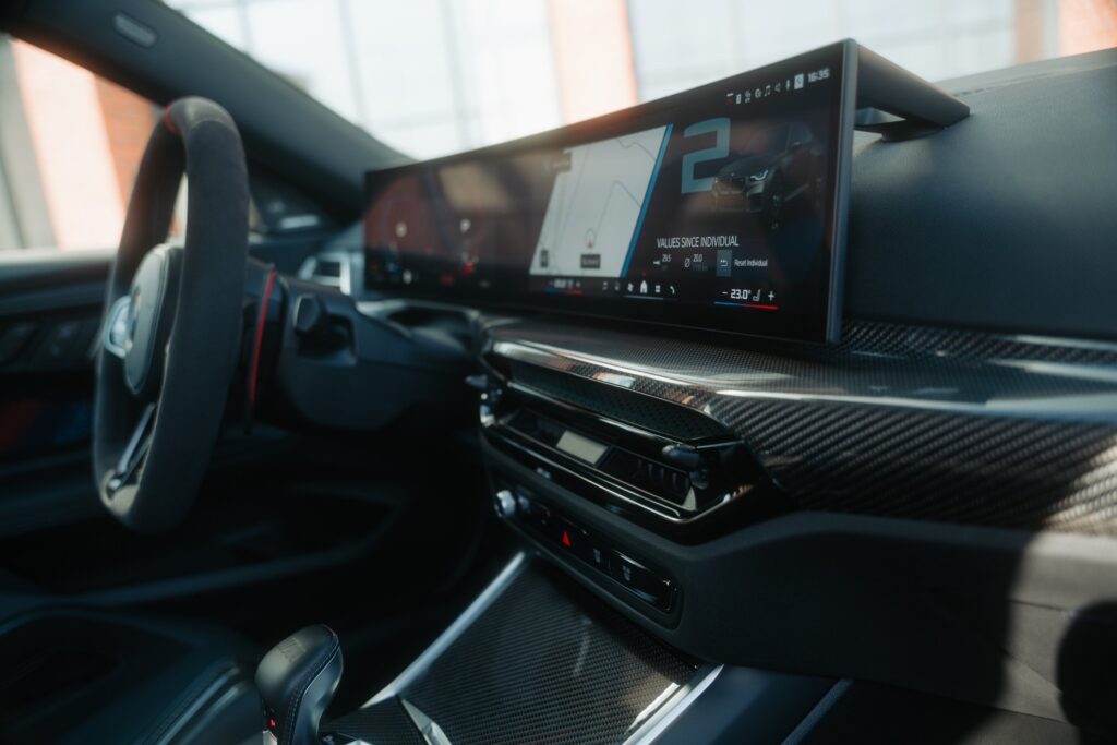 Pe modelul de test, acestea sunt incluse în pachetul M Race Track (la prețul de 14.350 de euro), care include, printre ceea ce deja cred că este evident, scaune de tip scoică M Carbon și un plafon M Carbon. De fapt, carbonul, sau mai exact CFRP-ul (plastic ranforsat cu fibră de carbon) domină peisajul pe afară și pe dinăuntru.