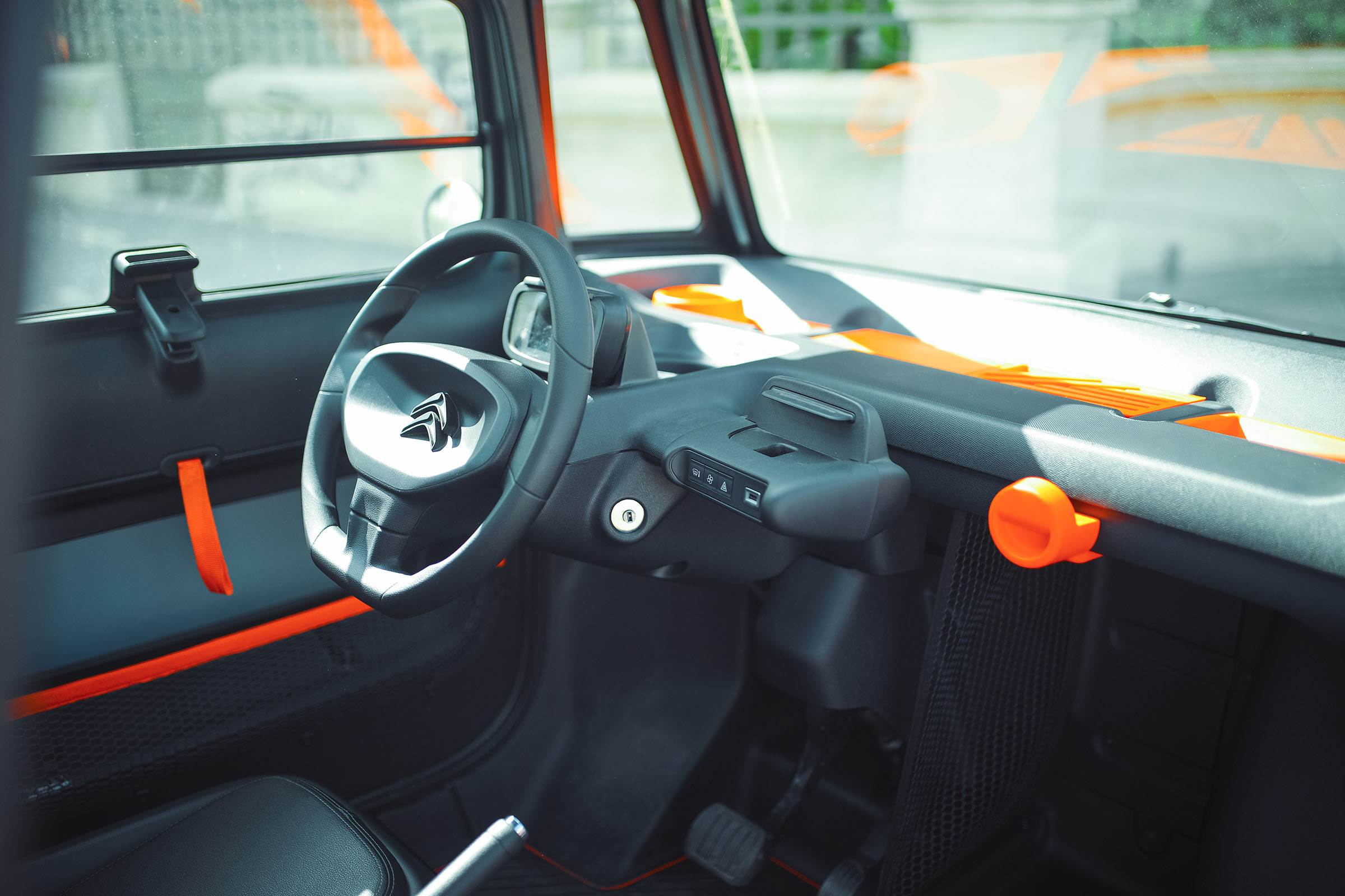 Citroën nu a vrut să facă din Ami un C6 al cvadriciclurilor. Iar din acest motiv, interiorul este spartan. Portierele se deschid prin acționarea unei curelușe (la fel ca la mașinile de competiții), iar mânerele au fost înlocuite de o curea centrală. În locul unor separatoare clasice, francezii oferă o plasă pe portiere în spatele căreia poți depozita diverse obiecte. Materialele plastice sunt dure și nici finisările nu se ridică la nivelul unei mașini convenționale.