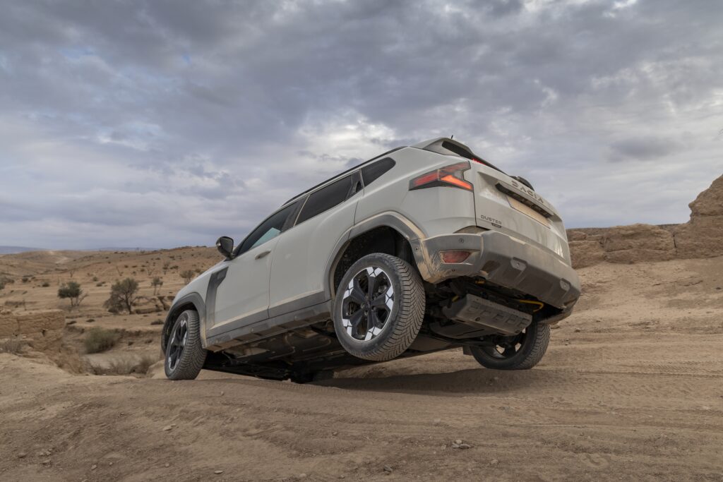 Modurile Mud/Sand și Lock cuplează la plecare prima treaptă a transmisiei de pe puntea spate care are un raport de reducere de 22. Ambele punți sunt active, cu mențiunea că puntea spate este decuplată în clipa în care se depășește viteza de 70 km/h. Probabil nu mai vorbim de off-road atât de greu dacă ești capabil să rulezi cu această viteză. Să menționez și gradele acestui Duster. Unghiul de atac este de 31 de grade, cel de rampă de 24 grade, iar cel de degajare de 36 de grade, la care adaug o gardă la sol de 217 mm.