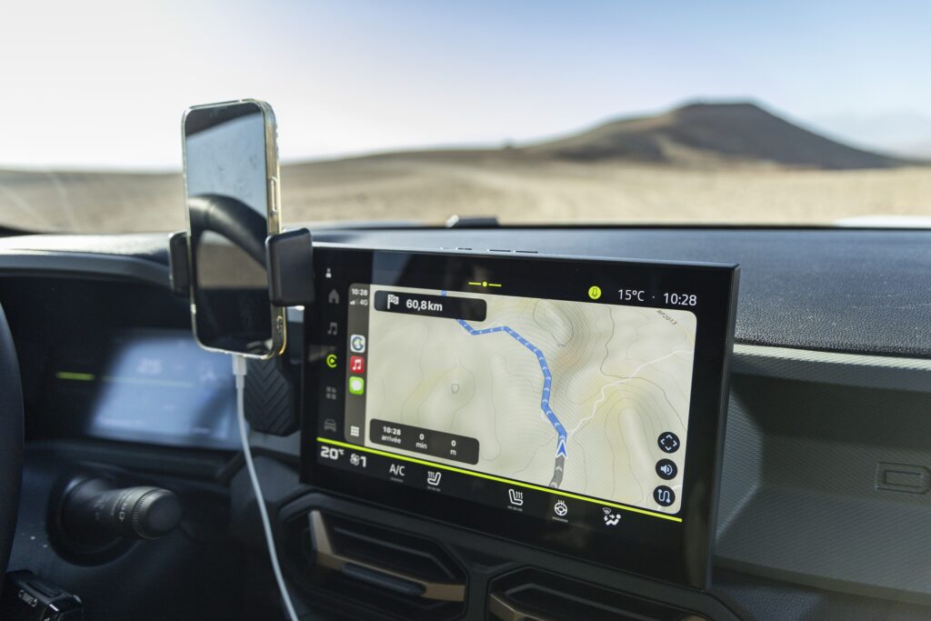 În situații particulare, cum a fost traseul din Maroc, descoperi avantajele unor detalii care pe alocuri îți pot părea banale. Aici mă refer la sistemul YouClip și prinderea telefonului. Ar fi putut sta cuminte și la baza consolei centrale, dar nu cred că modul de rulare abordat pe alocuri i-ar fi permis pentru mult timp să își păstreze locul: sigur l-aș fi căutat prin habitaclu. De reținut că portbagajul în această declinare are un volum de 348 litri. Cea mai generoasă ofertă din portofoliul Duster înseamnă un portbagaj de 517 litri, iar diferența dintre cele două trebuie pusă pe seama elementelor sistemului de propulsie care au fost montate pe puntea spate.