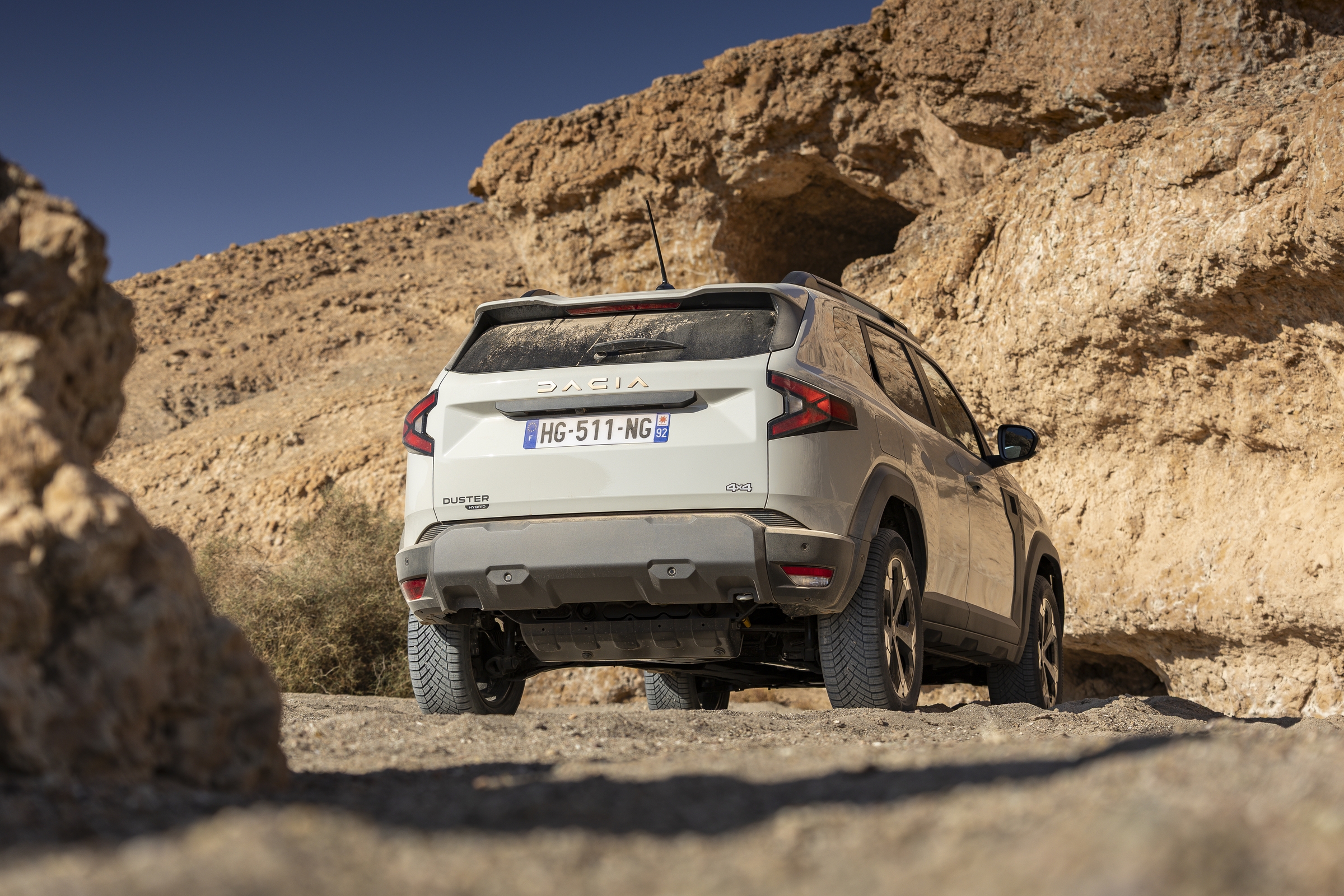 Soluția tehnică aleasă pentru puntea spate nu a mai permis păstrarea suspensiei independente. Motorul electric și cutia de viteze sunt montate pe un subcadru, practic vorbim despre o punte semirigidă pe spate. Plusul de kilograme, noul model este cu 80 kg mai greu decât prima versiune Duster 3 cu tracțiune integrală, este grupat în jurul punții spate (propulsor și baterie), ceea ce face spatele mașinii mai puțin viu, țopăitor pe suprafețe denivelate.