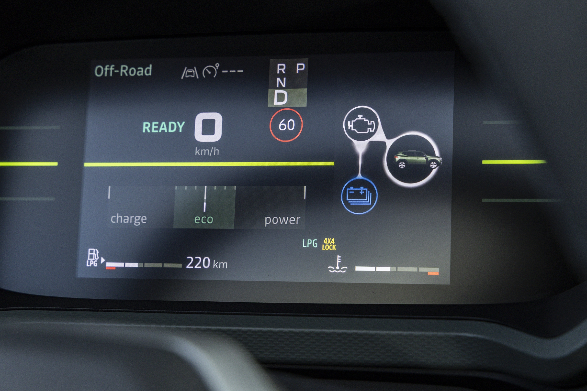 Un sistem hibrid automat care poate fi alimentat atât cu benzină cât și cu GPL. Un lucru rar în peisaj. Avem un rezervor de 50 litri benzină și unul de GPL care poate găzdui 50 litri/ 28 kg GPL. Autonomia declarată de producător, cu cele două rezervoare pline, poate ajunge la 1.500 km conform ciclului de testare WLTP.