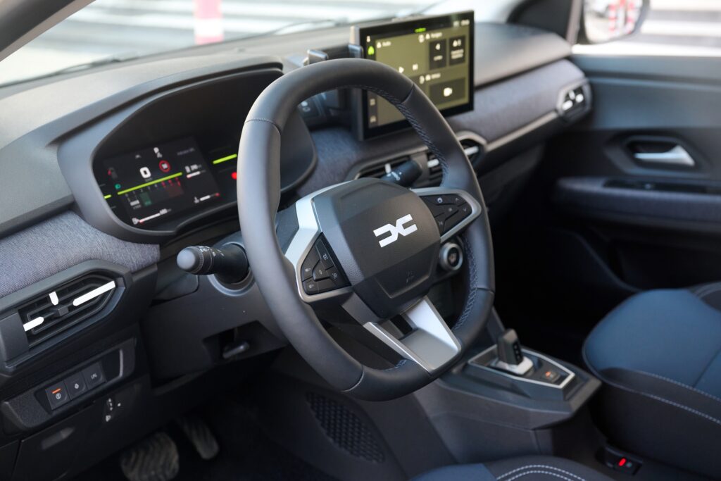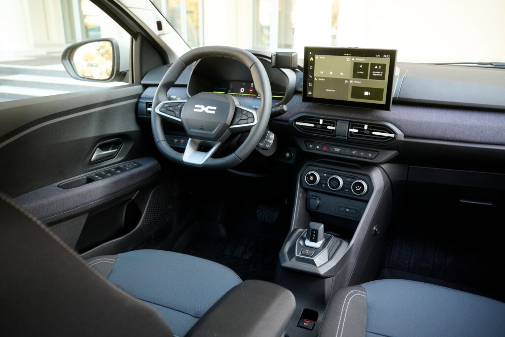 Ambianță clasică Dacia. Asamblare robustă, plastice solide, dar cu texturi agreabile care contribuie la o ameliorare a percepției calității la interior. Materialul textil prezent pe planșa de bord și pe panoul portierei schimbă în bine ambianța. Noutatea este că acum acest material este mult mai durabil (vom vedea cât de bine rezistă după ce trece testul timpul). Apar și mici restilizări la nivelul gurilor de ventilație care integrează o grafică care amintește de semnătura luminoasă a farurilor.