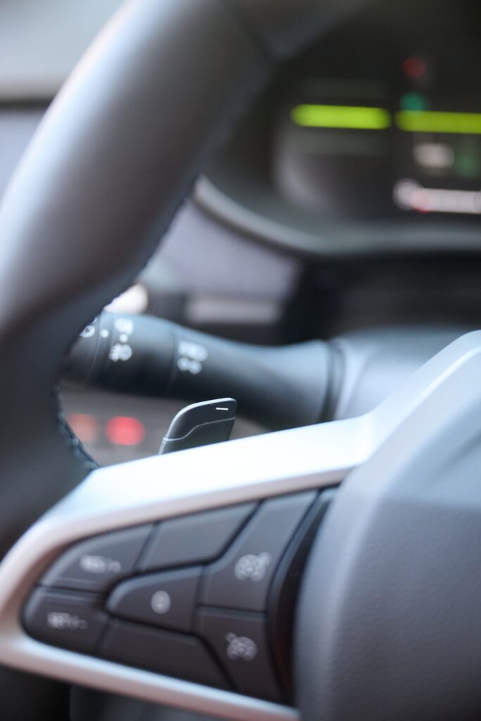 În cazul în care ai un traseu care îți solicită un răspuns mai prompt la comenzi din partea ansamblului motor-cutie, poți selecta modul manual și poți menține treapta dorită. Schimbarea manuală a treptelor se face prin intermediul padelelor amplasate pe volan (poziționarea acestora fam găsit-o ergonomică). Vei putea apela la modul manual și când vrei să pregătești o depășire.