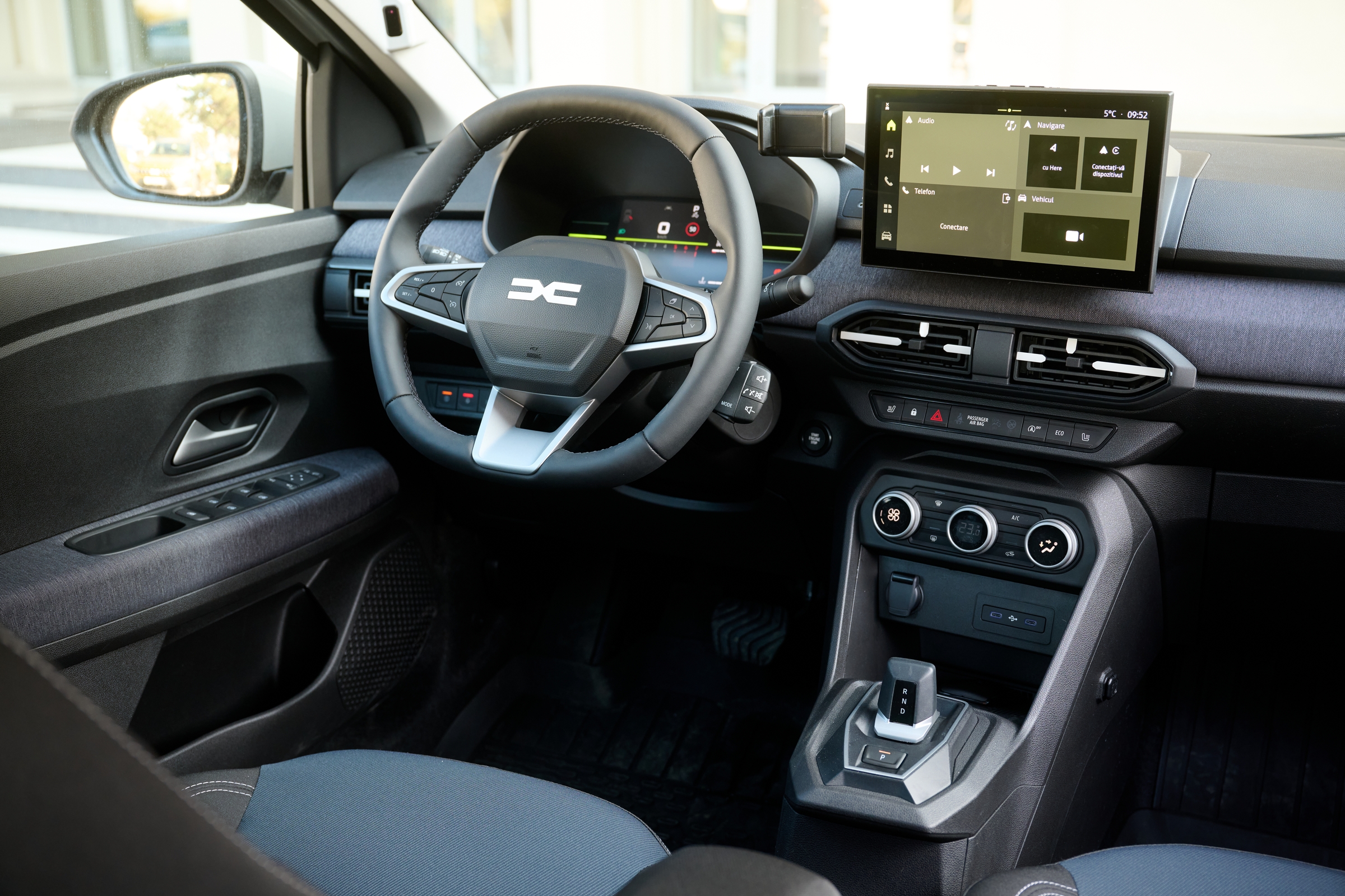 Ambianță clasică Dacia. Asamblare robustă, plastice solide, dar cu texturi agreabile care contribuie la o ameliorare a percepției calității la interior. Materialul textil prezent pe planșa de bord și pe panoul portierei schimbă în bine ambianța. Noutatea este că acum acest material este mult mai durabil (vom vedea cât de bine rezistă după ce trece testul timpul). Apar și mici restilizări la nivelul gurilor de ventilație care integrează o grafică care amintește de semnătura luminoasă a farurilor.