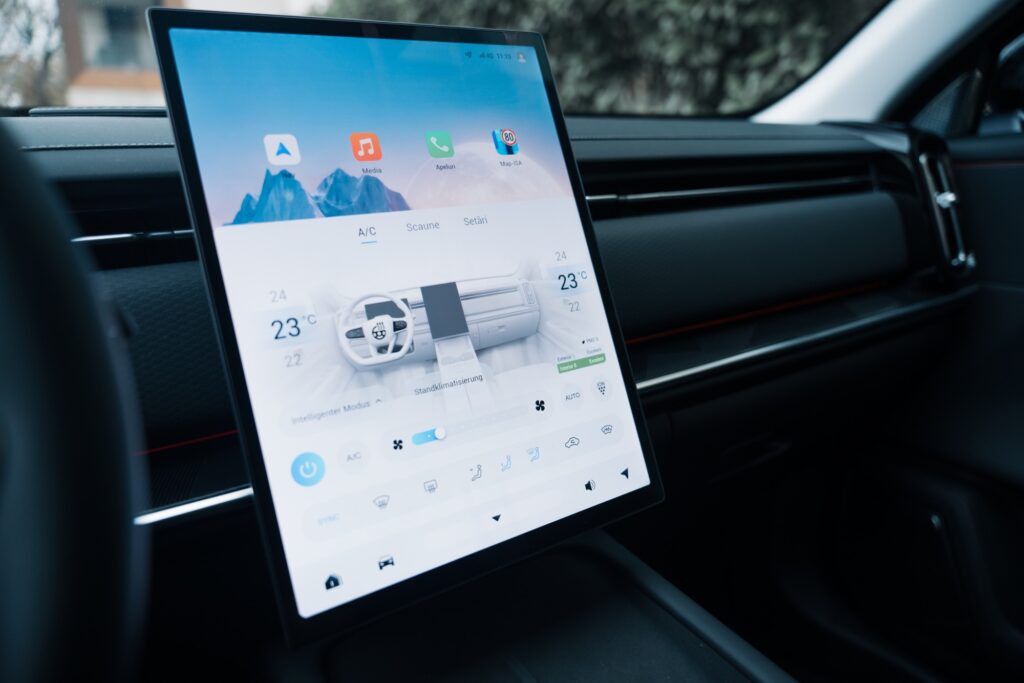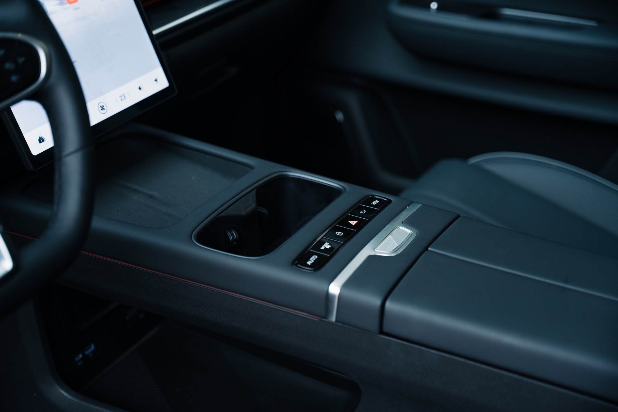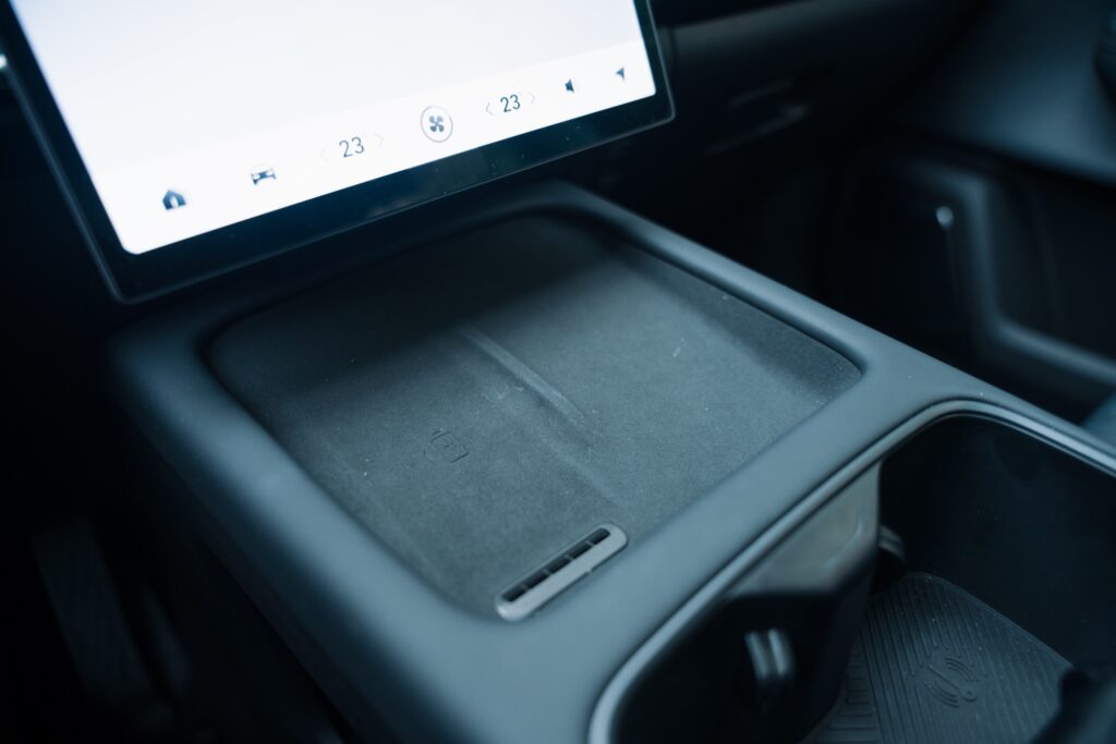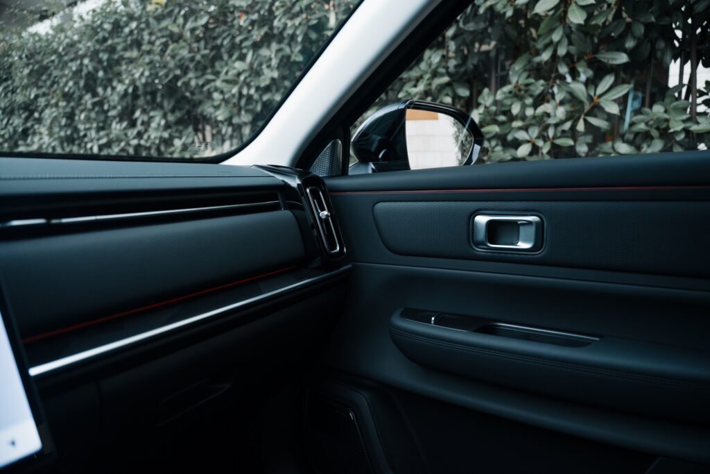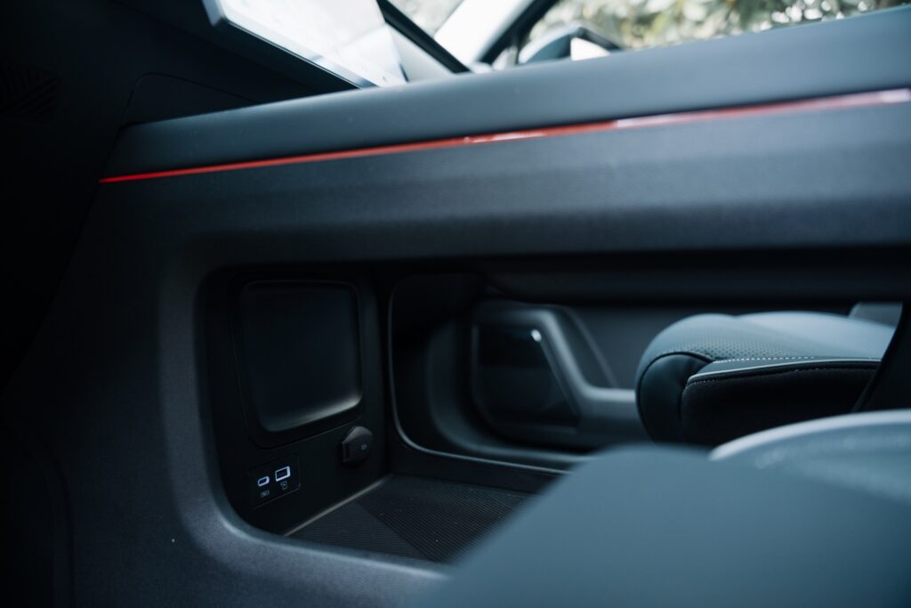 Prizele de aer verticale au inserții cromate și aduc aminte de elemente pe care le-am mai văzut pe modele Volvo. Pe bord avem și cusături vizibile și materiale plăcute la atingere, plus iluminat ambiental într-o gamă largă de culori. Pe consola central avem două spații pentru depozitarea telefoanelor mobile finisate cu un material moale ce amintește de Alcantara. Spațiul de pe partea șoferului oferă și încărcare prin inducție și este și ventilat pentru răcirea telefonului în timpul încărcării.