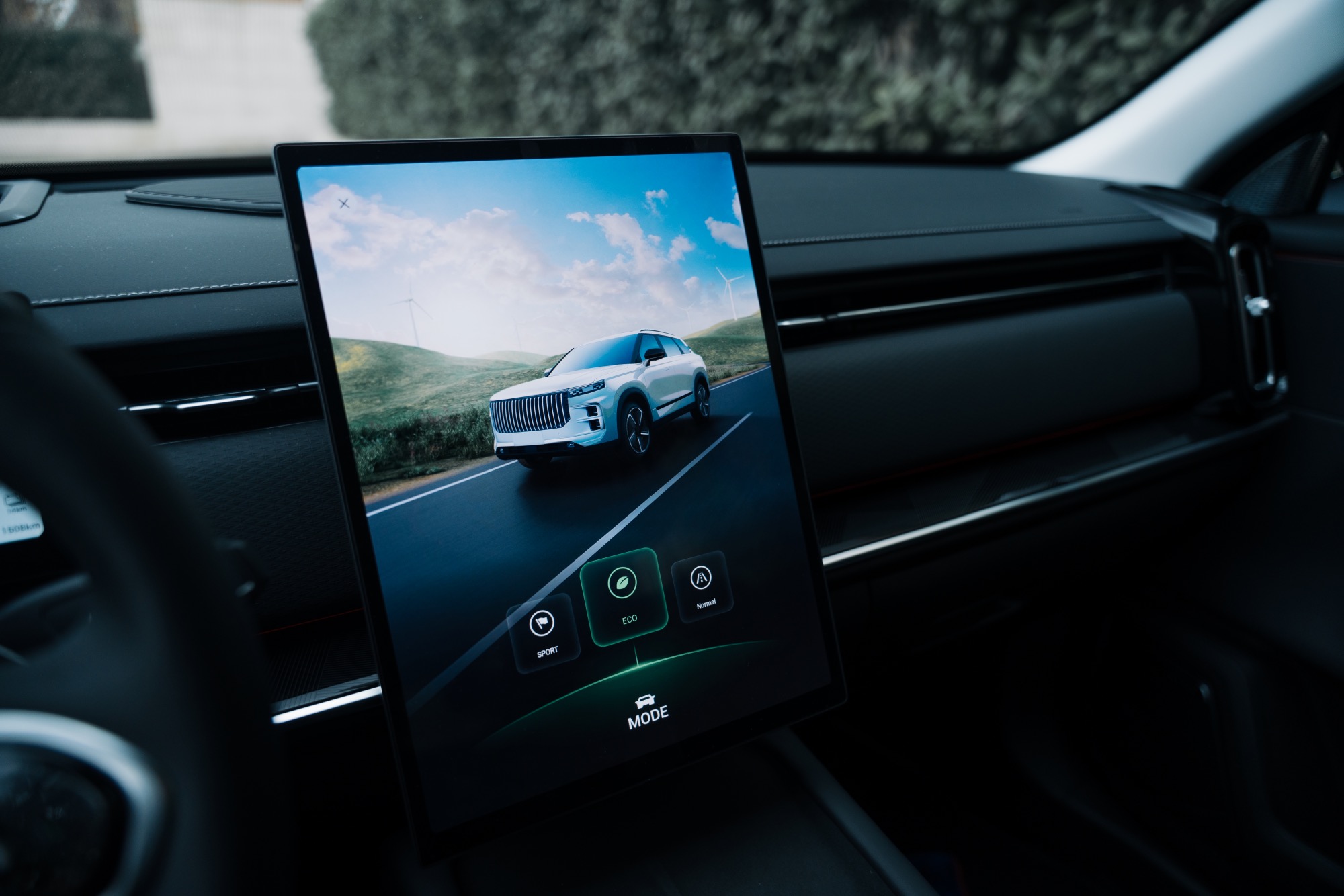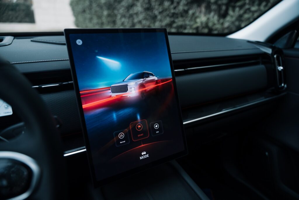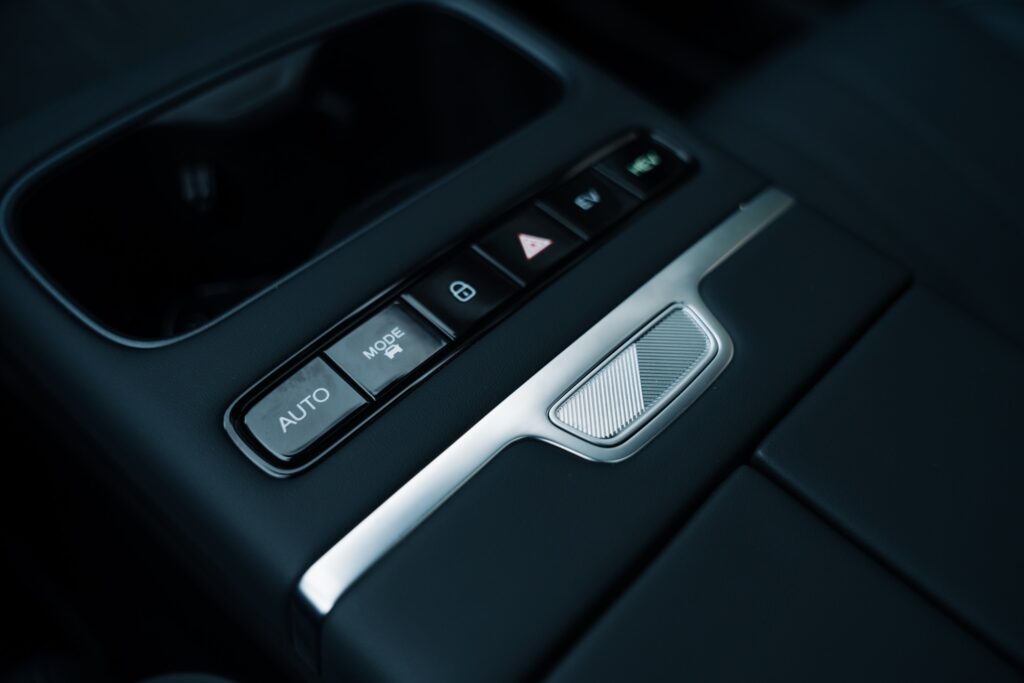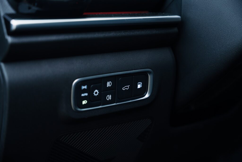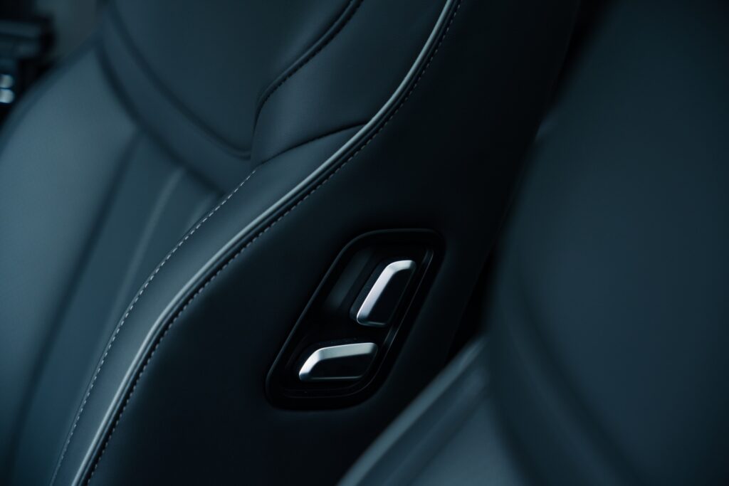 Prizele de aer verticale au inserții cromate și aduc aminte de elemente pe care le-am mai văzut pe modele Volvo. Pe bord avem și cusături vizibile și materiale plăcute la atingere, plus iluminat ambiental într-o gamă largă de culori. Pe consola central avem două spații pentru depozitarea telefoanelor mobile finisate cu un material moale ce amintește de Alcantara. Spațiul de pe partea șoferului oferă și încărcare prin inducție și este și ventilat pentru răcirea telefonului în timpul încărcării.