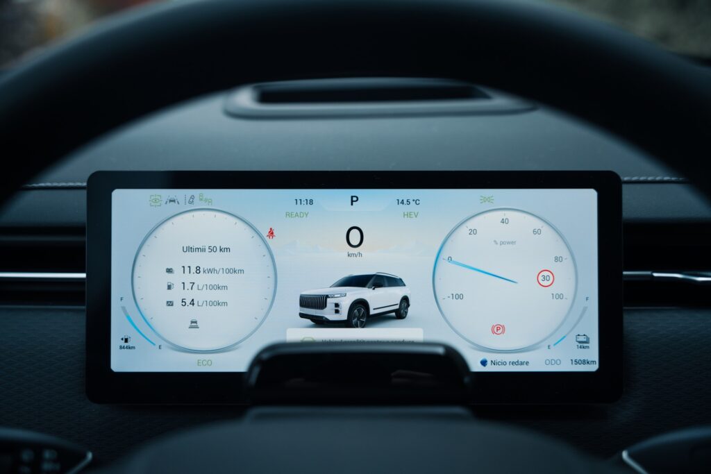 Computerul de bord al modelului din China folosește un mod specific de a indica consumul mediu doar pe ultimii 50 km parcurși. Am mai întâlnit acest sistem și la modelele BYD. Pentru Jaecoo 7 SHS, consumul mediu urban, cu bateria consumată, sau dacă alegem să mergem în mod hybrid variază între 5 și 5,7 litri.