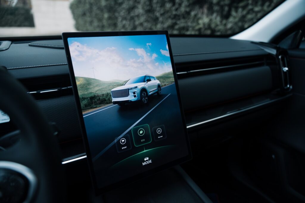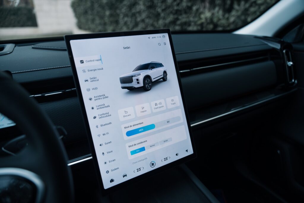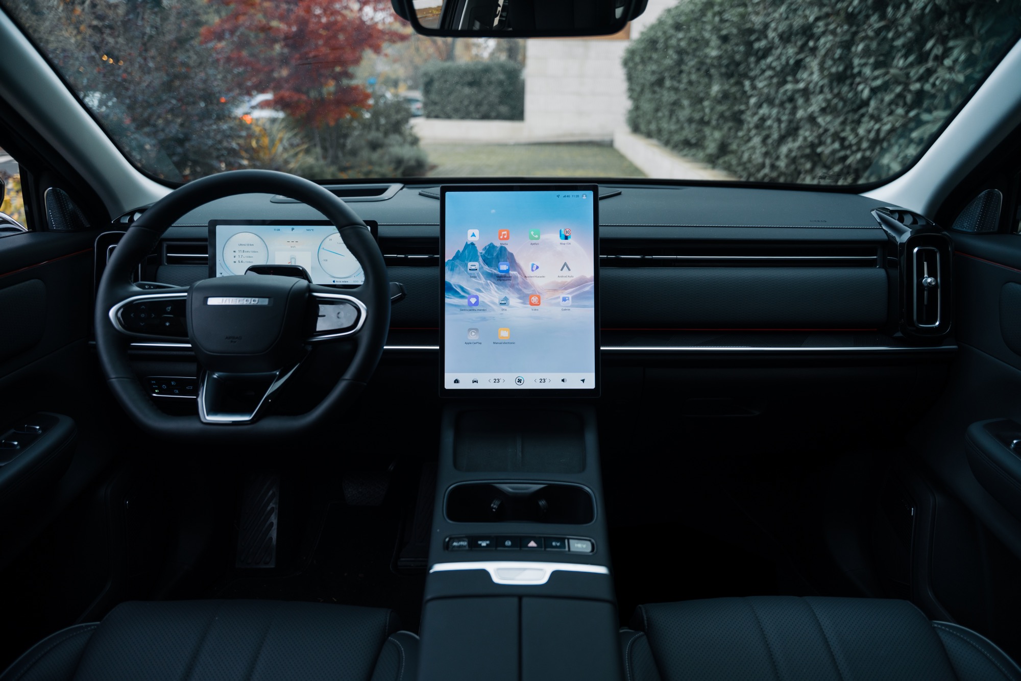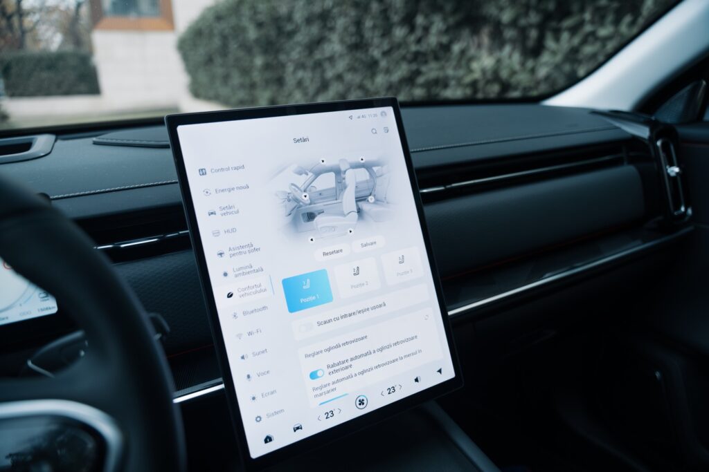 Jaecoo, ca multe alte mărci din China, preferă să ofere automobile inspirate de rețeta Tesla. Interioare minimaliste cu cât mai puține butoane fizice, ecrane mari și toate comenzile integrate în meniul accesat prin intermediul ecranului principal. Cum spuneam, în cazul lui Jaecoo 7 este un display flotant de 14,8 inchi așezat în poziție portret. Grafica este foarte bună, nu exista lag, dar ai nevoie de timp să te familiarizezi cu tot meniul și unde sunt comenzile necesare. Avem și un meniu de scurtături care apare dacă trecem cu degetul de sus în jos pe ecran. Exact ca la un smartphone. Putem pune aici un shortcut către reglajul oglinzilor, de exemplu, ca să nu mai stăm să răscolim prin meniuri.