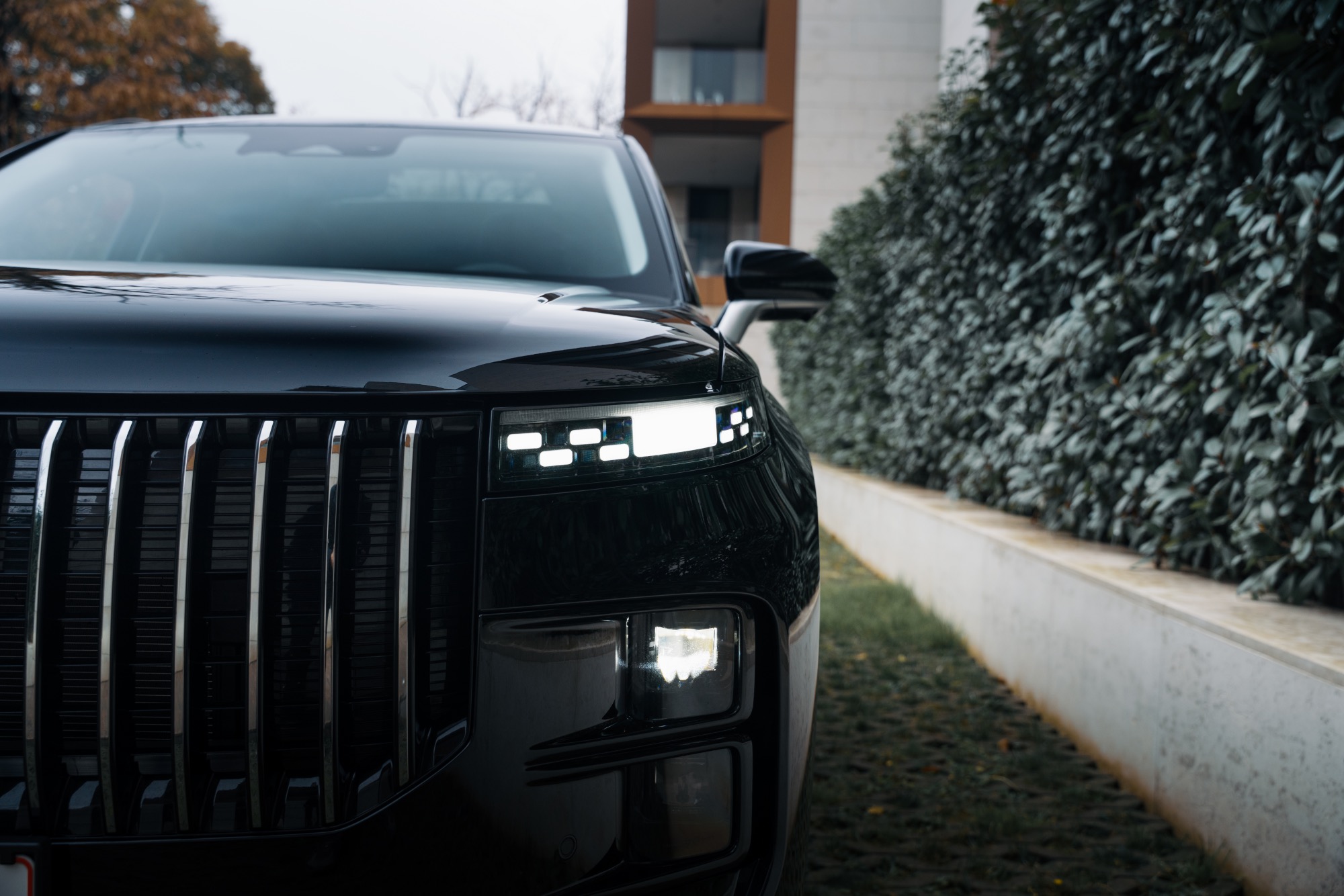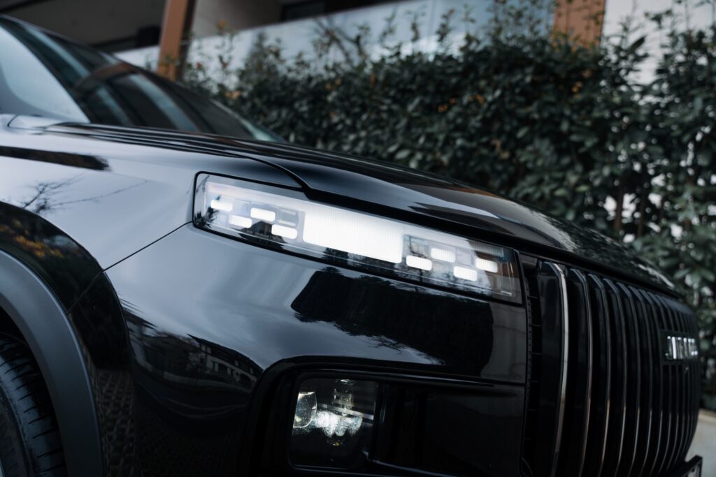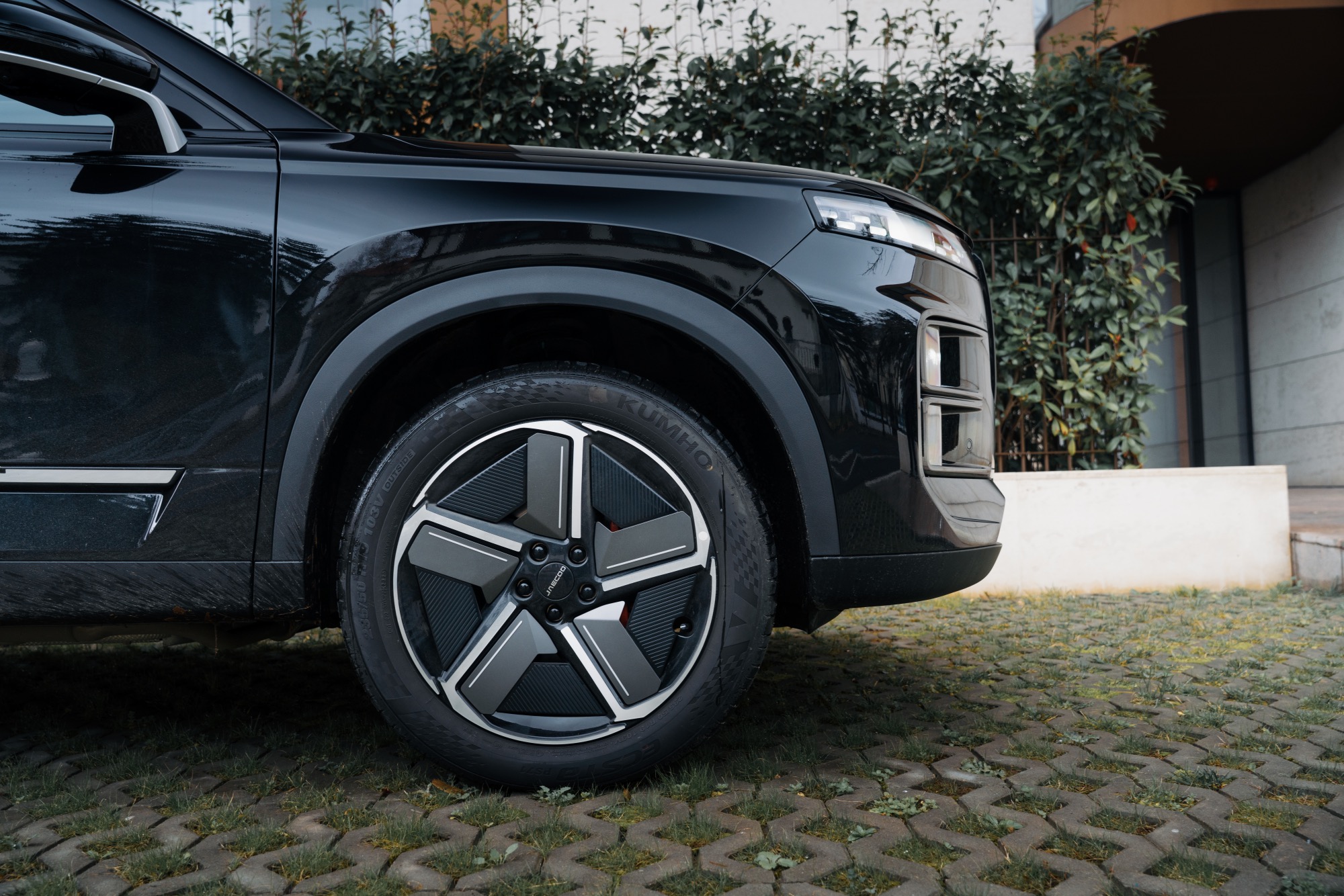 Dintre toate automobilele venite din China în ultima vreme, Jaecoo 7 are ceva personalitate dată de designul exterior, cu ceva elemente inspirate de modele ca Range Rover Velar sau Evoque. Grila impozantă atrage atenția, și la fel și sigla mărcii. Aceasta din urmă este, de fapt, denumirea Jaecoo scrisă cu un font desprins parcă dintr-un film SF din anii ’80. Grila este încadrată de lumini de zi înguste cu o semnătură luminoasă specifică. Blocurile optice propriu-zise sunt ascunse mai jos, iar în spate avem deja foarte comuna dungă LED pe toată lungimea hayonului.