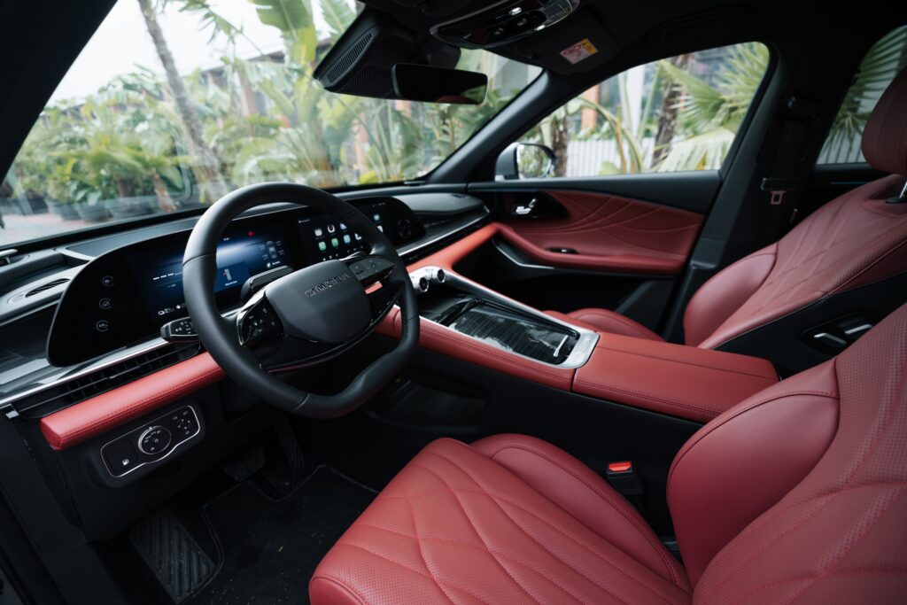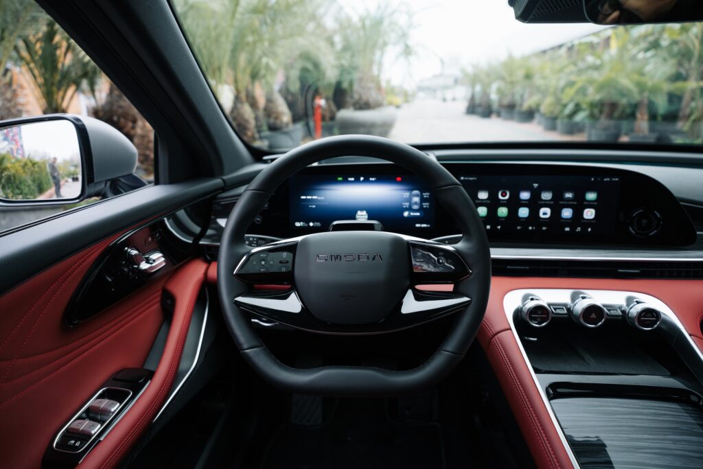 Nu exagerez cu nimic, în clipa în care am deschis portiera am fost izbit de un parfum de Mercedes-Benz. Da, cred că ar fi un concurs interesant ghicitul mașinilor după mirosul interiorului. Nu știu cum, nu știu de ce, dar interiorul lui Omoda 9 SHS abundă de repere cunoscute de la constructorul german până la nivelul în care ai putea fi tentat să crezi că ești într-un model cu stea pe capotă. Este rău? Nu, doar că partea cu autenticitatea parcă are de suferit. Acum, dacă este să mă împiedic de puțină sinceritate, parcă celor de la Omoda le iese mai bine pe alocuri decât germanilor.