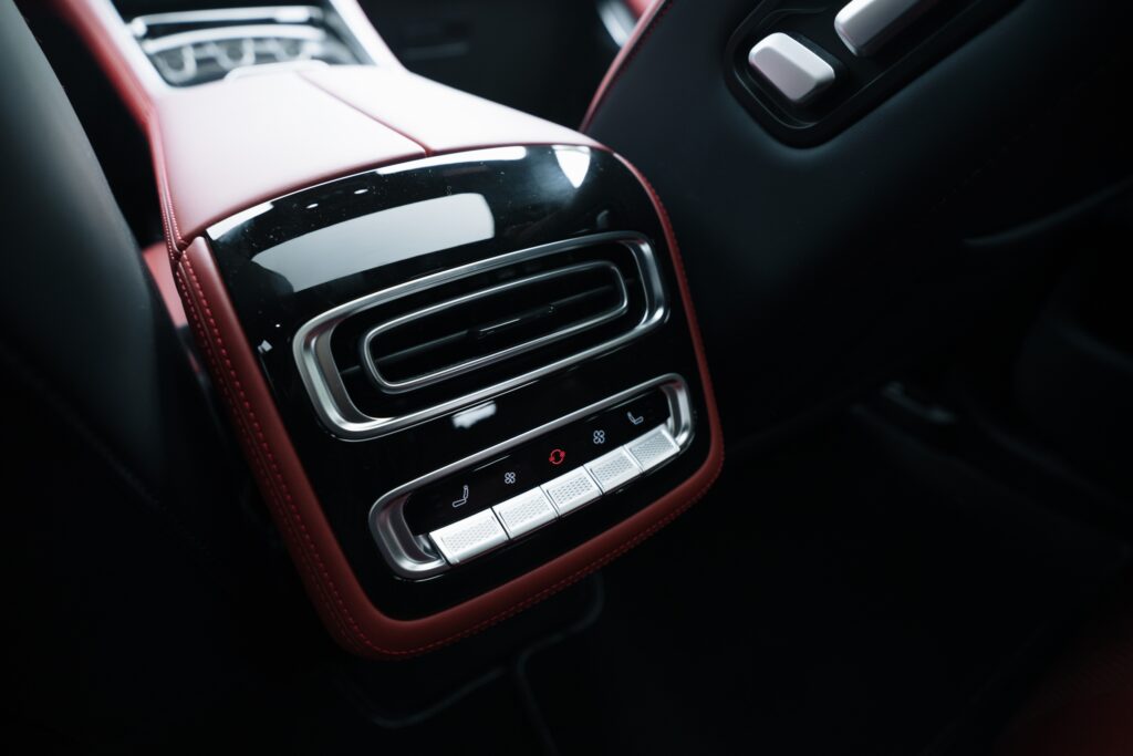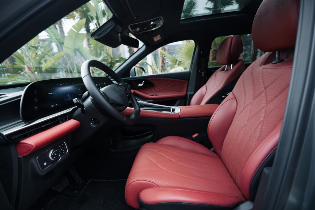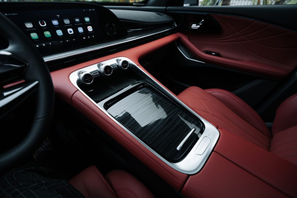 Clasic deja, conectivitatea pentru Apple CarPlay sau Android Auto se realizează via USB A sau wireless. Pe de altă parte, minimalismul și eleganța locurilor față este în concordanță cu mesajul premium al modelului. Mai pot adăuga spațiul refrigerat din spațiul de depozitare din cotiera centrală. Apropo de răcire, salut faptul că zona de încărcare wireless a telefonului (livrează până la 50W) este prevăzută cu fante pentru răcirea terminalului.