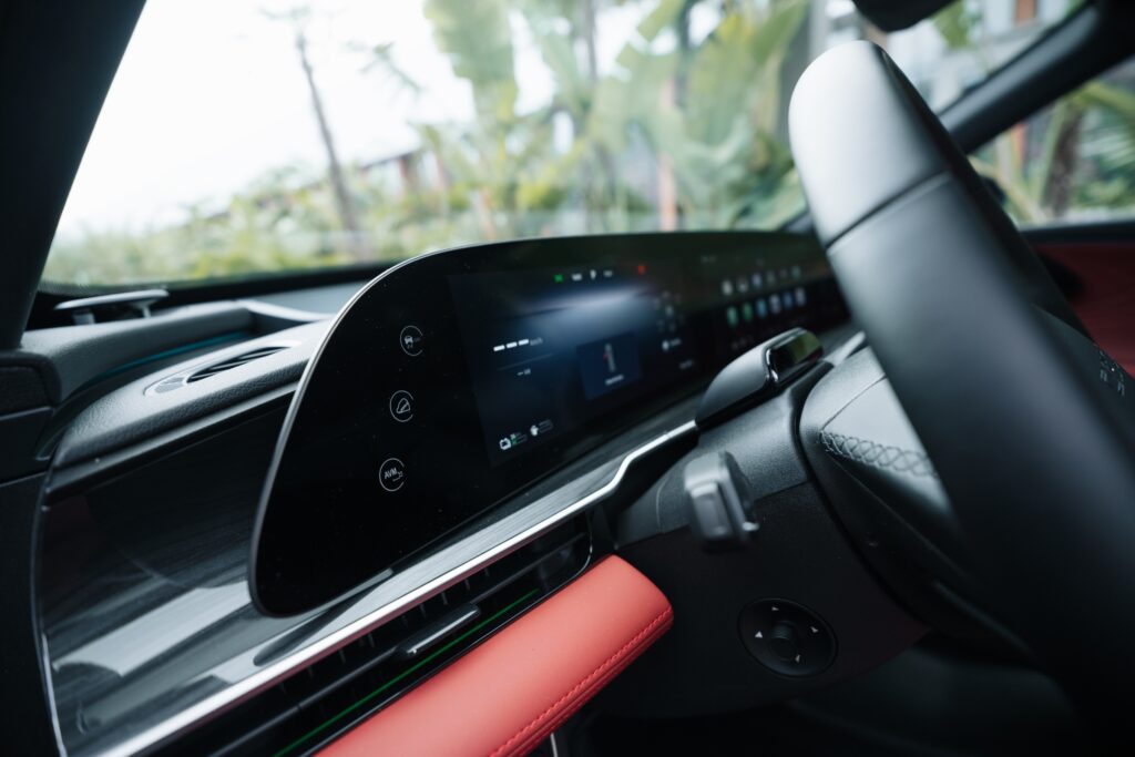 În primul rând apreciez faptul că cele două display-uri de 12.3 inch sunt integrate într-o formă curbată care se integrează armonios în linia planșei de bord, și că nu mai avem în față o soluție relativ ieftină sub forma unui display dreptunghiular plantat în mijlocul planșei de bord. Avem o formă în oglindă, dacă o pot defini astfel – trei comenzi tactile și un display de 12.3 inch, iar apoi alt display de 12.3 inch și trei comenzi tactile. Salut faptul că pasagerul din față are dedicate comenzi pentru reglarea volumului. Sistemul audio este semnat de Sony și oferă performanțe bune. Un plus pentru difuzoarele audio integrate în tetierele față (câte două în fiecare) care îți permit o audiție la un volum redus al sistemului audio, putând astfel genera o ambianță în care să se poată dormi pe locurile din spate.