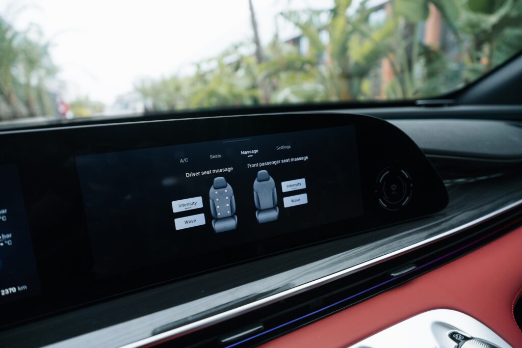 Puțin lipsită de ergonomie interfața sistemului infotainment. Spre exemplu, există pictograme care îmi oferă acces direct la funcții precum update pentru sistemul de operare sau al hârții sistemului de navigație, dar funcțiile de confort (AC, masaj scaune, încălzire/ventilație scaune și setări) sunt într-un meniu cu patru ferestre distincte. Nu m-ar fi deranjat să fie invers, să am acces direct la setări precum masaj și să regăsesc undeva într-un submeniu opțiunile de update.